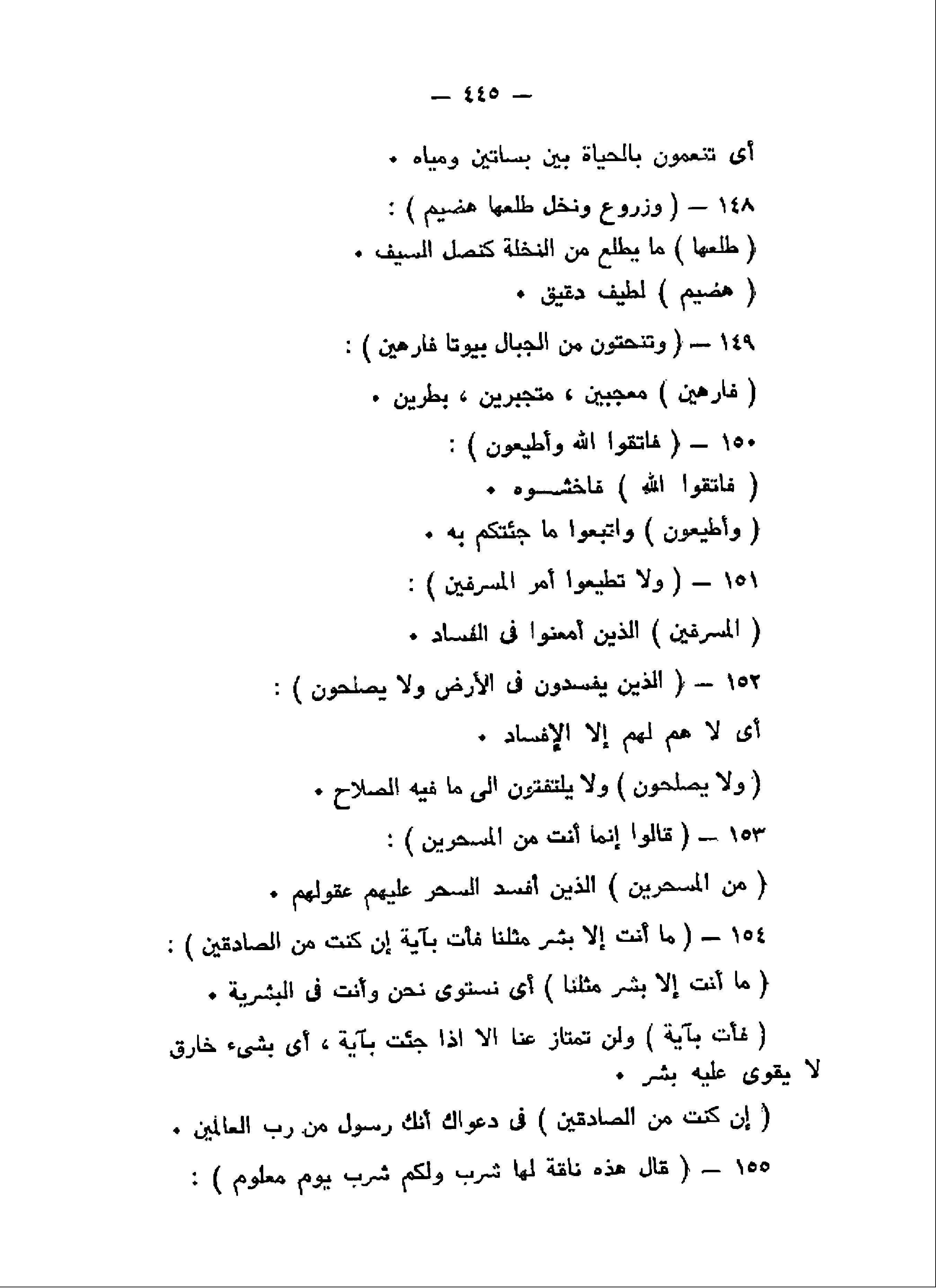 وَزُرُوعٍ وَنَخْلٍ طَلْعُها هَضِيمٌ (148) وَتَنْحِتُونَ مِنَ الْجِبالِ بُيُوتاً فارِهِينَ (149) فَاتَّقُوا اللَّهَ وَأَطِيعُونِ (150) وَلا تُطِيعُوا أَمْرَ الْمُسْرِفِينَ (151) الَّذِينَ يُفْسِدُونَ فِي الْأَرْضِ وَلا يُصْلِحُونَ (152)