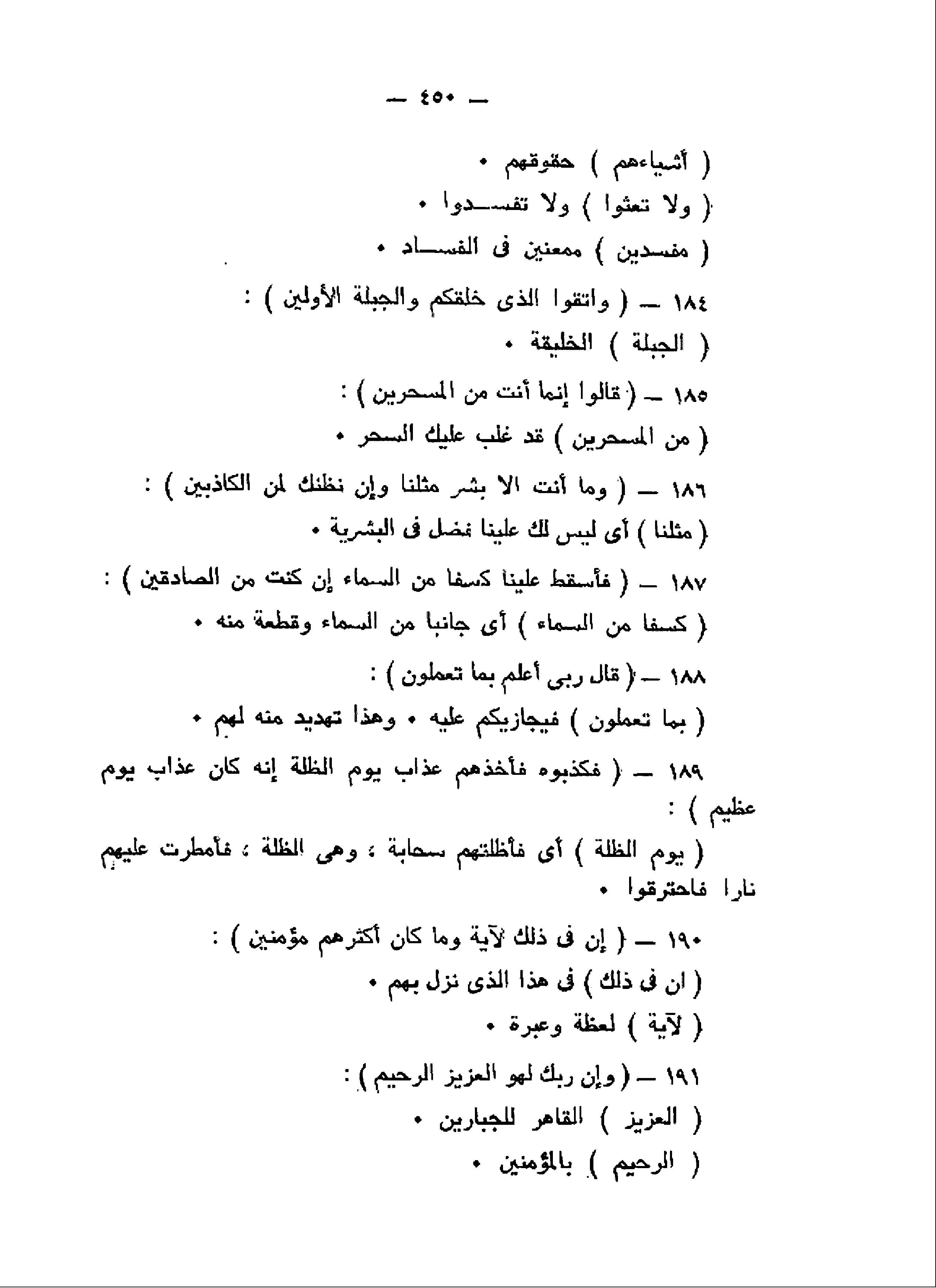 وَاتَّقُوا الَّذِي خَلَقَكُمْ وَالْجِبِلَّةَ الْأَوَّلِينَ (184) قالُوا إِنَّما أَنْتَ مِنَ الْمُسَحَّرِينَ (185) وَما أَنْتَ إِلاَّ بَشَرٌ مِثْلُنا وَإِنْ نَظُنُّكَ لَمِنَ الْكاذِبِينَ (186) فَأَسْقِطْ عَلَيْنا كِسَفاً مِنَ السَّماءِ إِنْ كُنْتَ مِنَ الصَّادِقِينَ (187) قالَ رَبِّي أَعْلَمُ بِما تَعْمَلُونَ (188)