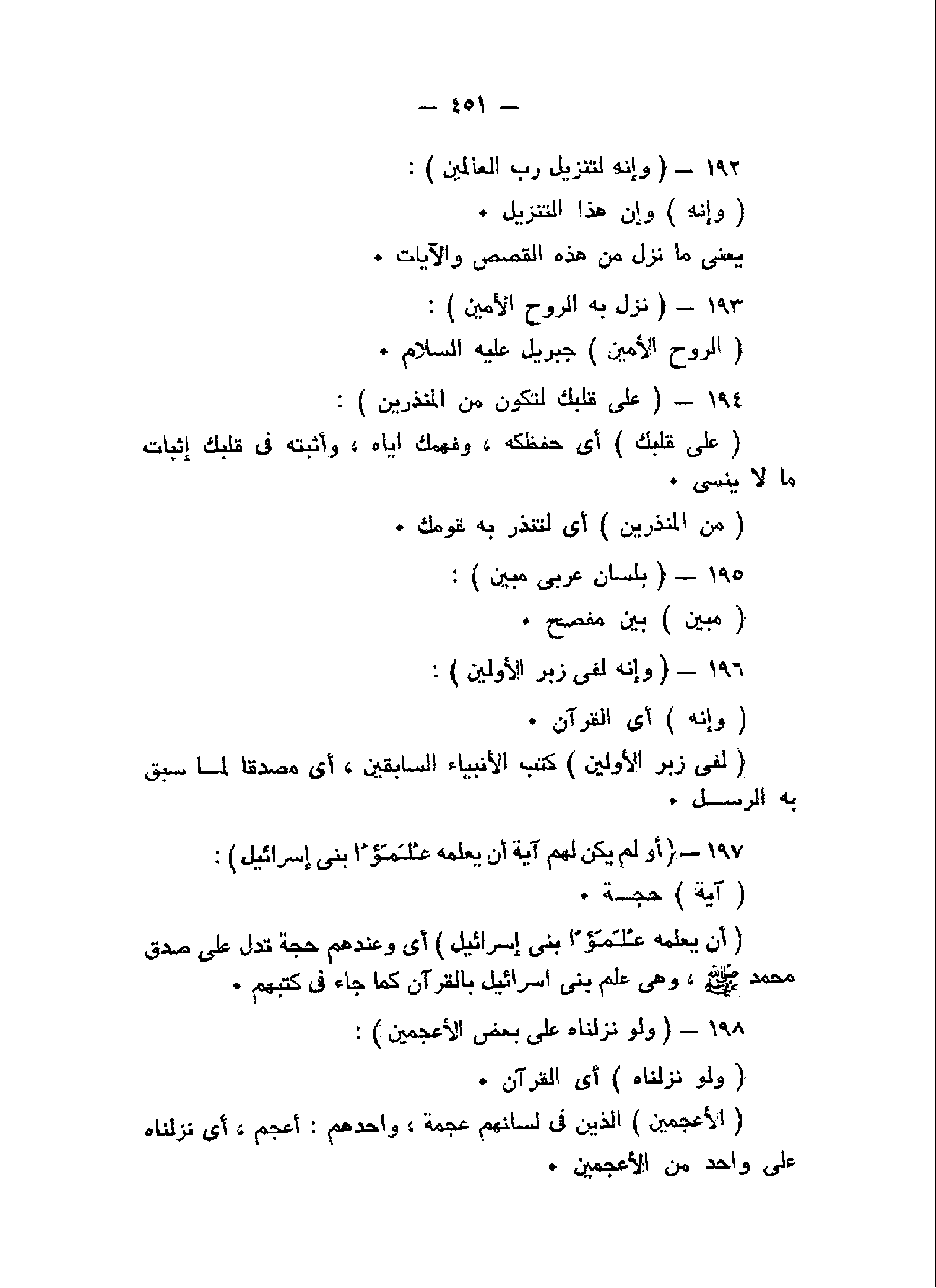وَإِنَّهُ لَتَنْزِيلُ رَبِّ الْعالَمِينَ (192) نَزَلَ بِهِ الرُّوحُ الْأَمِينُ (193) عَلى قَلْبِكَ لِتَكُونَ مِنَ الْمُنْذِرِينَ (194) بِلِسانٍ عَرَبِيٍّ مُبِينٍ (195) وَإِنَّهُ لَفِي زُبُرِ الْأَوَّلِينَ (196)
