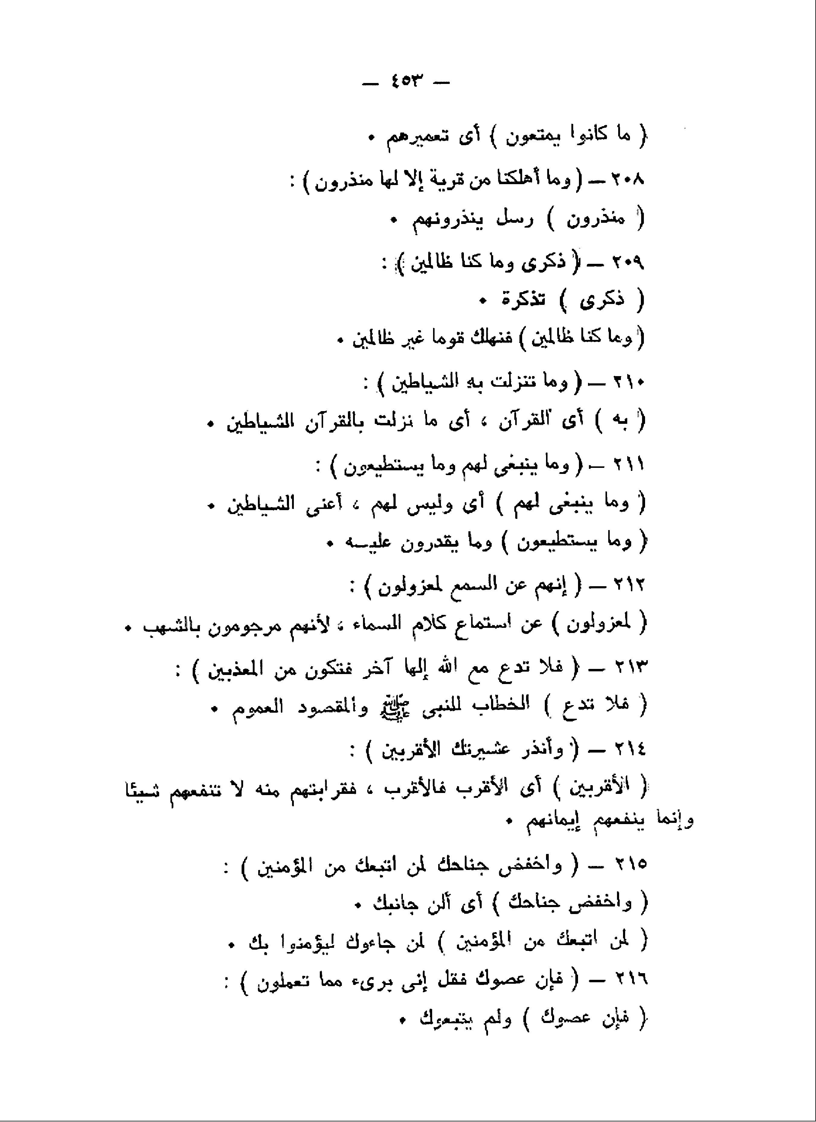 وَما أَهْلَكْنا مِنْ قَرْيَةٍ إِلاَّ لَها مُنْذِرُونَ (208) ذِكْرى وَما كُنَّا ظالِمِينَ (209) وَما تَنَزَّلَتْ بِهِ الشَّياطِينُ (210) وَما يَنْبَغِي لَهُمْ وَما يَسْتَطِيعُونَ (211) إِنَّهُمْ عَنِ السَّمْعِ لَمَعْزُولُونَ (212)