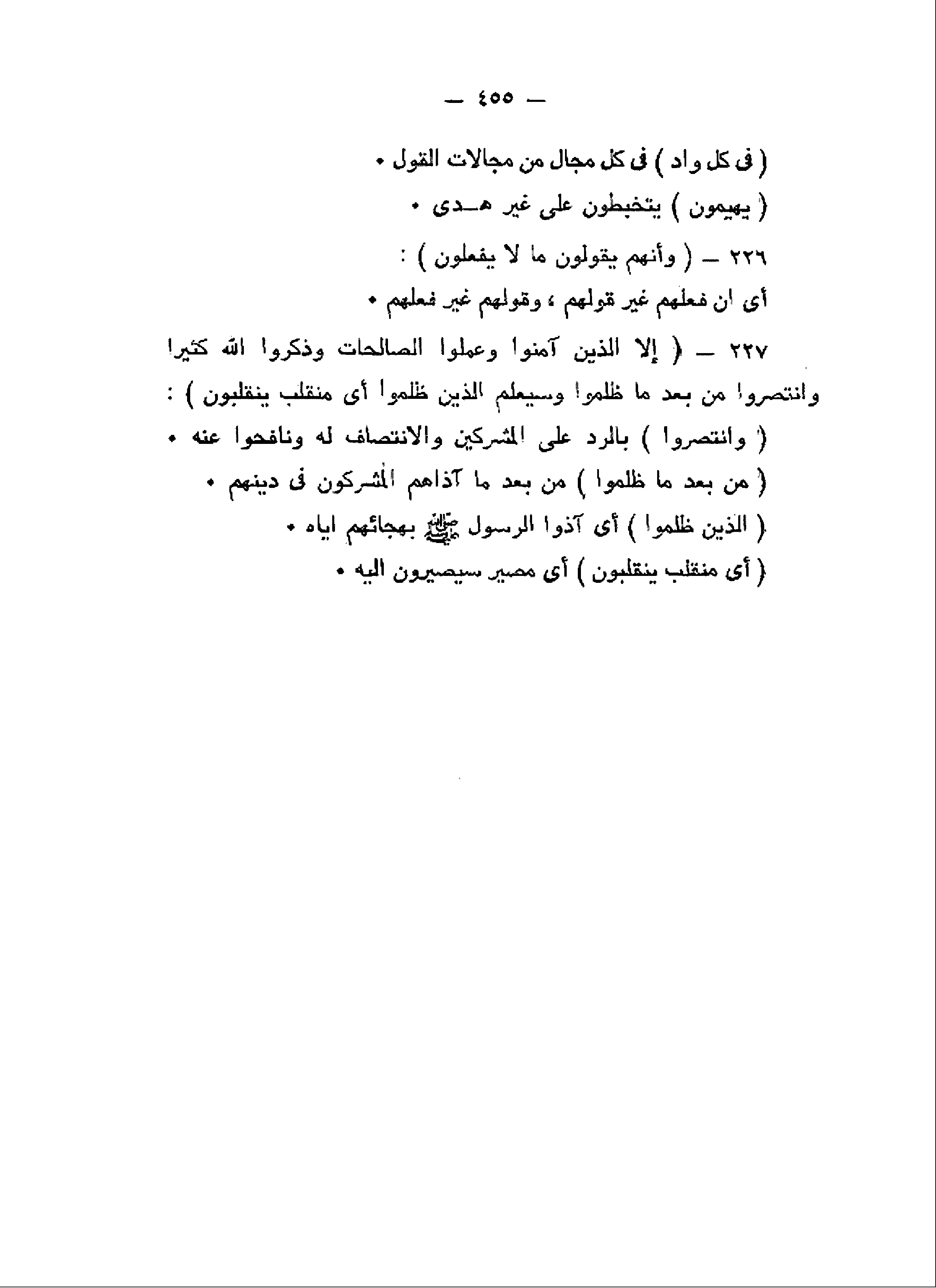 وَأَنَّهُمْ يَقُولُونَ ما لا يَفْعَلُونَ (226) إِلاَّ الَّذِينَ آمَنُوا وَعَمِلُوا الصَّالِحاتِ وَذَكَرُوا اللَّهَ كَثِيراً وَانْتَصَرُوا مِنْ بَعْدِ ما ظُلِمُوا وَسَيَعْلَمُ الَّذِينَ ظَلَمُوا أَيَّ مُنْقَلَبٍ يَنْقَلِبُونَ (227)
