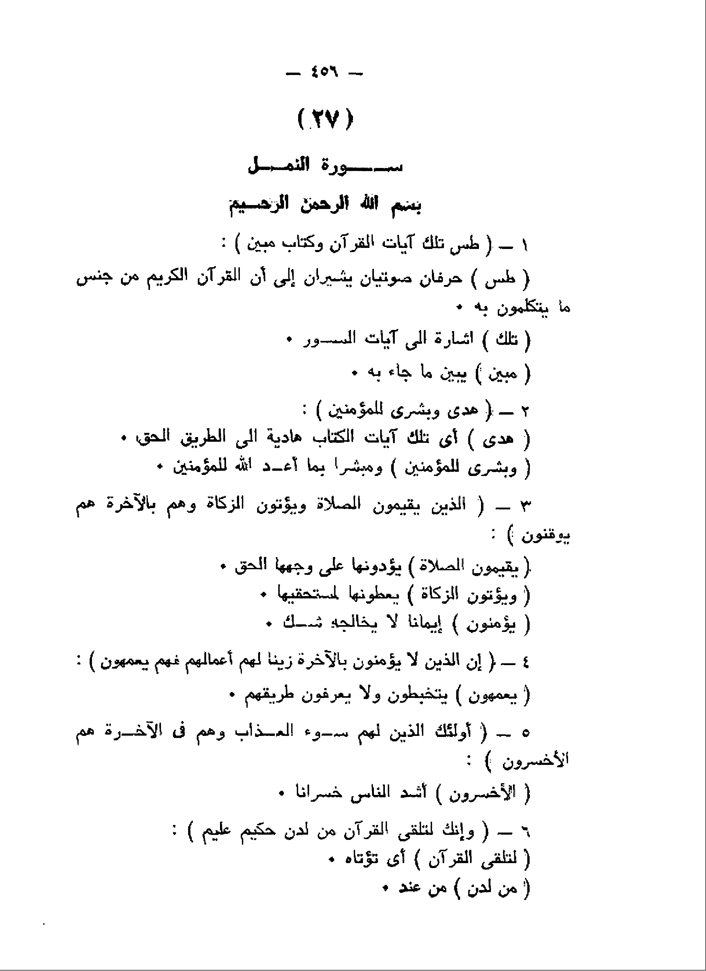 طس تِلْكَ آياتُ الْقُرْآنِ وَكِتابٍ مُبِينٍ (1) هُدىً وَبُشْرى لِلْمُؤْمِنِينَ (2) الَّذِينَ يُقِيمُونَ الصَّلاةَ وَيُؤْتُونَ الزَّكاةَ وَهُمْ بِالْآخِرَةِ هُمْ يُوقِنُونَ (3) إِنَّ الَّذِينَ لا يُؤْمِنُونَ بِالْآخِرَةِ زَيَّنَّا لَهُمْ أَعْمالَهُمْ فَهُمْ يَعْمَهُونَ (4)