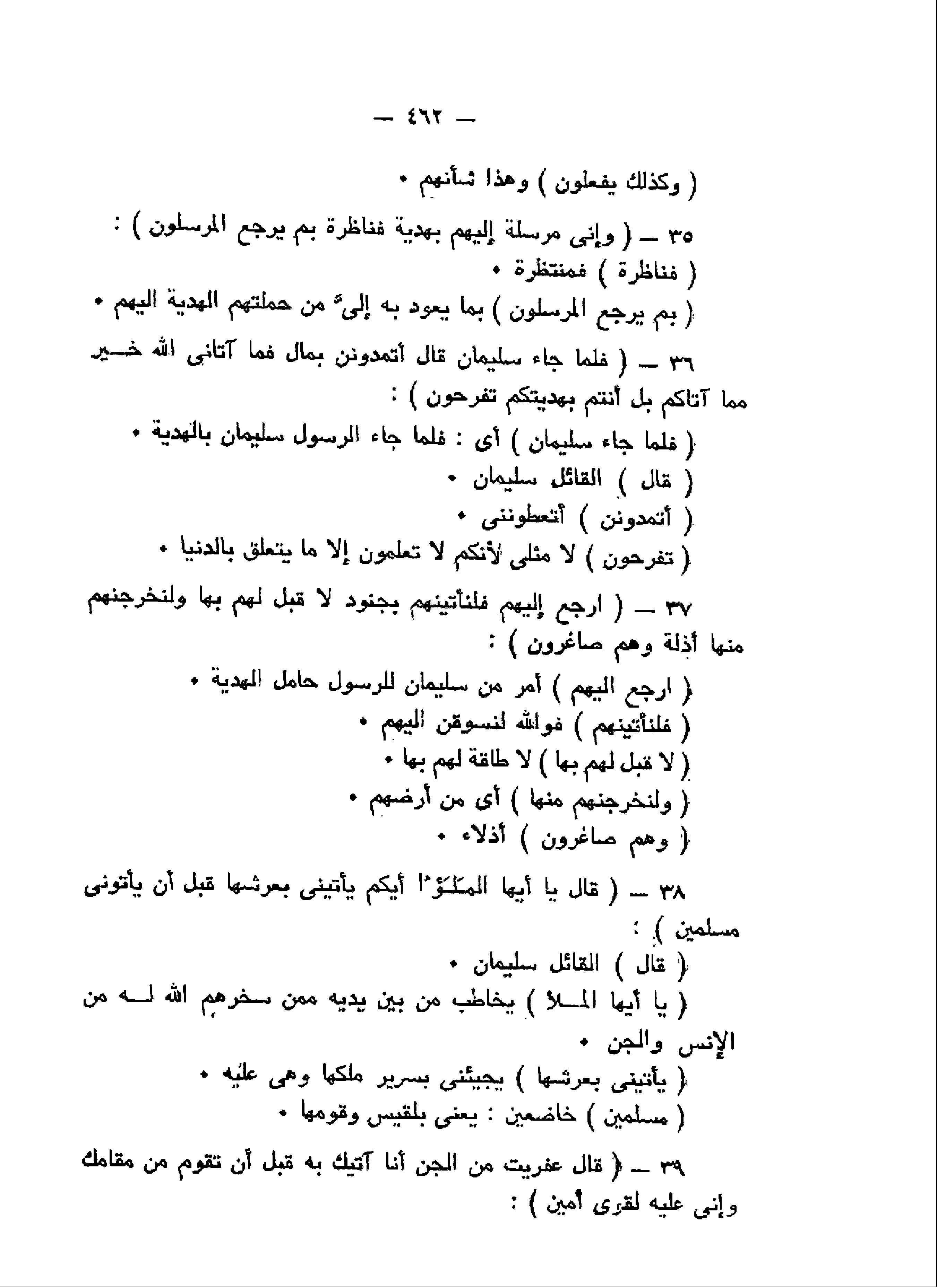 وَإِنِّي مُرْسِلَةٌ إِلَيْهِمْ بِهَدِيَّةٍ فَناظِرَةٌ بِمَ يَرْجِعُ الْمُرْسَلُونَ (35) فَلَمَّا جاءَ سُلَيْمانَ قالَ أَتُمِدُّونَنِ بِمالٍ فَما آتانِيَ اللَّهُ خَيْرٌ مِمَّا آتاكُمْ بَلْ أَنْتُمْ بِهَدِيَّتِكُمْ تَفْرَحُونَ (36) ارْجِعْ إِلَيْهِمْ فَلَنَأْتِيَنَّهُمْ بِجُنُودٍ لا قِبَلَ لَهُمْ بِها وَلَنُخْرِجَنَّهُمْ مِنْها أَذِلَّةً وَهُمْ صاغِرُونَ (37) قالَ يا أَيُّهَا الْمَلَؤُا أَيُّكُمْ يَأْتِينِي بِعَرْشِها قَبْلَ أَنْ يَأْتُونِي مُسْلِمِينَ (38) قالَ عِفْرِيتٌ مِنَ الْجِنِّ أَنَا آتِيكَ بِهِ قَبْلَ أَنْ تَقُومَ مِنْ مَقامِكَ وَإِنِّي عَلَيْهِ لَقَوِيٌّ أَمِينٌ (39)