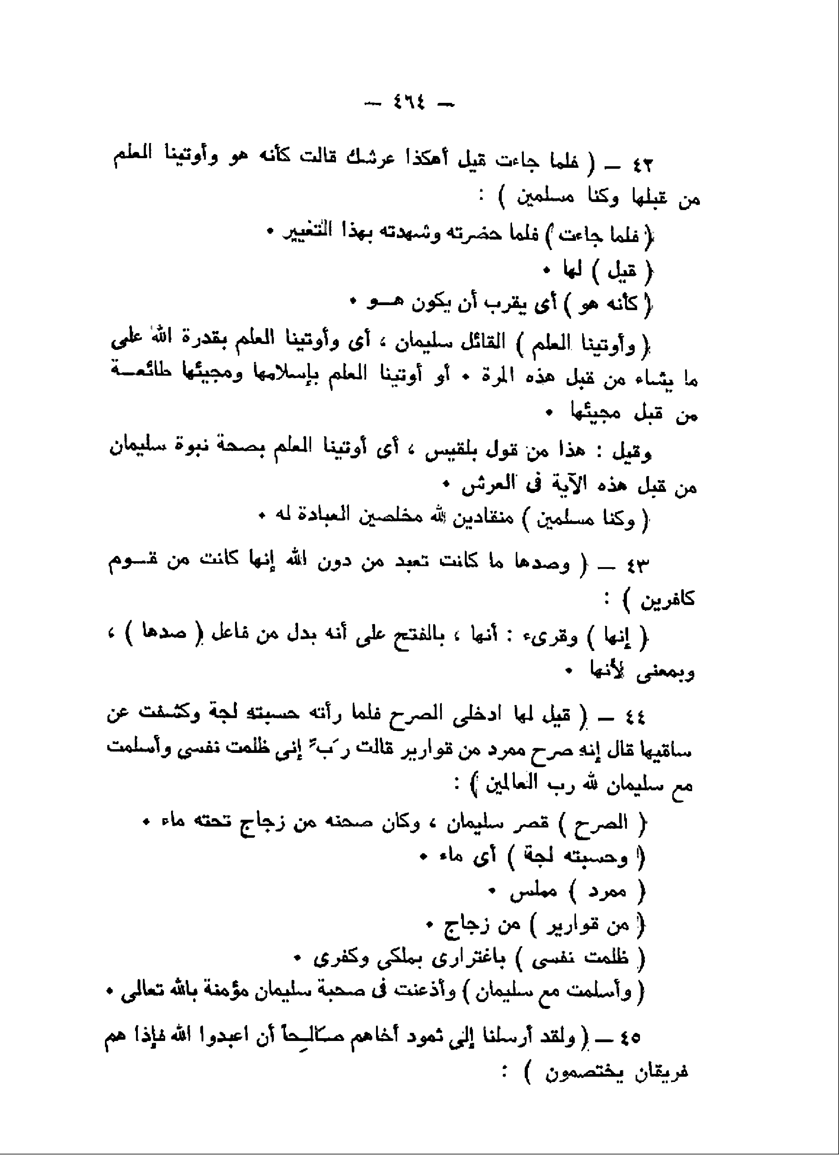 فَلَمَّا جاءَتْ قِيلَ أَهكَذا عَرْشُكِ قالَتْ كَأَنَّهُ هُوَ وَأُوتِينَا الْعِلْمَ مِنْ قَبْلِها وَكُنَّا مُسْلِمِينَ (42) وَصَدَّها ما كانَتْ تَعْبُدُ مِنْ دُونِ اللَّهِ إِنَّها كانَتْ مِنْ قَوْمٍ كافِرِينَ (43) قِيلَ لَهَا ادْخُلِي الصَّرْحَ فَلَمَّا رَأَتْهُ حَسِبَتْهُ لُجَّةً وَكَشَفَتْ عَنْ ساقَيْها قالَ إِنَّهُ صَرْحٌ مُمَرَّدٌ مِنْ قَوارِيرَ قالَتْ رَبِّ إِنِّي ظَلَمْتُ نَفْسِي وَأَسْلَمْتُ مَعَ سُلَيْمانَ لِلَّهِ رَبِّ الْعالَمِينَ (44) وَلَقَدْ أَرْسَلْنا إِلى ثَمُودَ أَخاهُمْ صالِحاً أَنِ اعْبُدُوا اللَّهَ فَإِذا هُمْ فَرِيقانِ يَخْتَصِمُونَ (45)