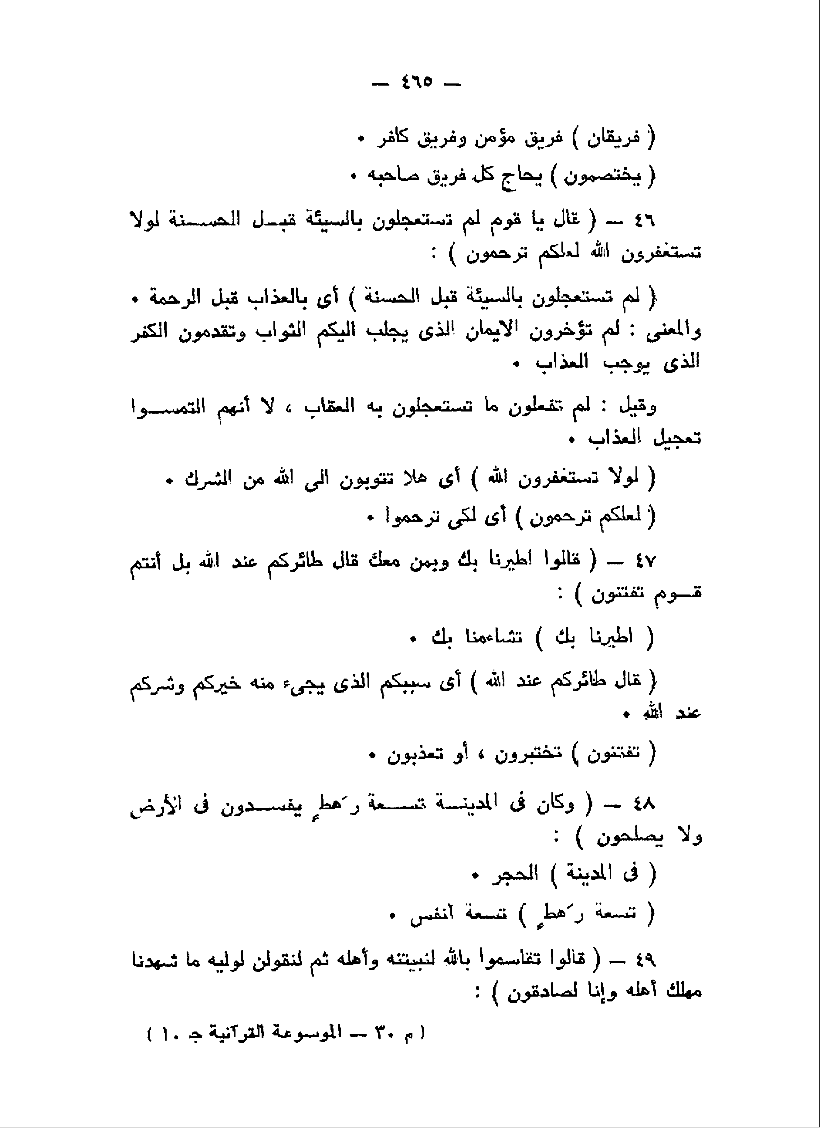 قالَ يا قَوْمِ لِمَ تَسْتَعْجِلُونَ بِالسَّيِّئَةِ قَبْلَ الْحَسَنَةِ لَوْلا تَسْتَغْفِرُونَ اللَّهَ لَعَلَّكُمْ تُرْحَمُونَ (46) قالُوا اطَّيَّرْنا بِكَ وَبِمَنْ مَعَكَ قالَ طائِرُكُمْ عِنْدَ اللَّهِ بَلْ أَنْتُمْ قَوْمٌ تُفْتَنُونَ (47) وَكانَ فِي الْمَدِينَةِ تِسْعَةُ رَهْطٍ يُفْسِدُونَ فِي الْأَرْضِ وَلا يُصْلِحُونَ (48) قالُوا تَقاسَمُوا بِاللَّهِ لَنُبَيِّتَنَّهُ وَأَهْلَهُ ثُمَّ لَنَقُولَنَّ لِوَلِيِّهِ ما شَهِدْنا مَهْلِكَ أَهْلِهِ وَإِنَّا لَصادِقُونَ (49)
