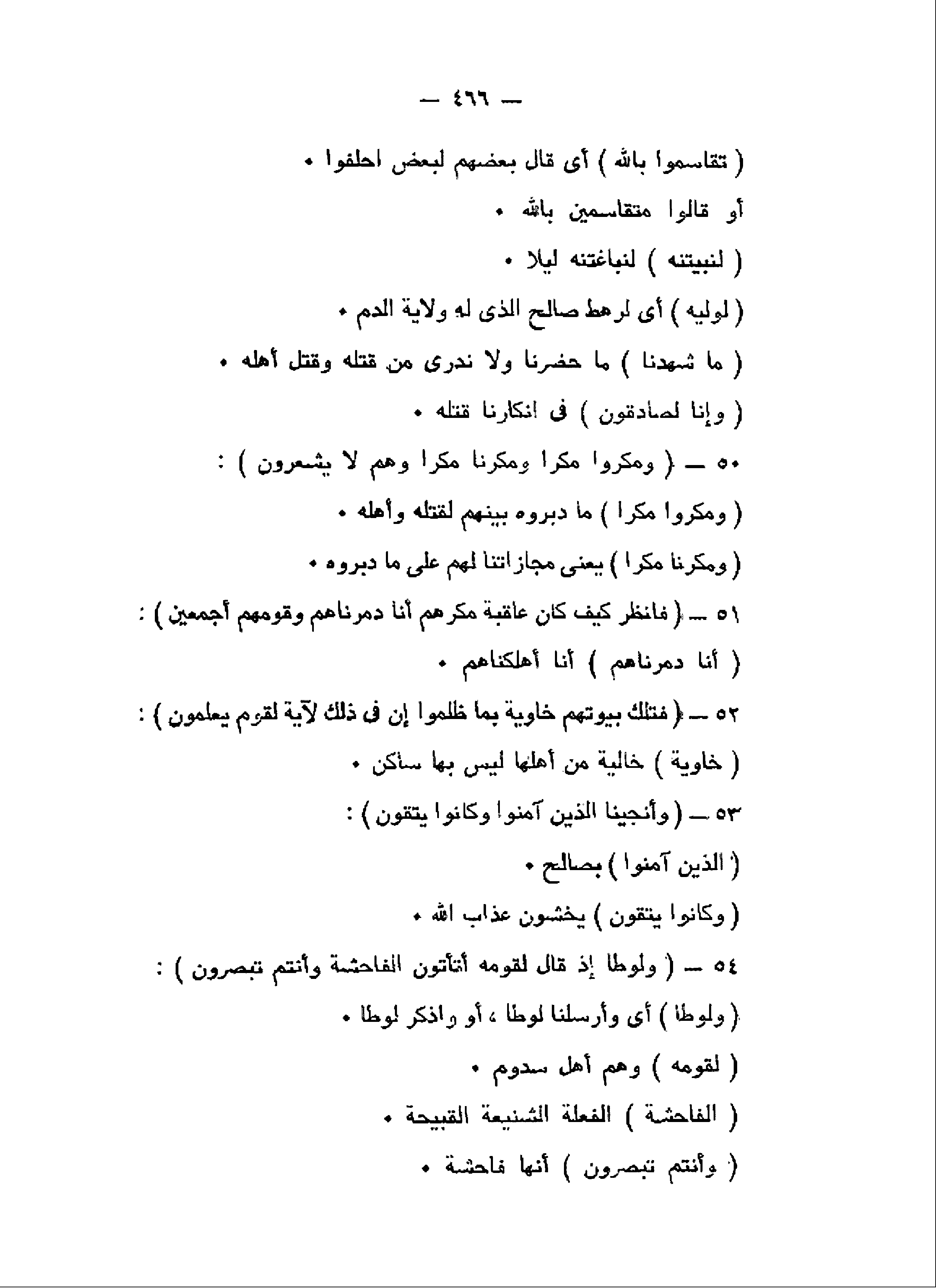 وَمَكَرُوا مَكْراً وَمَكَرْنا مَكْراً وَهُمْ لا يَشْعُرُونَ (50) فَانْظُرْ كَيْفَ كانَ عاقِبَةُ مَكْرِهِمْ أَنَّا دَمَّرْناهُمْ وَقَوْمَهُمْ أَجْمَعِينَ (51) فَتِلْكَ بُيُوتُهُمْ خاوِيَةً بِما ظَلَمُوا إِنَّ فِي ذلِكَ لَآيَةً لِقَوْمٍ يَعْلَمُونَ (52) وَأَنْجَيْنَا الَّذِينَ آمَنُوا وَكانُوا يَتَّقُونَ (53) وَلُوطاً إِذْ قالَ لِقَوْمِهِ أَتَأْتُونَ الْفاحِشَةَ وَأَنْتُمْ تُبْصِرُونَ (54)