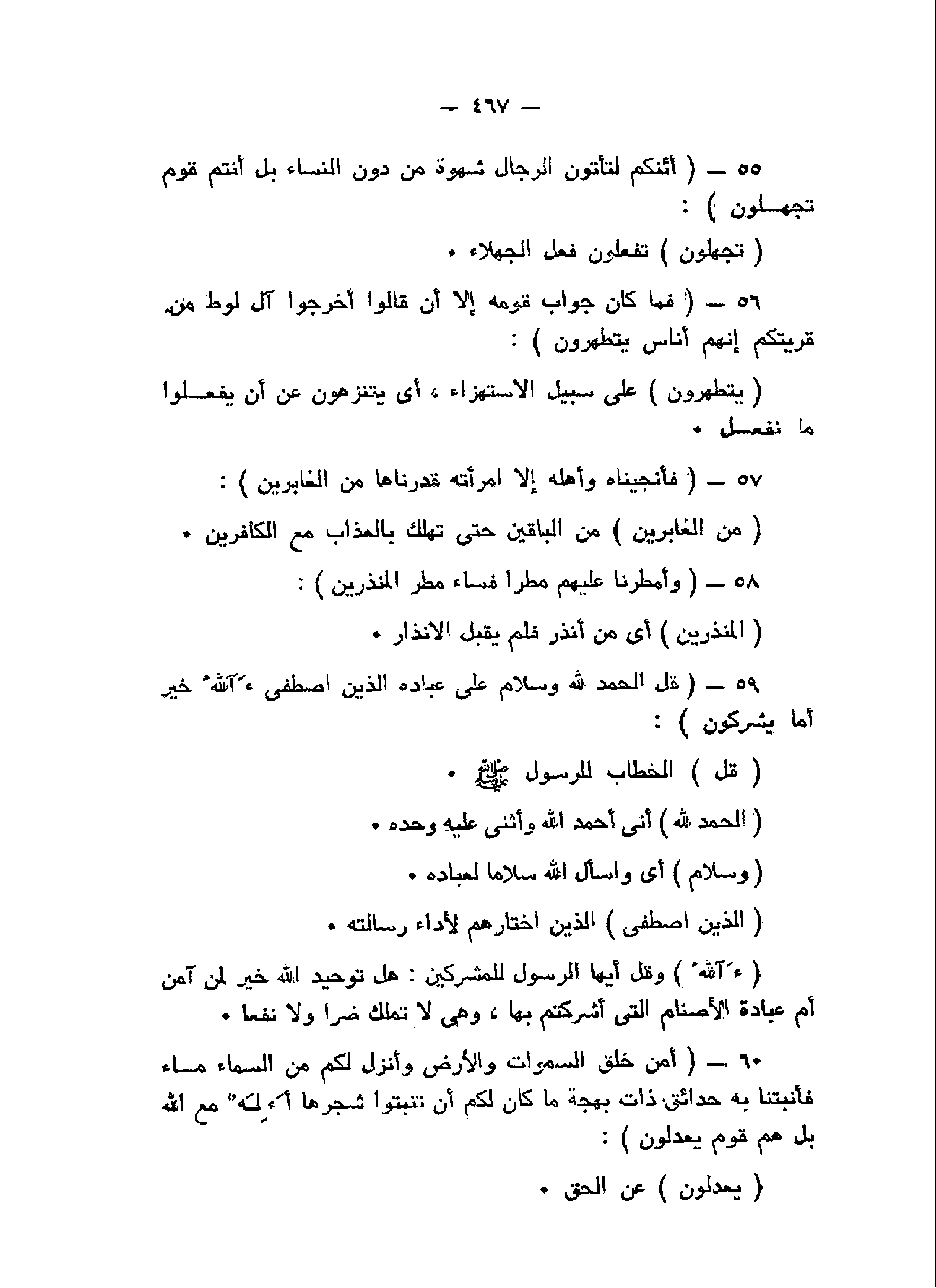 أَإِنَّكُمْ لَتَأْتُونَ الرِّجالَ شَهْوَةً مِنْ دُونِ النِّساءِ بَلْ أَنْتُمْ قَوْمٌ تَجْهَلُونَ (55) فَما كانَ جَوابَ قَوْمِهِ إِلاَّ أَنْ قالُوا أَخْرِجُوا آلَ لُوطٍ مِنْ قَرْيَتِكُمْ إِنَّهُمْ أُناسٌ يَتَطَهَّرُونَ (56) فَأَنْجَيْناهُ وَأَهْلَهُ إِلاَّ امْرَأَتَهُ قَدَّرْناها مِنَ الْغابِرِينَ (57) وَأَمْطَرْنا عَلَيْهِمْ مَطَراً فَساءَ مَطَرُ الْمُنْذَرِينَ (58) قُلِ الْحَمْدُ لِلَّهِ وَسَلامٌ عَلى عِبادِهِ الَّذِينَ اصْطَفى آللَّهُ خَيْرٌ أَمَّا يُشْرِكُونَ (59)