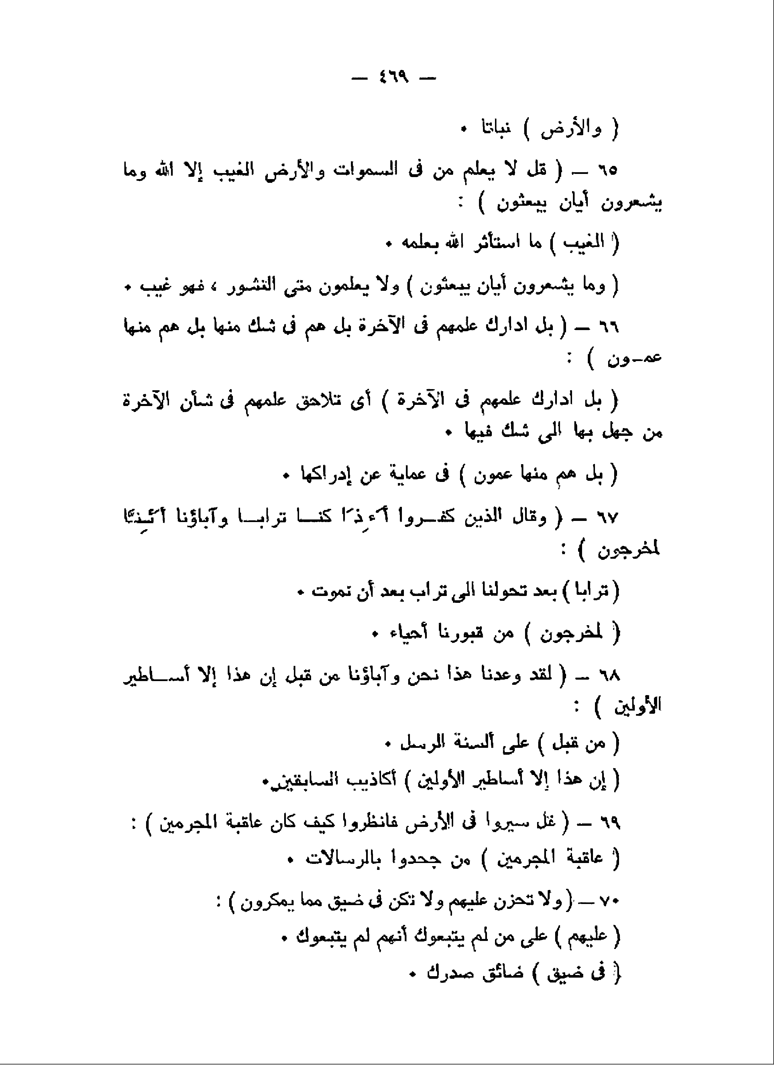قُلْ لا يَعْلَمُ مَنْ فِي السَّماواتِ وَالْأَرْضِ الْغَيْبَ إِلاَّ اللَّهُ وَما يَشْعُرُونَ أَيَّانَ يُبْعَثُونَ (65) بَلِ ادَّارَكَ عِلْمُهُمْ فِي الْآخِرَةِ بَلْ هُمْ فِي شَكٍّ مِنْها بَلْ هُمْ مِنْها عَمُونَ (66) وَقالَ الَّذِينَ كَفَرُوا أَإِذا كُنَّا تُراباً وَآباؤُنا أَإِنَّا لَمُخْرَجُونَ (67) لَقَدْ وُعِدْنا هذا نَحْنُ وَآباؤُنا مِنْ قَبْلُ إِنْ هذا إِلاَّ أَساطِيرُ الْأَوَّلِينَ (68) قُلْ سِيرُوا فِي الْأَرْضِ فَانْظُرُوا كَيْفَ كانَ عاقِبَةُ الْمُجْرِمِينَ (69)