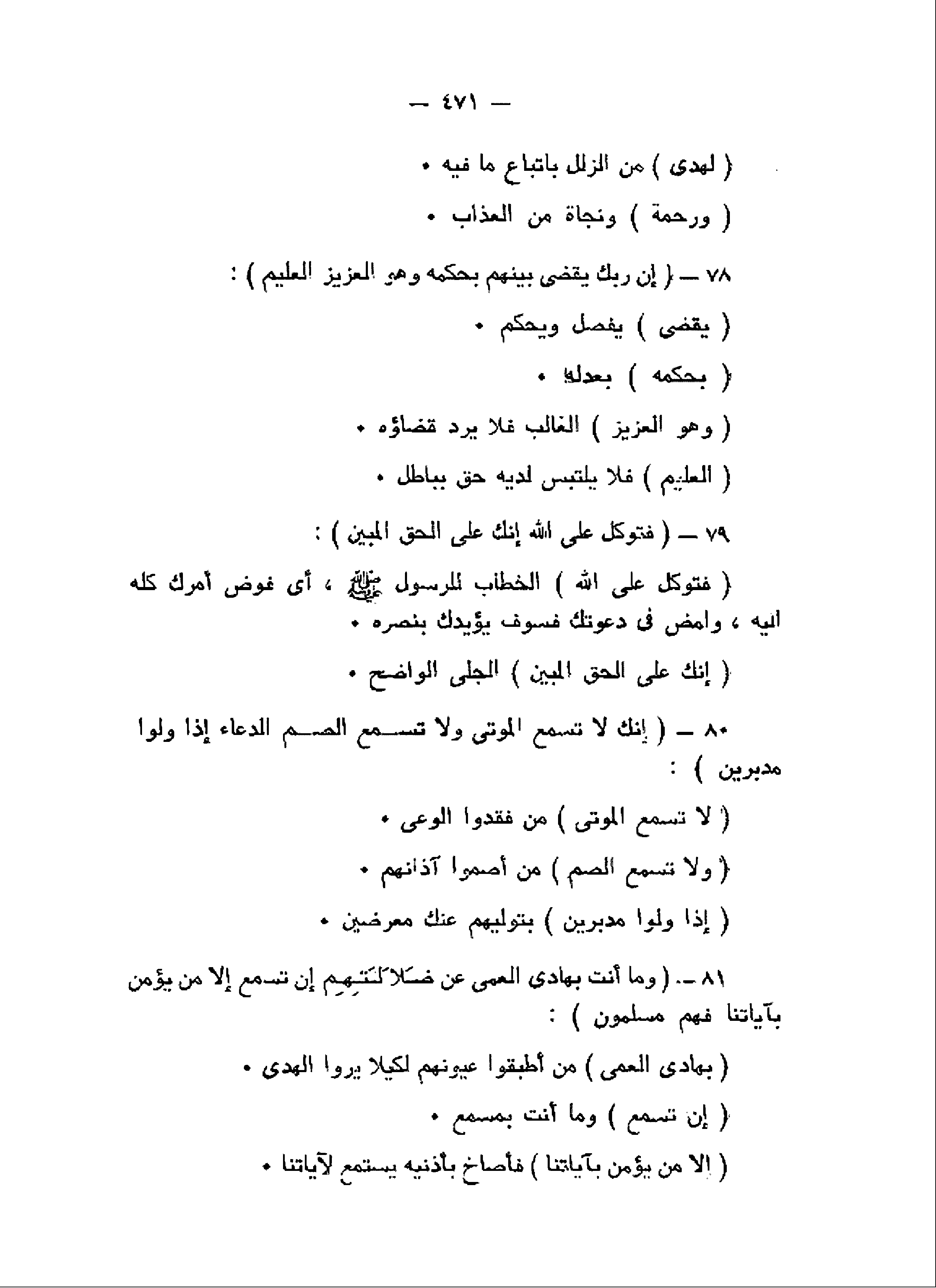 إِنَّ رَبَّكَ يَقْضِي بَيْنَهُمْ بِحُكْمِهِ وَهُوَ الْعَزِيزُ الْعَلِيمُ (78) فَتَوَكَّلْ عَلَى اللَّهِ إِنَّكَ عَلَى الْحَقِّ الْمُبِينِ (79) إِنَّكَ لا تُسْمِعُ الْمَوْتى وَلا تُسْمِعُ الصُّمَّ الدُّعاءَ إِذا وَلَّوْا مُدْبِرِينَ (80) وَما أَنْتَ بِهادِي الْعُمْيِ عَنْ ضَلالَتِهِمْ إِنْ تُسْمِعُ إِلاَّ مَنْ يُؤْمِنُ بِآياتِنا فَهُمْ مُسْلِمُونَ (81)