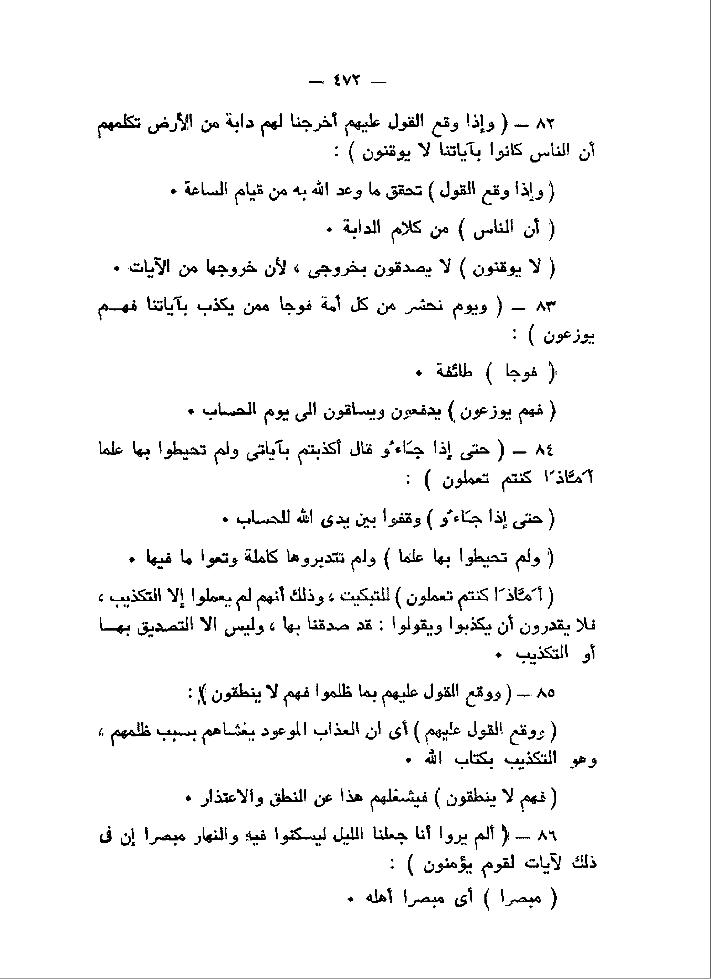 وَإِذا وَقَعَ الْقَوْلُ عَلَيْهِمْ أَخْرَجْنا لَهُمْ دَابَّةً مِنَ الْأَرْضِ تُكَلِّمُهُمْ أَنَّ النَّاسَ كانُوا بِآياتِنا لا يُوقِنُونَ (82) وَيَوْمَ نَحْشُرُ مِنْ كُلِّ أُمَّةٍ فَوْجاً مِمَّنْ يُكَذِّبُ بِآياتِنا فَهُمْ يُوزَعُونَ (83) حَتَّى إِذا جاؤُ قالَ أَكَذَّبْتُمْ بِآياتِي وَلَمْ تُحِيطُوا بِها عِلْماً أَمَّا ذا كُنْتُمْ تَعْمَلُونَ (84) وَوَقَعَ الْقَوْلُ عَلَيْهِمْ بِما ظَلَمُوا فَهُمْ لا يَنْطِقُونَ (85) أَلَمْ يَرَوْا أَنَّا جَعَلْنَا اللَّيْلَ لِيَسْكُنُوا فِيهِ وَالنَّهارَ مُبْصِراً إِنَّ فِي ذلِكَ لَآياتٍ لِقَوْمٍ يُؤْمِنُونَ (86)