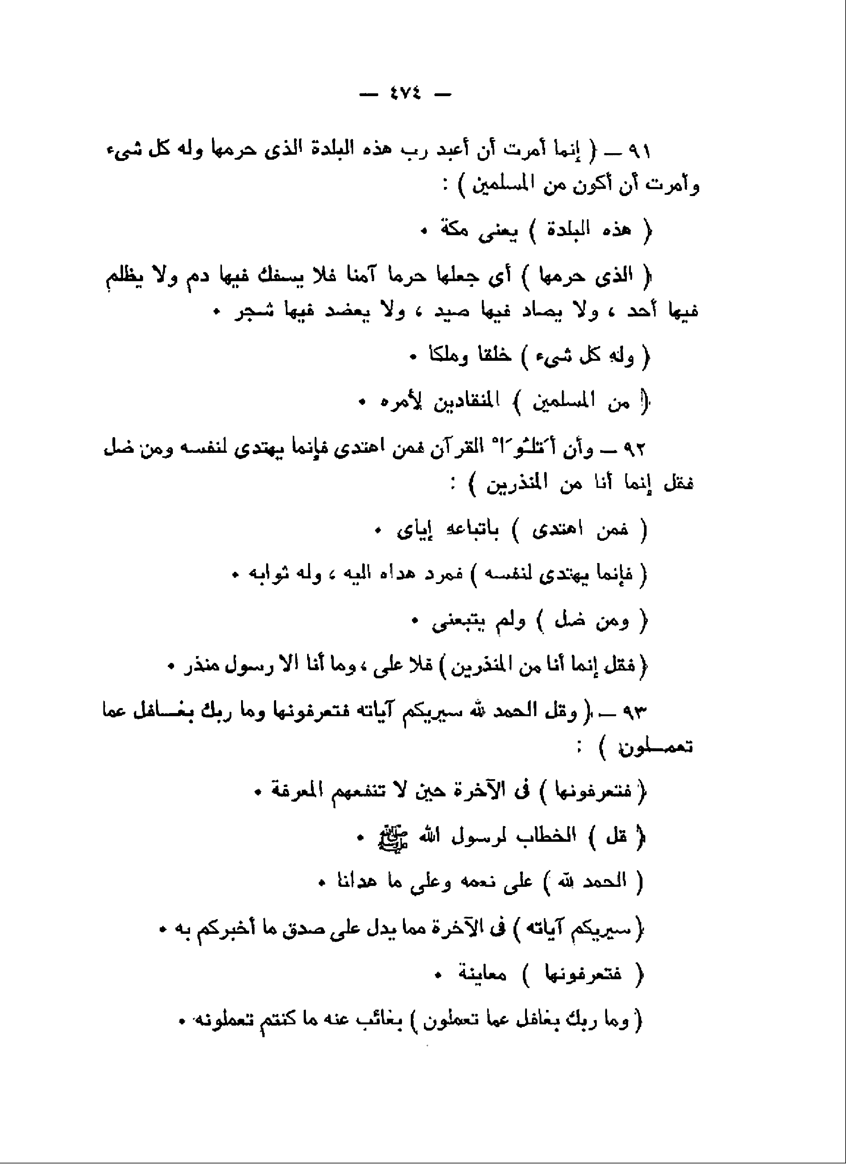 إِنَّما أُمِرْتُ أَنْ أَعْبُدَ رَبَّ هذِهِ الْبَلْدَةِ الَّذِي حَرَّمَها وَلَهُ كُلُّ شَيْءٍ وَأُمِرْتُ أَنْ أَكُونَ مِنَ الْمُسْلِمِينَ (91) وَأَنْ أَتْلُوَا الْقُرْآنَ فَمَنِ اهْتَدى فَإِنَّما يَهْتَدِي لِنَفْسِهِ وَمَنْ ضَلَّ فَقُلْ إِنَّما أَنَا مِنَ الْمُنْذِرِينَ (92) وَقُلِ الْحَمْدُ لِلَّهِ سَيُرِيكُمْ آياتِهِ فَتَعْرِفُونَها وَما رَبُّكَ بِغافِلٍ عَمَّا تَعْمَلُونَ (93)