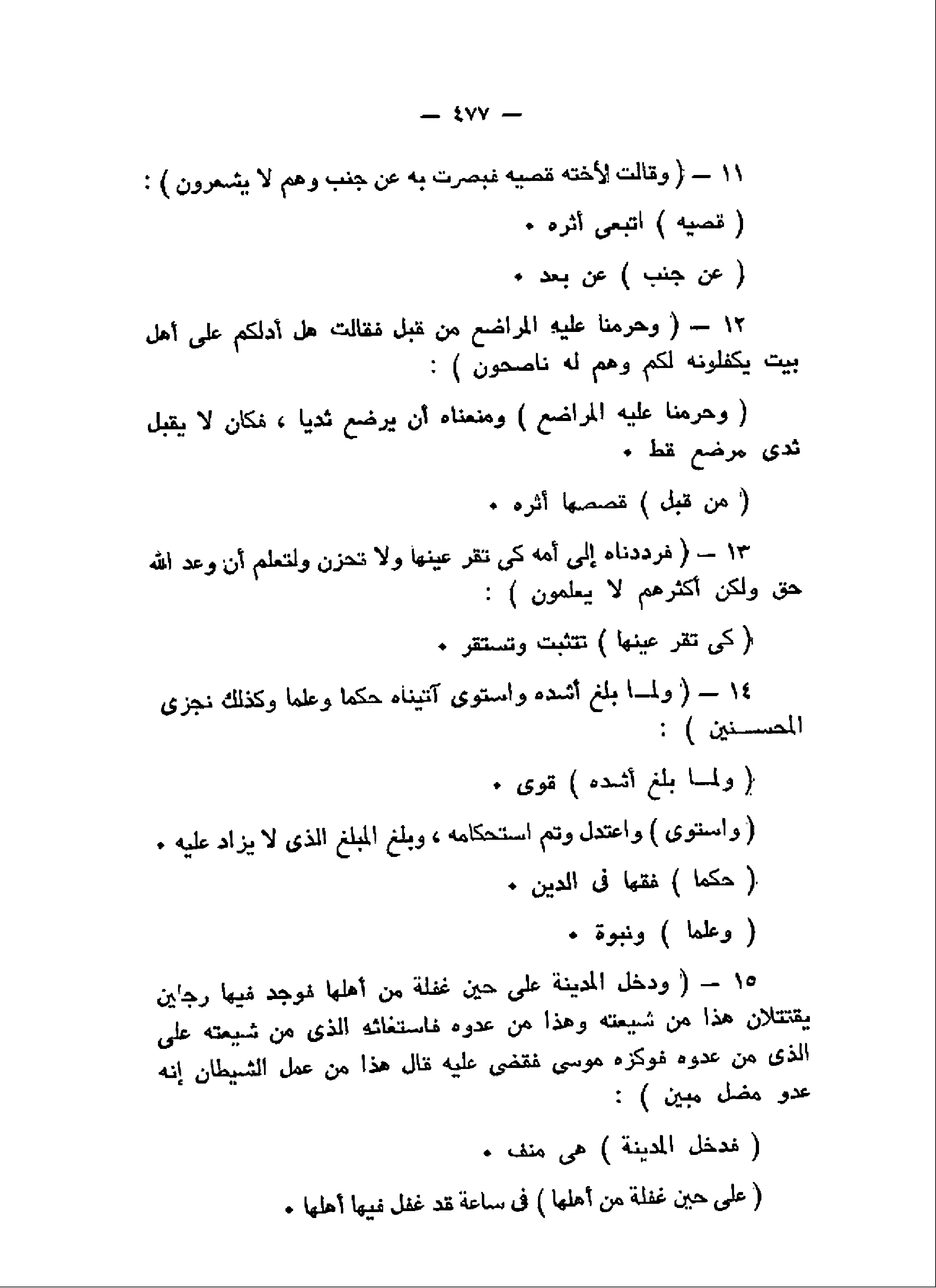 وَقالَتْ لِأُخْتِهِ قُصِّيهِ فَبَصُرَتْ بِهِ عَنْ جُنُبٍ وَهُمْ لا يَشْعُرُونَ (11) وَحَرَّمْنا عَلَيْهِ الْمَراضِعَ مِنْ قَبْلُ فَقالَتْ هَلْ أَدُلُّكُمْ عَلى أَهْلِ بَيْتٍ يَكْفُلُونَهُ لَكُمْ وَهُمْ لَهُ ناصِحُونَ (12) فَرَدَدْناهُ إِلى أُمِّهِ كَيْ تَقَرَّ عَيْنُها وَلا تَحْزَنَ وَلِتَعْلَمَ أَنَّ وَعْدَ اللَّهِ حَقٌّ وَلكِنَّ أَكْثَرَهُمْ لا يَعْلَمُونَ (13) وَلَمَّا بَلَغَ أَشُدَّهُ وَاسْتَوى آتَيْناهُ حُكْماً وَعِلْماً وَكَذلِكَ نَجْزِي الْمُحْسِنِينَ (14) وَدَخَلَ الْمَدِينَةَ عَلى حِينِ غَفْلَةٍ مِنْ أَهْلِها فَوَجَدَ فِيها رَجُلَيْنِ يَقْتَتِلانِ هذا مِنْ شِيعَتِهِ وَهذا مِنْ عَدُوِّهِ فَاسْتَغاثَهُ الَّذِي مِنْ شِيعَتِهِ عَلَى الَّذِي مِنْ عَدُوِّهِ فَوَكَزَهُ مُوسى فَقَضى عَلَيْهِ قالَ هذا مِنْ عَمَلِ الشَّيْطانِ إِنَّهُ عَدُوٌّ مُضِلٌّ مُبِينٌ (15)