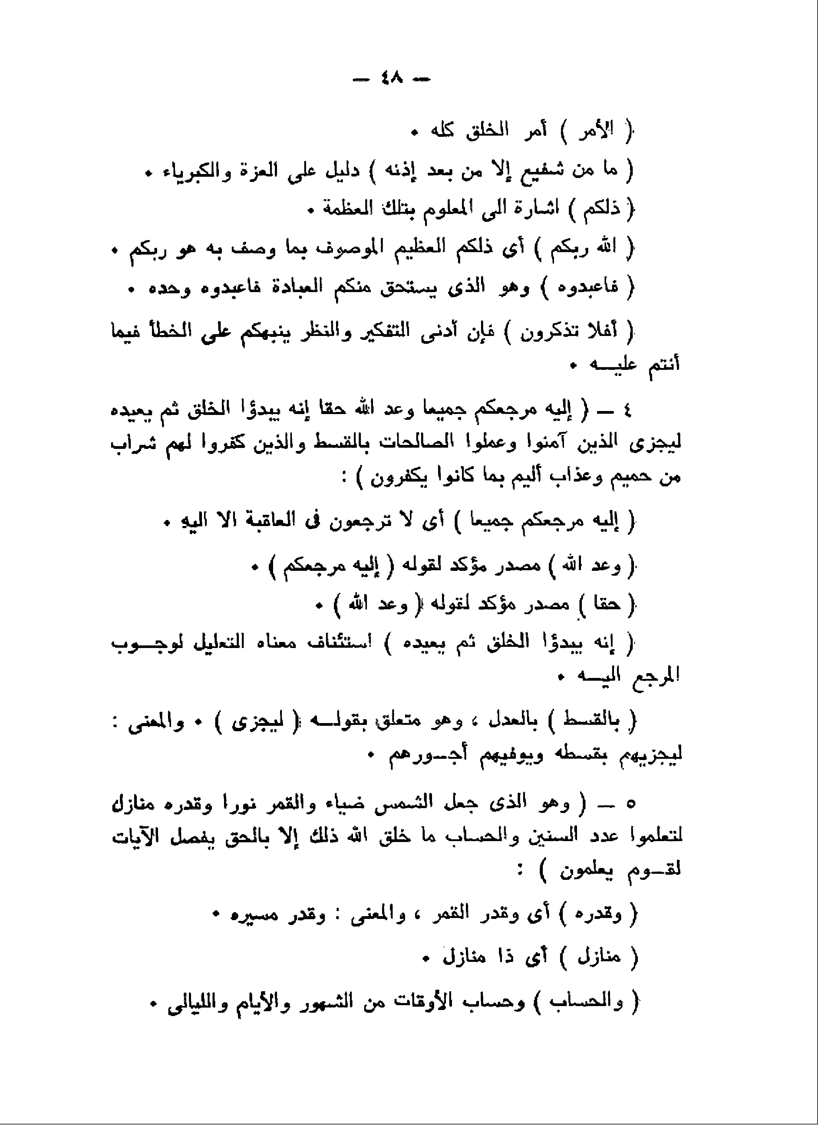 إِلَيْهِ مَرْجِعُكُمْ جَمِيعاً وَعْدَ اللَّهِ حَقًّا إِنَّهُ يَبْدَؤُا الْخَلْقَ ثُمَّ يُعِيدُهُ لِيَجْزِيَ الَّذِينَ آمَنُوا وَعَمِلُوا الصَّالِحاتِ بِالْقِسْطِ وَالَّذِينَ كَفَرُوا لَهُمْ شَرابٌ مِنْ حَمِيمٍ وَعَذابٌ أَلِيمٌ بِما كانُوا يَكْفُرُونَ (4) هُوَ الَّذِي جَعَلَ الشَّمْسَ ضِياءً وَالْقَمَرَ نُوراً وَقَدَّرَهُ مَنازِلَ لِتَعْلَمُوا عَدَدَ السِّنِينَ وَالْحِسابَ ما خَلَقَ اللَّهُ ذلِكَ إِلاَّ بِالْحَقِّ يُفَصِّلُ الْآياتِ لِقَوْمٍ يَعْلَمُونَ (5)