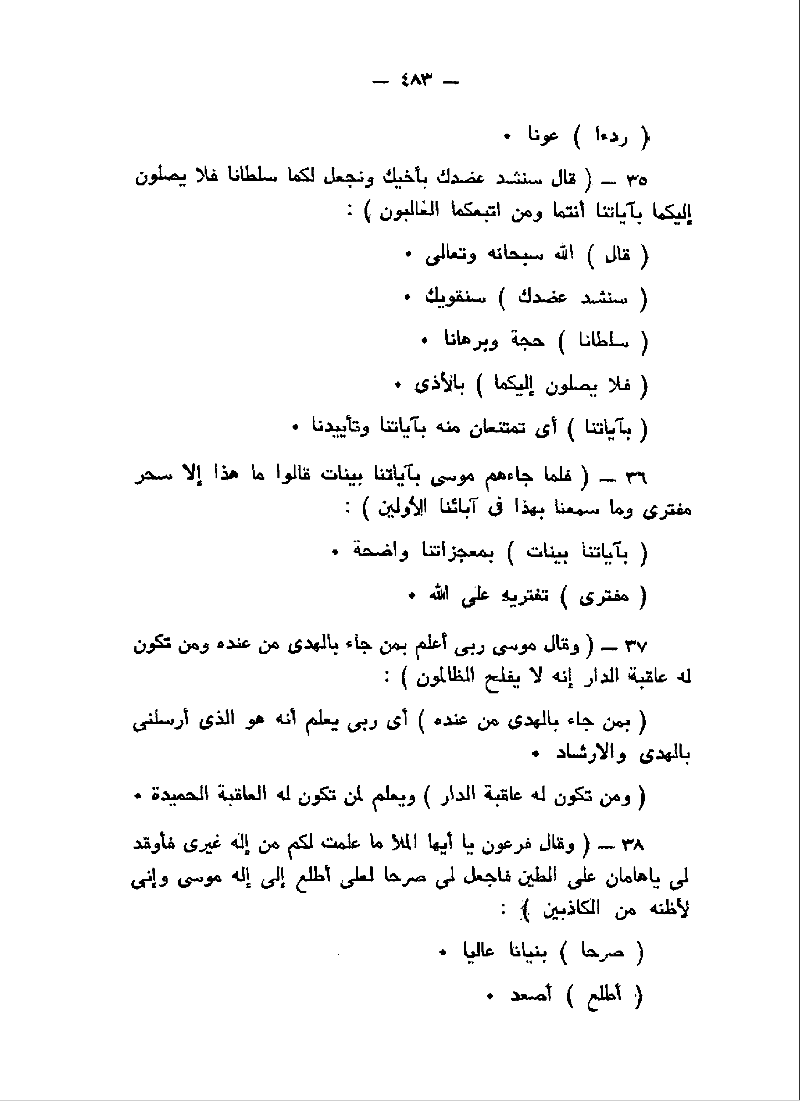 قالَ سَنَشُدُّ عَضُدَكَ بِأَخِيكَ وَنَجْعَلُ لَكُما سُلْطاناً فَلا يَصِلُونَ إِلَيْكُما بِآياتِنا أَنْتُما وَمَنِ اتَّبَعَكُمَا الْغالِبُونَ (35) فَلَمَّا جاءَهُمْ مُوسى بِآياتِنا بَيِّناتٍ قالُوا ما هذا إِلاَّ سِحْرٌ مُفْتَرىً وَما سَمِعْنا بِهذا فِي آبائِنَا الْأَوَّلِينَ (36) وَقالَ مُوسى رَبِّي أَعْلَمُ بِمَنْ جاءَ بِالْهُدى مِنْ عِنْدِهِ وَمَنْ تَكُونُ لَهُ عاقِبَةُ الدَّارِ إِنَّهُ لا يُفْلِحُ الظَّالِمُونَ (37) وَقالَ فِرْعَوْنُ يا أَيُّهَا الْمَلَأُ ما عَلِمْتُ لَكُمْ مِنْ إِلهٍ غَيْرِي فَأَوْقِدْ لِي يا هامانُ عَلَى الطِّينِ فَاجْعَلْ لِي صَرْحاً لَعَلِّي أَطَّلِعُ إِلى إِلهِ مُوسى وَإِنِّي لَأَظُنُّهُ مِنَ الْكاذِبِينَ (38)