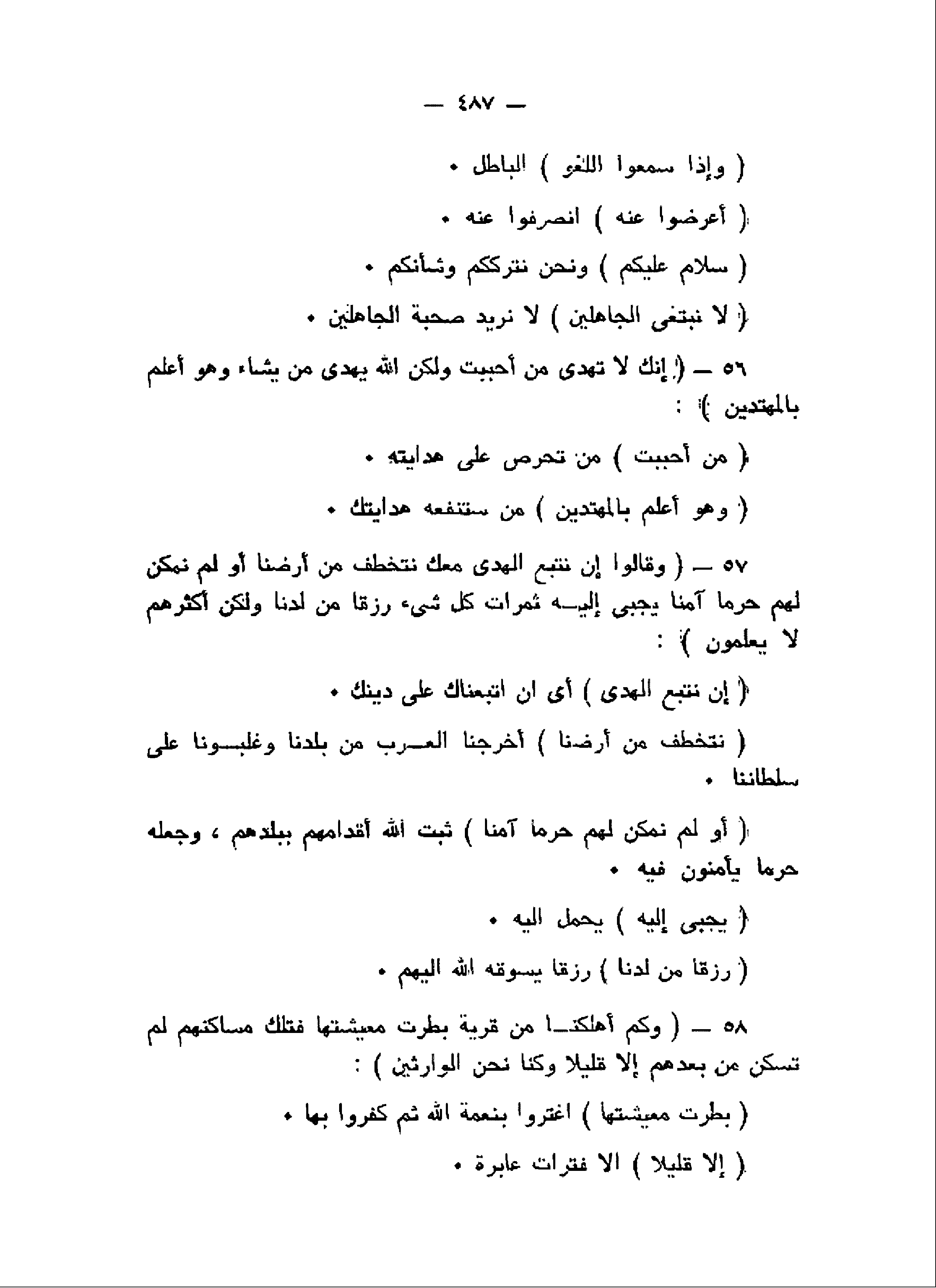 إِنَّكَ لا تَهْدِي مَنْ أَحْبَبْتَ وَلكِنَّ اللَّهَ يَهْدِي مَنْ يَشاءُ وَهُوَ أَعْلَمُ بِالْمُهْتَدِينَ (56) وَقالُوا إِنْ نَتَّبِعِ الْهُدى مَعَكَ نُتَخَطَّفْ مِنْ أَرْضِنا أَوَلَمْ نُمَكِّنْ لَهُمْ حَرَماً آمِناً يُجْبى إِلَيْهِ ثَمَراتُ كُلِّ شَيْءٍ رِزْقاً مِنْ لَدُنَّا وَلكِنَّ أَكْثَرَهُمْ لا يَعْلَمُونَ (57) وَكَمْ أَهْلَكْنا مِنْ قَرْيَةٍ بَطِرَتْ مَعِيشَتَها فَتِلْكَ مَساكِنُهُمْ لَمْ تُسْكَنْ مِنْ بَعْدِهِمْ إِلاَّ قَلِيلاً وَكُنَّا نَحْنُ الْوارِثِينَ (58)