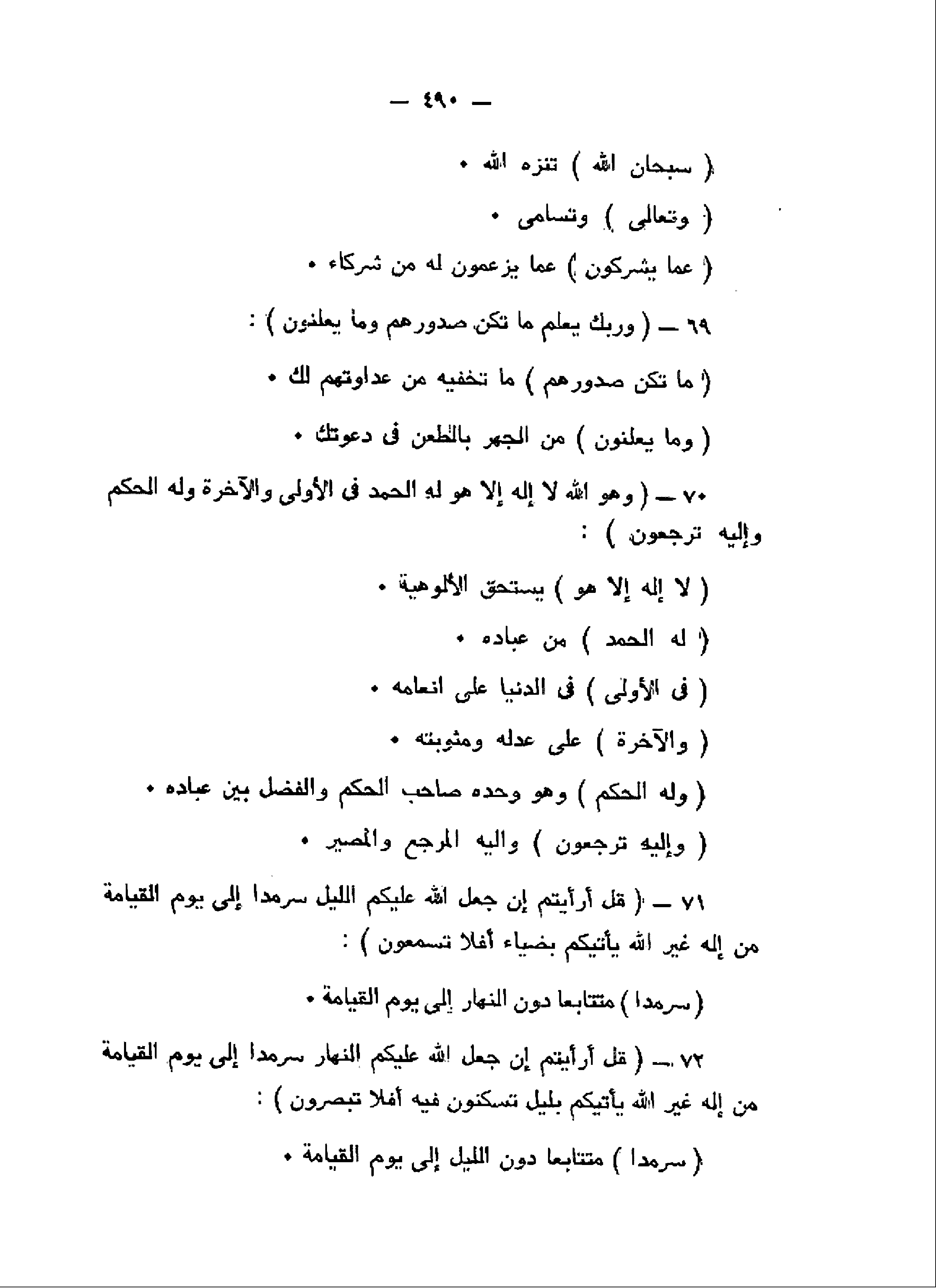 وَرَبُّكَ يَعْلَمُ ما تُكِنُّ صُدُورُهُمْ وَما يُعْلِنُونَ (69) وَهُوَ اللَّهُ لا إِلهَ إِلاَّ هُوَ لَهُ الْحَمْدُ فِي الْأُولى وَالْآخِرَةِ وَلَهُ الْحُكْمُ وَإِلَيْهِ تُرْجَعُونَ (70) قُلْ أَرَأَيْتُمْ إِنْ جَعَلَ اللَّهُ عَلَيْكُمُ اللَّيْلَ سَرْمَداً إِلى يَوْمِ الْقِيامَةِ مَنْ إِلهٌ غَيْرُ اللَّهِ يَأْتِيكُمْ بِضِياءٍ أَفَلا تَسْمَعُونَ (71) قُلْ أَرَأَيْتُمْ إِنْ جَعَلَ اللَّهُ عَلَيْكُمُ النَّهارَ سَرْمَداً إِلى يَوْمِ الْقِيامَةِ مَنْ إِلهٌ غَيْرُ اللَّهِ يَأْتِيكُمْ بِلَيْلٍ تَسْكُنُونَ فِيهِ أَفَلا تُبْصِرُونَ (72)