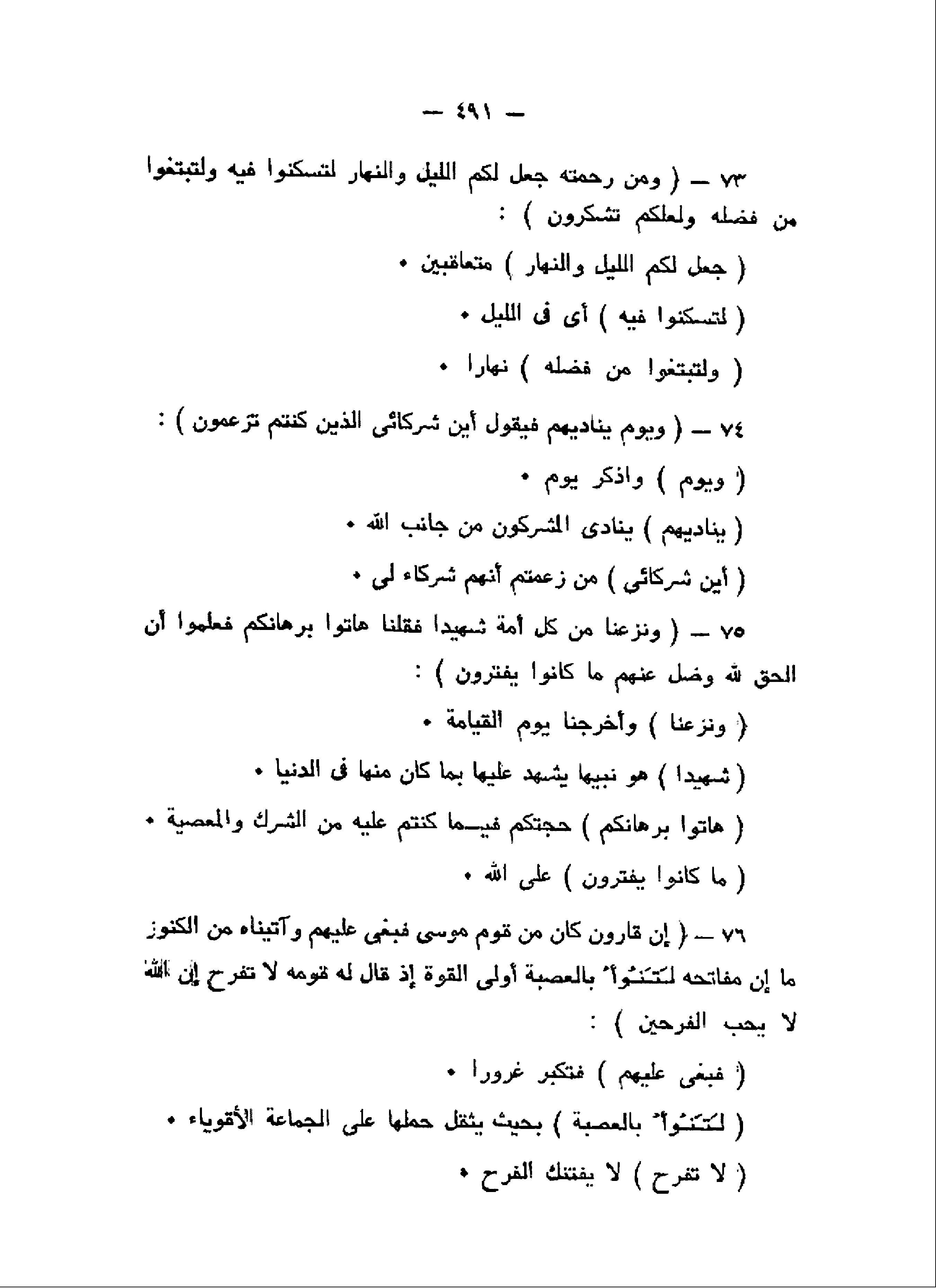 وَمِنْ رَحْمَتِهِ جَعَلَ لَكُمُ اللَّيْلَ وَالنَّهارَ لِتَسْكُنُوا فِيهِ وَلِتَبْتَغُوا مِنْ فَضْلِهِ وَلَعَلَّكُمْ تَشْكُرُونَ (73) وَيَوْمَ يُنادِيهِمْ فَيَقُولُ أَيْنَ شُرَكائِيَ الَّذِينَ كُنْتُمْ تَزْعُمُونَ (74) وَنَزَعْنا مِنْ كُلِّ أُمَّةٍ شَهِيداً فَقُلْنا هاتُوا بُرْهانَكُمْ فَعَلِمُوا أَنَّ الْحَقَّ لِلَّهِ وَضَلَّ عَنْهُمْ ما كانُوا يَفْتَرُونَ (75) إِنَّ قارُونَ كانَ مِنْ قَوْمِ مُوسى فَبَغى عَلَيْهِمْ وَآتَيْناهُ مِنَ الْكُنُوزِ ما إِنَّ مَفاتِحَهُ لَتَنُوأُ بِالْعُصْبَةِ أُولِي الْقُوَّةِ إِذْ قالَ لَهُ قَوْمُهُ لا تَفْرَحْ إِنَّ اللَّهَ لا يُحِبُّ الْفَرِحِينَ (76)