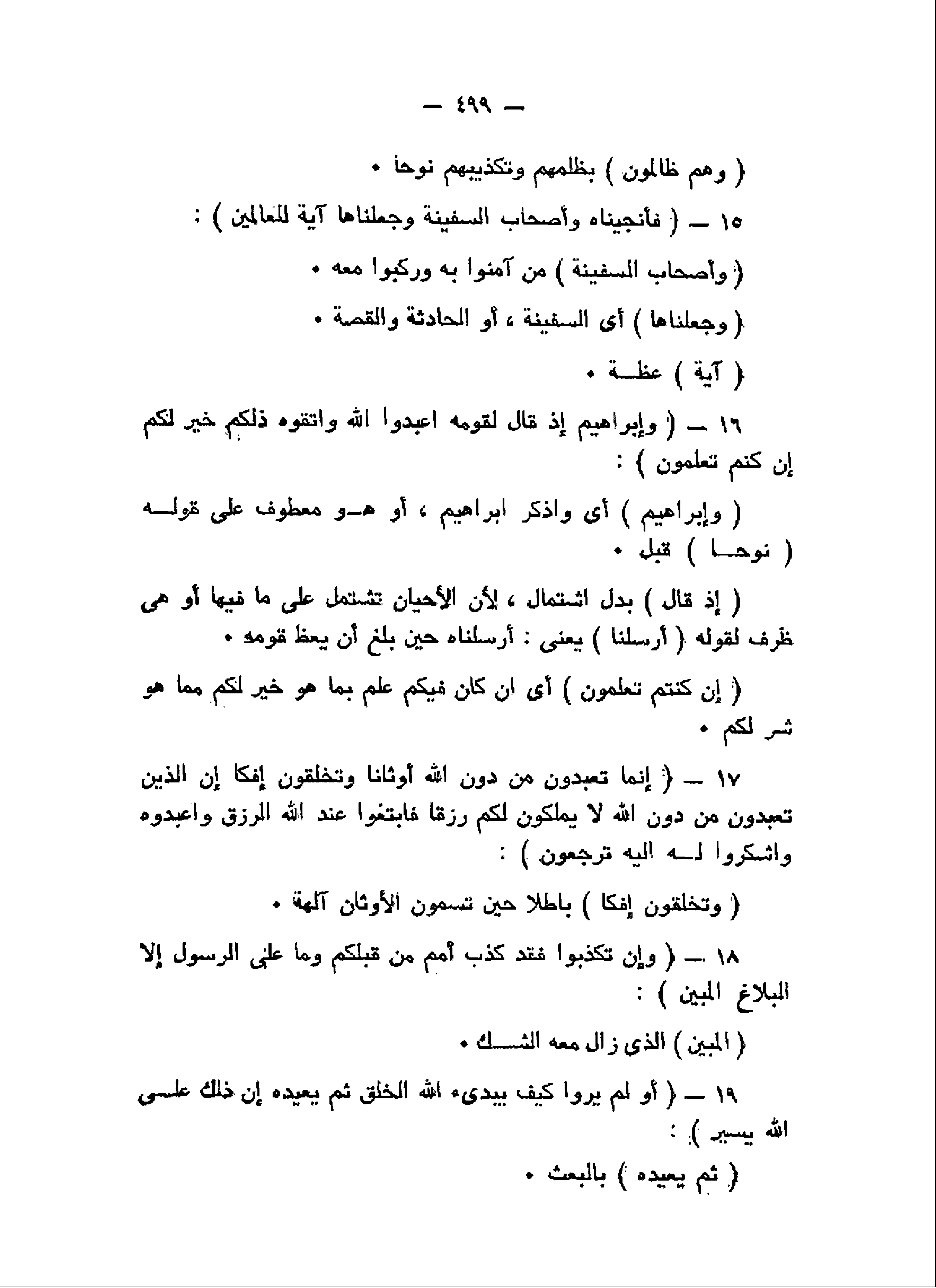 فَأَنْجَيْناهُ وَأَصْحابَ السَّفِينَةِ وَجَعَلْناها آيَةً لِلْعالَمِينَ (15) وَإِبْراهِيمَ إِذْ قالَ لِقَوْمِهِ اعْبُدُوا اللَّهَ وَاتَّقُوهُ ذلِكُمْ خَيْرٌ لَكُمْ إِنْ كُنْتُمْ تَعْلَمُونَ (16) إِنَّما تَعْبُدُونَ مِنْ دُونِ اللَّهِ أَوْثاناً وَتَخْلُقُونَ إِفْكاً إِنَّ الَّذِينَ تَعْبُدُونَ مِنْ دُونِ اللَّهِ لا يَمْلِكُونَ لَكُمْ رِزْقاً فَابْتَغُوا عِنْدَ اللَّهِ الرِّزْقَ وَاعْبُدُوهُ وَاشْكُرُوا لَهُ إِلَيْهِ تُرْجَعُونَ (17) وَإِنْ تُكَذِّبُوا فَقَدْ كَذَّبَ أُمَمٌ مِنْ قَبْلِكُمْ وَما عَلَى الرَّسُولِ إِلاَّ الْبَلاغُ الْمُبِينُ (18) أَوَلَمْ يَرَوْا كَيْفَ يُبْدِئُ اللَّهُ الْخَلْقَ ثُمَّ يُعِيدُهُ إِنَّ ذلِكَ عَلَى اللَّهِ يَسِيرٌ (19)