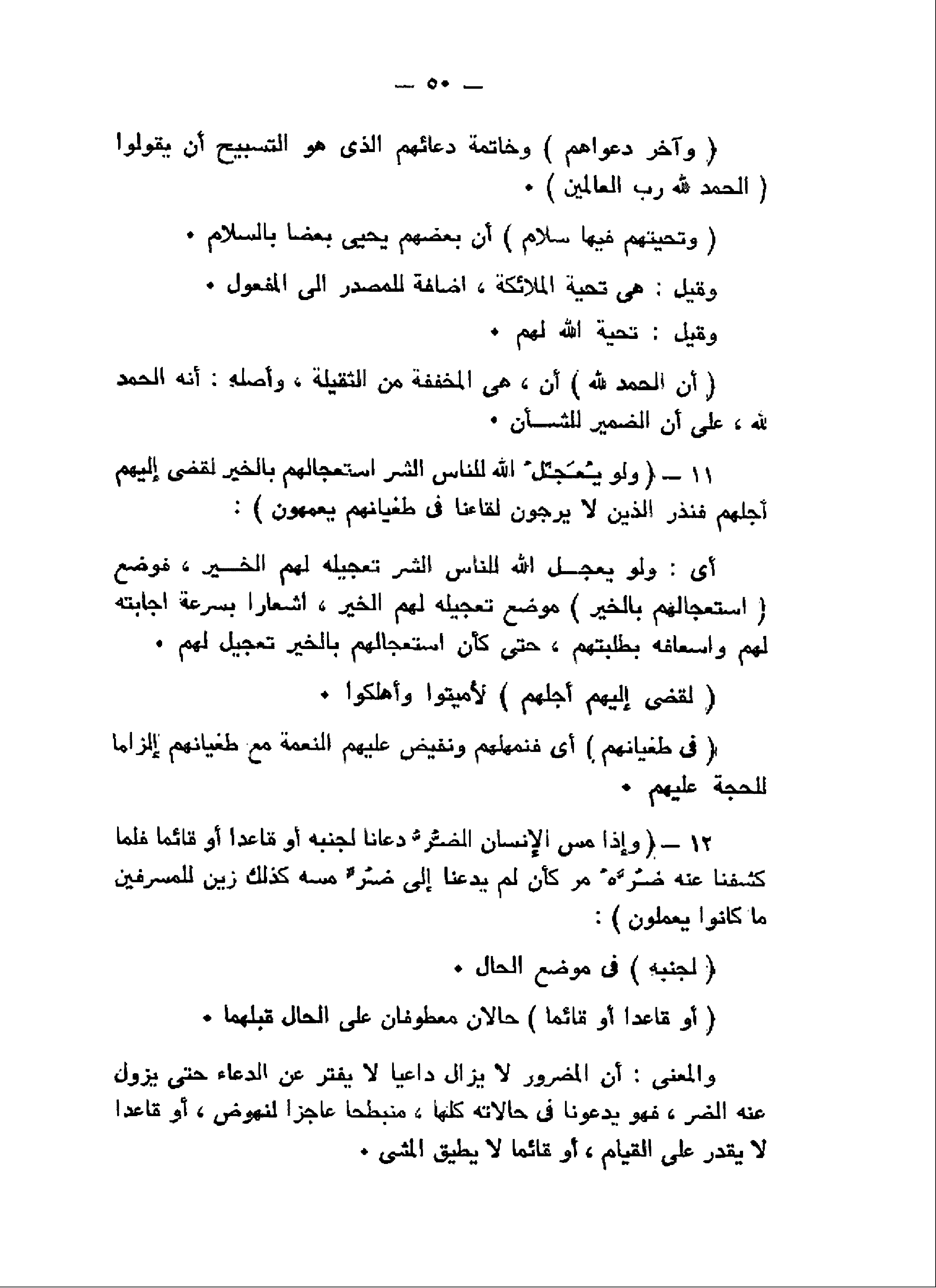 وَلَوْ يُعَجِّلُ اللَّهُ لِلنَّاسِ الشَّرَّ اسْتِعْجالَهُمْ بِالْخَيْرِ لَقُضِيَ إِلَيْهِمْ أَجَلُهُمْ فَنَذَرُ الَّذِينَ لا يَرْجُونَ لِقاءَنا فِي طُغْيانِهِمْ يَعْمَهُونَ (11) وَإِذا مَسَّ الْإِنْسانَ الضُّرُّ دَعانا لِجَنْبِهِ أَوْ قاعِداً أَوْ قائِماً فَلَمَّا كَشَفْنا عَنْهُ ضُرَّهُ مَرَّ كَأَنْ لَمْ يَدْعُنا إِلى ضُرٍّ مَسَّهُ كَذلِكَ زُيِّنَ لِلْمُسْرِفِينَ ما كانُوا يَعْمَلُونَ (12)