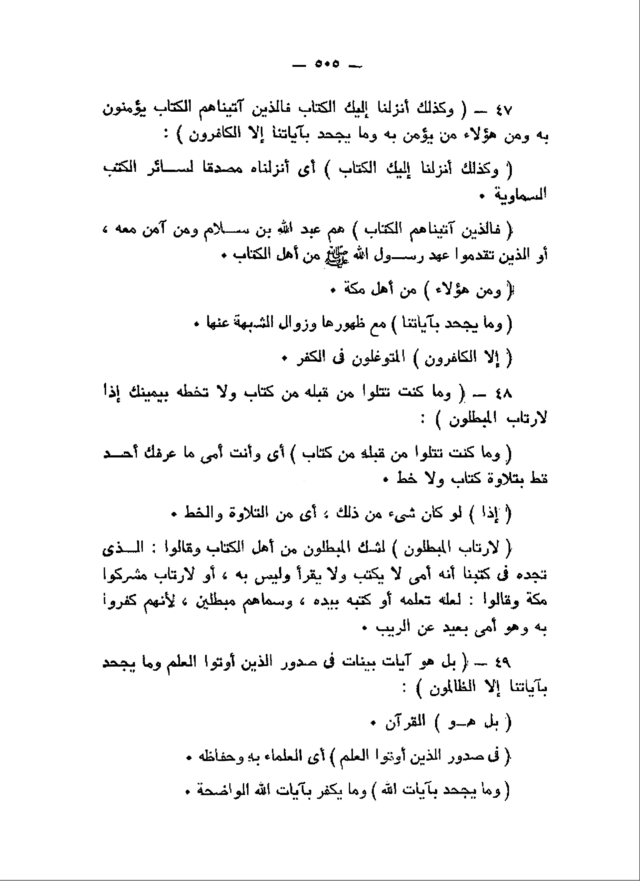 وَكَذلِكَ أَنْزَلْنا إِلَيْكَ الْكِتابَ فَالَّذِينَ آتَيْناهُمُ الْكِتابَ يُؤْمِنُونَ بِهِ وَمِنْ هؤُلاءِ مَنْ يُؤْمِنُ بِهِ وَما يَجْحَدُ بِآياتِنا إِلاَّ الْكافِرُونَ (47) وَما كُنْتَ تَتْلُوا مِنْ قَبْلِهِ مِنْ كِتابٍ وَلا تَخُطُّهُ بِيَمِينِكَ إِذاً لارْتابَ الْمُبْطِلُونَ (48) بَلْ هُوَ آياتٌ بَيِّناتٌ فِي صُدُورِ الَّذِينَ أُوتُوا الْعِلْمَ وَما يَجْحَدُ بِآياتِنا إِلاَّ الظَّالِمُونَ (49)