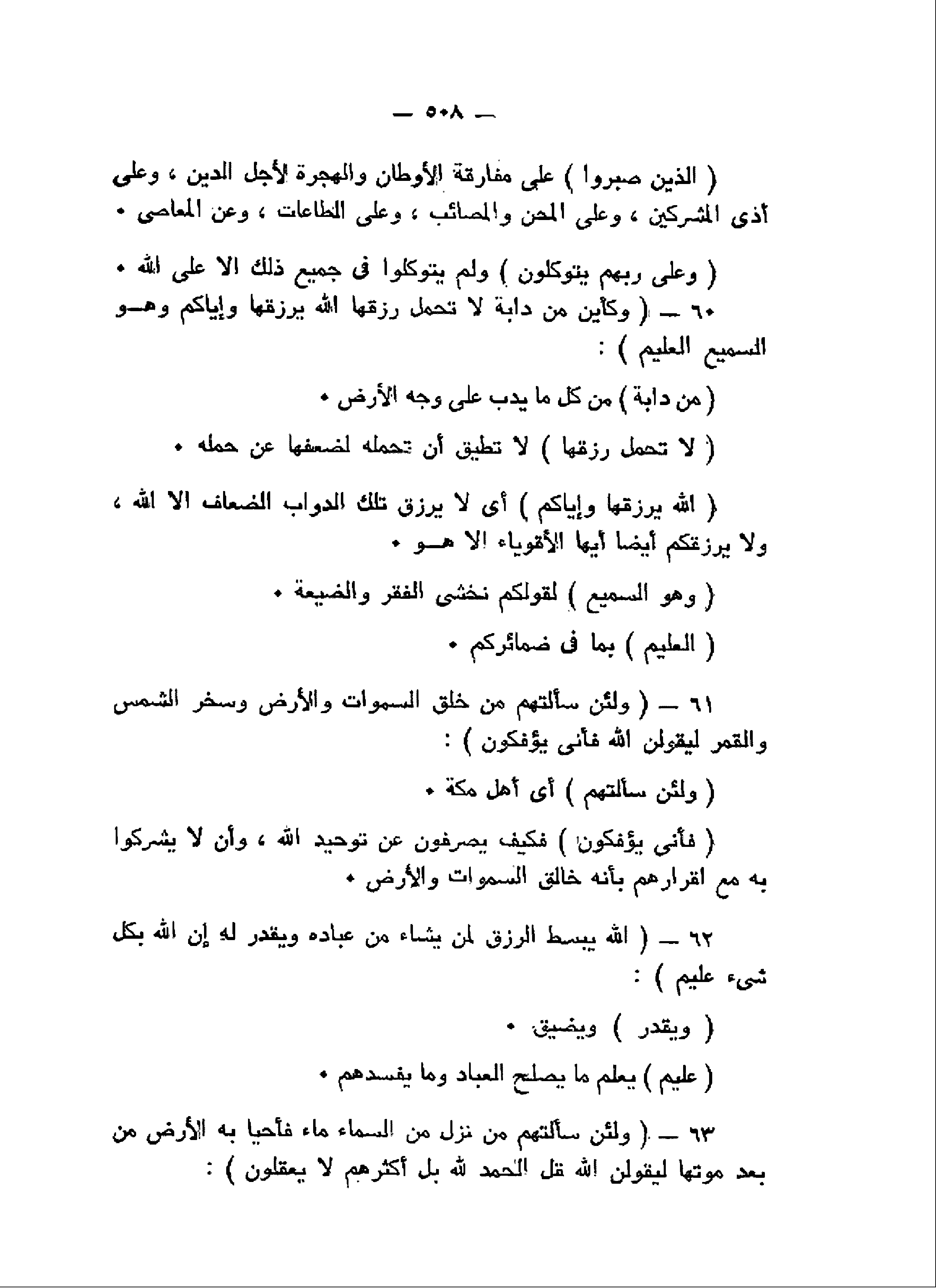 وَكَأَيِّنْ مِنْ دَابَّةٍ لا تَحْمِلُ رِزْقَهَا اللَّهُ يَرْزُقُها وَإِيَّاكُمْ وَهُوَ السَّمِيعُ الْعَلِيمُ (60) وَلَئِنْ سَأَلْتَهُمْ مَنْ خَلَقَ السَّماواتِ وَالْأَرْضَ وَسَخَّرَ الشَّمْسَ وَالْقَمَرَ لَيَقُولُنَّ اللَّهُ فَأَنَّى يُؤْفَكُونَ (61) اللَّهُ يَبْسُطُ الرِّزْقَ لِمَنْ يَشاءُ مِنْ عِبادِهِ وَيَقْدِرُ لَهُ إِنَّ اللَّهَ بِكُلِّ شَيْءٍ عَلِيمٌ (62) وَلَئِنْ سَأَلْتَهُمْ مَنْ نَزَّلَ مِنَ السَّماءِ ماءً فَأَحْيا بِهِ الْأَرْضَ مِنْ بَعْدِ مَوْتِها لَيَقُولُنَّ اللَّهُ قُلِ الْحَمْدُ لِلَّهِ بَلْ أَكْثَرُهُمْ لا يَعْقِلُونَ (63)