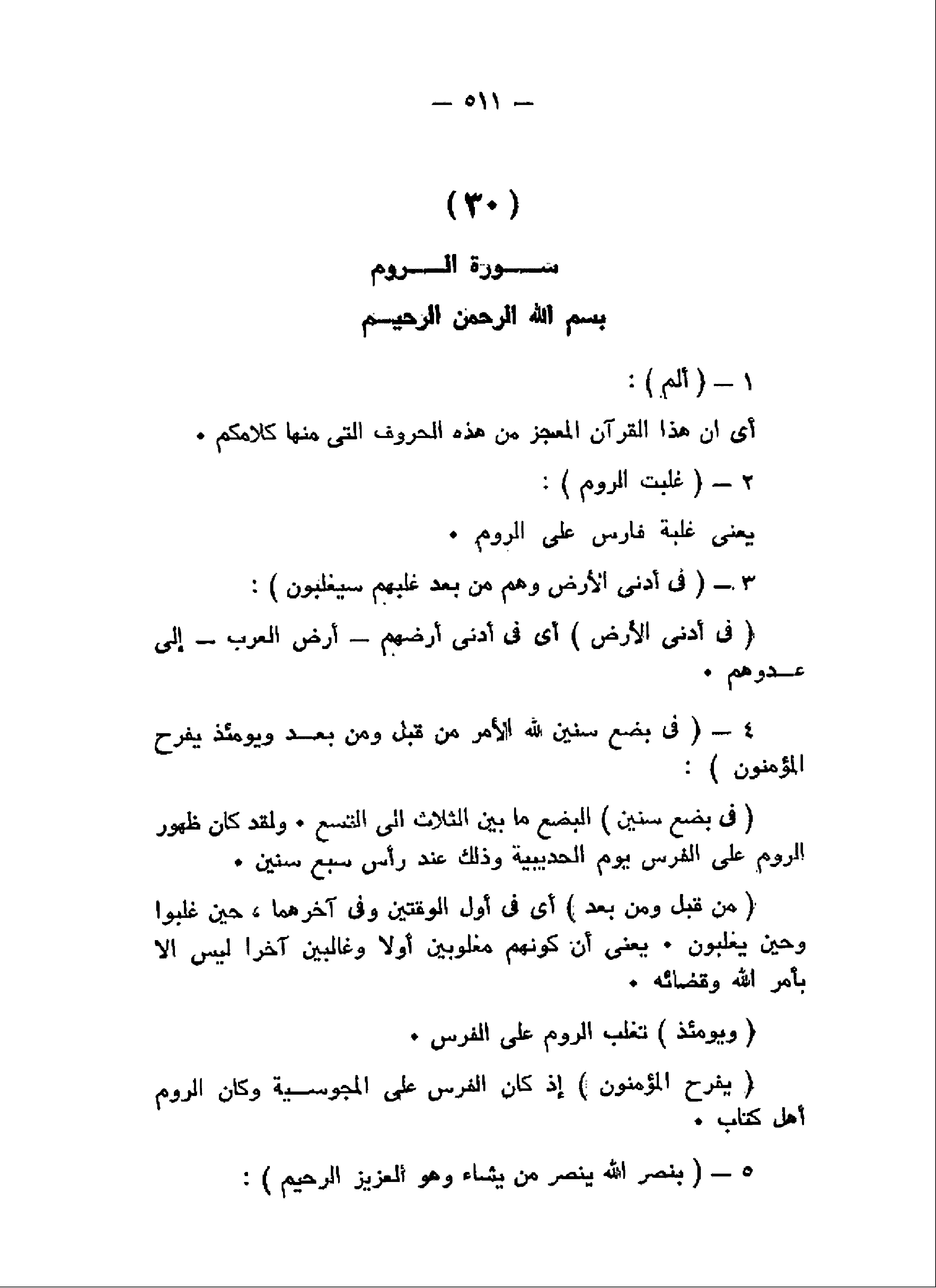 الم (1) غُلِبَتِ الرُّومُ (2) فِي أَدْنَى الْأَرْضِ وَهُمْ مِنْ بَعْدِ غَلَبِهِمْ سَيَغْلِبُونَ (3) فِي بِضْعِ سِنِينَ لِلَّهِ الْأَمْرُ مِنْ قَبْلُ وَمِنْ بَعْدُ وَيَوْمَئِذٍ يَفْرَحُ الْمُؤْمِنُونَ (4)