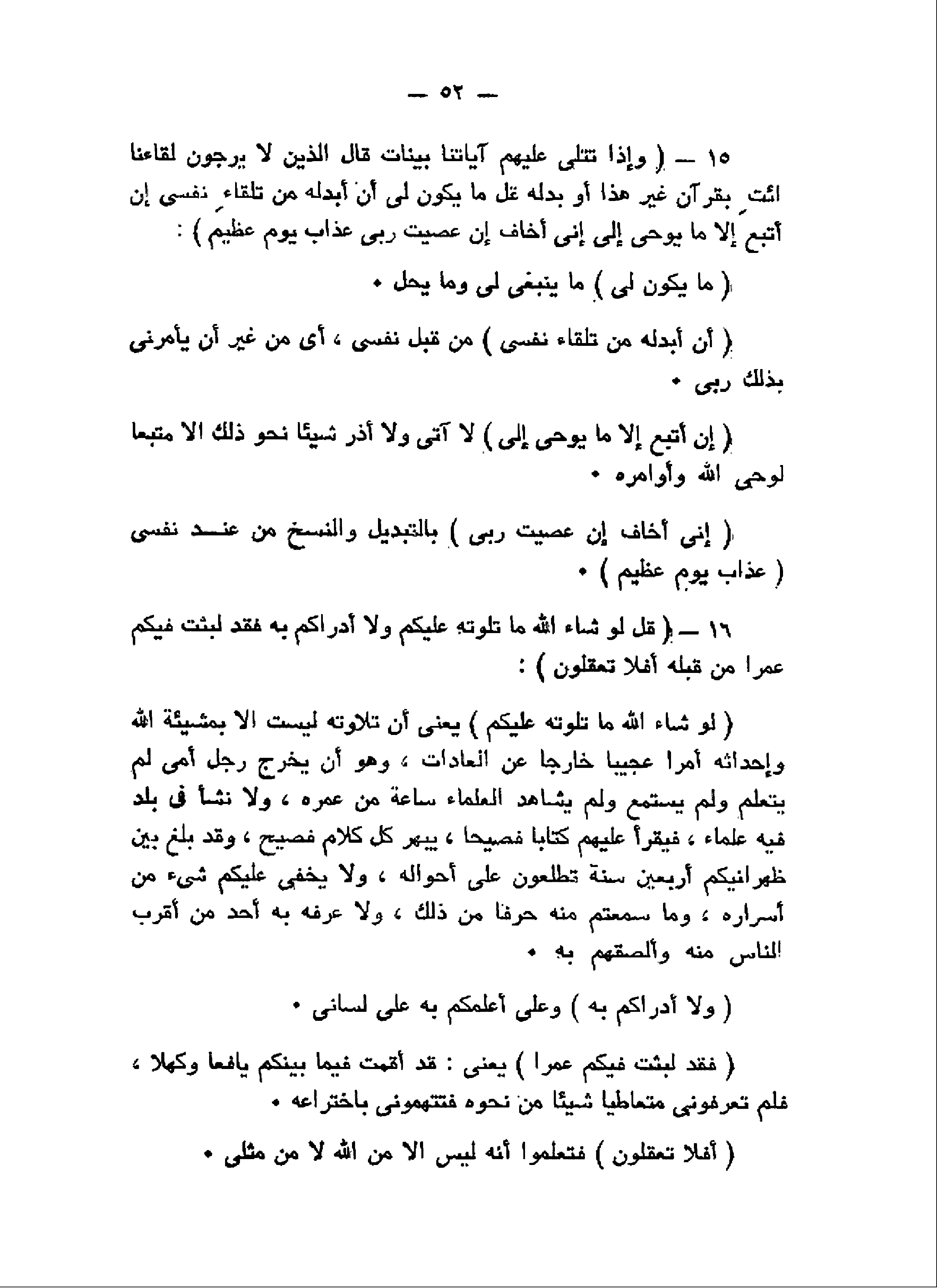 وَإِذا تُتْلى عَلَيْهِمْ آياتُنا بَيِّناتٍ قالَ الَّذِينَ لا يَرْجُونَ لِقاءَنَا ائْتِ بِقُرْآنٍ غَيْرِ هذا أَوْ بَدِّلْهُ قُلْ ما يَكُونُ لِي أَنْ أُبَدِّلَهُ مِنْ تِلْقاءِ نَفْسِي إِنْ أَتَّبِعُ إِلاَّ ما يُوحى إِلَيَّ إِنِّي أَخافُ إِنْ عَصَيْتُ رَبِّي عَذابَ يَوْمٍ عَظِيمٍ (15) قُلْ لَوْ شاءَ اللَّهُ ما تَلَوْتُهُ عَلَيْكُمْ وَلا أَدْراكُمْ بِهِ فَقَدْ لَبِثْتُ فِيكُمْ عُمُراً مِنْ قَبْلِهِ أَفَلا تَعْقِلُونَ (16)