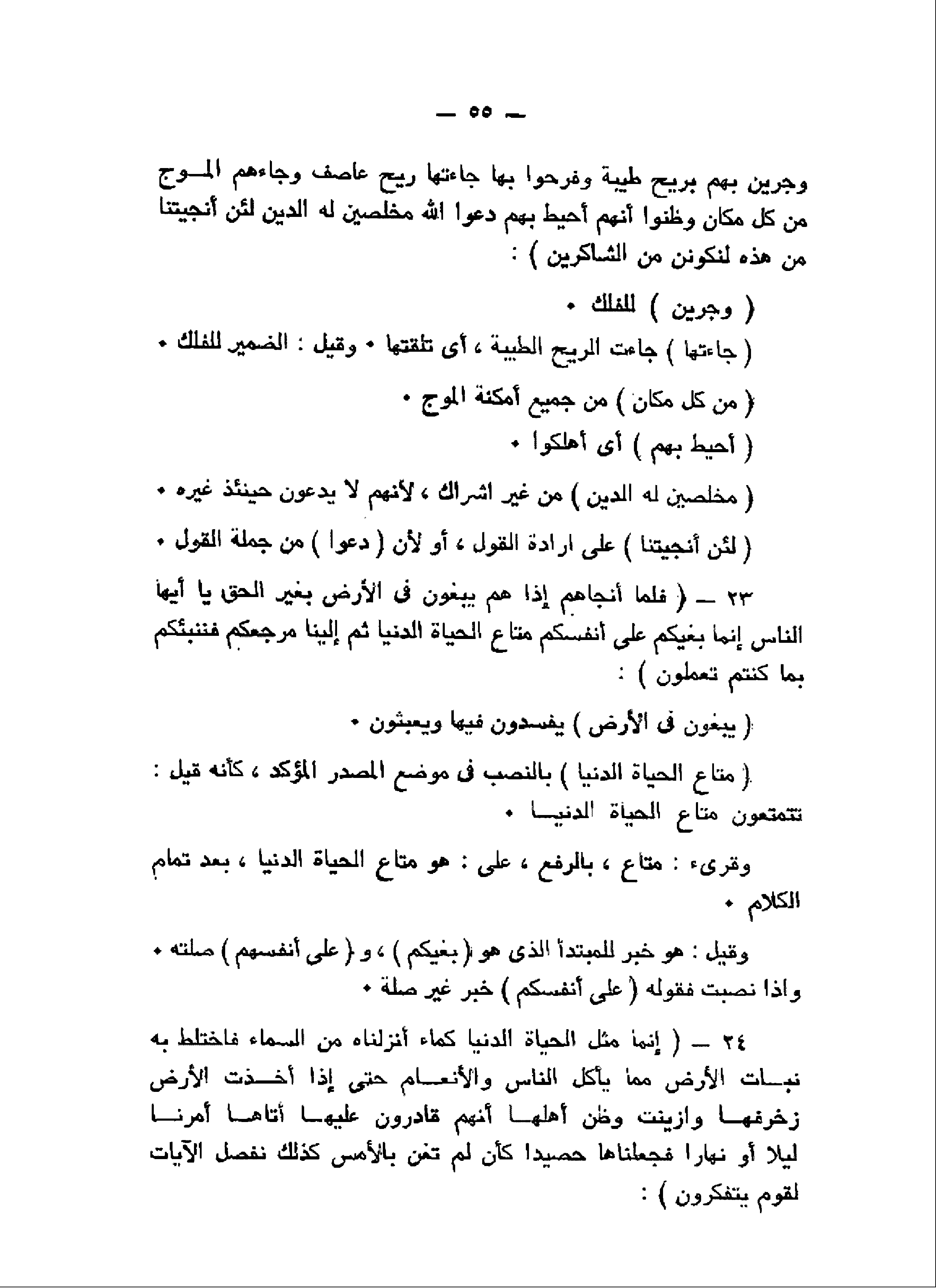 هُوَ الَّذِي يُسَيِّرُكُمْ فِي الْبَرِّ وَالْبَحْرِ حَتَّى إِذا كُنْتُمْ فِي الْفُلْكِ وَجَرَيْنَ بِهِمْ بِرِيحٍ طَيِّبَةٍ وَفَرِحُوا بِها جاءَتْها رِيحٌ عاصِفٌ وَجاءَهُمُ الْمَوْجُ مِنْ كُلِّ مَكانٍ وَظَنُّوا أَنَّهُمْ أُحِيطَ بِهِمْ دَعَوُا اللَّهَ مُخْلِصِينَ لَهُ الدِّينَ لَئِنْ أَنْجَيْتَنا مِنْ هذِهِ لَنَكُونَنَّ مِنَ الشَّاكِرِينَ (22) فَلَمَّا أَنْجاهُمْ إِذا هُمْ يَبْغُونَ فِي الْأَرْضِ بِغَيْرِ الْحَقِّ يا أَيُّهَا النَّاسُ إِنَّما بَغْيُكُمْ عَلى أَنْفُسِكُمْ مَتاعَ الْحَياةِ الدُّنْيا ثُمَّ إِلَيْنا مَرْجِعُكُمْ فَنُنَبِّئُكُمْ بِما كُنْتُمْ تَعْمَلُونَ (23) إِنَّما مَثَلُ الْحَياةِ الدُّنْيا كَماءٍ أَنْزَلْناهُ مِنَ السَّماءِ فَاخْتَلَطَ بِهِ نَباتُ الْأَرْضِ مِمَّا يَأْكُلُ النَّاسُ وَالْأَنْعامُ حَتَّى إِذا أَخَذَتِ الْأَرْضُ زُخْرُفَها وَازَّيَّنَتْ وَظَنَّ أَهْلُها أَنَّهُمْ قادِرُونَ عَلَيْها أَتاها أَمْرُنا لَيْلاً أَوْ نَهاراً فَجَعَلْناها حَصِيداً كَأَنْ لَمْ تَغْنَ بِالْأَمْسِ كَذلِكَ نُفَصِّلُ الْآياتِ لِقَوْمٍ يَتَفَكَّرُونَ (24)