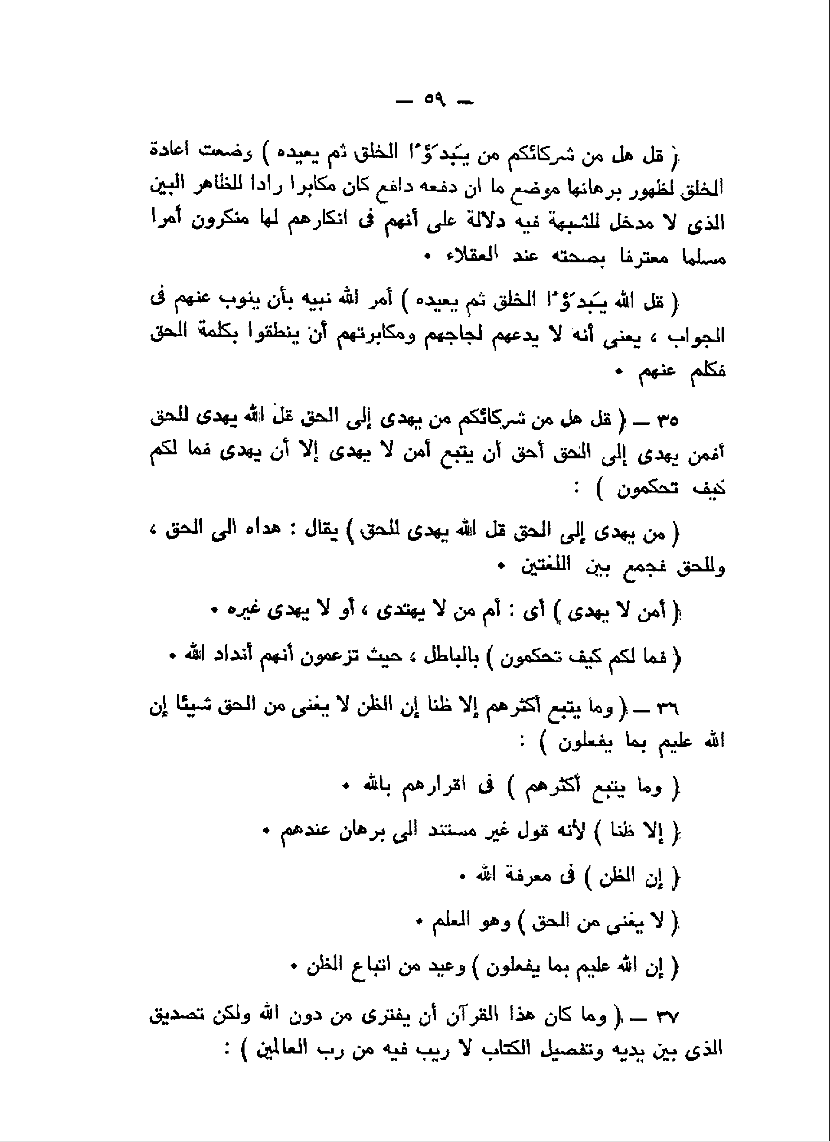 قُلْ هَلْ مِنْ شُرَكائِكُمْ مَنْ يَهْدِي إِلَى الْحَقِّ قُلِ اللَّهُ يَهْدِي لِلْحَقِّ أَفَمَنْ يَهْدِي إِلَى الْحَقِّ أَحَقُّ أَنْ يُتَّبَعَ أَمَّنْ لا يَهِدِّي إِلاَّ أَنْ يُهْدى فَما لَكُمْ كَيْفَ تَحْكُمُونَ (35) وَما يَتَّبِعُ أَكْثَرُهُمْ إِلاَّ ظَنًّا إِنَّ الظَّنَّ لا يُغْنِي مِنَ الْحَقِّ شَيْئاً إِنَّ اللَّهَ عَلِيمٌ بِما يَفْعَلُونَ (36) وَما كانَ هذَا الْقُرْآنُ أَنْ يُفْتَرى مِنْ دُونِ اللَّهِ وَلكِنْ تَصْدِيقَ الَّذِي بَيْنَ يَدَيْهِ وَتَفْصِيلَ الْكِتابِ لا رَيْبَ فِيهِ مِنْ رَبِّ الْعالَمِينَ (37)
