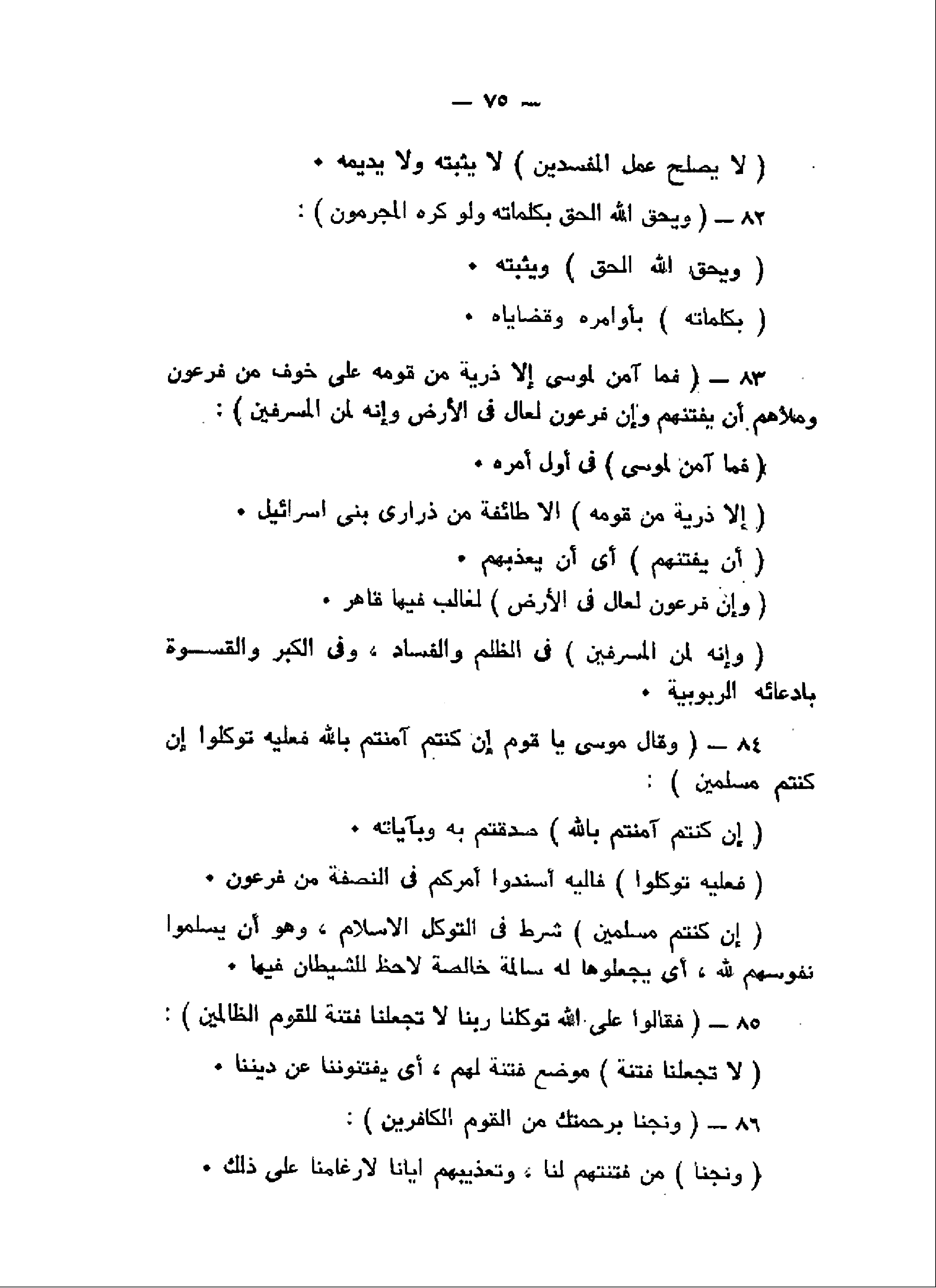 وَيُحِقُّ اللَّهُ الْحَقَّ بِكَلِماتِهِ وَلَوْ كَرِهَ الْمُجْرِمُونَ (82) فَما آمَنَ لِمُوسى إِلاَّ ذُرِّيَّةٌ مِنْ قَوْمِهِ عَلى خَوْفٍ مِنْ فِرْعَوْنَ وَمَلائِهِمْ أَنْ يَفْتِنَهُمْ وَإِنَّ فِرْعَوْنَ لَعالٍ فِي الْأَرْضِ وَإِنَّهُ لَمِنَ الْمُسْرِفِينَ (83) وَقالَ مُوسى يا قَوْمِ إِنْ كُنْتُمْ آمَنْتُمْ بِاللَّهِ فَعَلَيْهِ تَوَكَّلُوا إِنْ كُنْتُمْ مُسْلِمِينَ (84) فَقالُوا عَلَى اللَّهِ تَوَكَّلْنا رَبَّنا لا تَجْعَلْنا فِتْنَةً لِلْقَوْمِ الظَّالِمِينَ (85) وَنَجِّنا بِرَحْمَتِكَ مِنَ الْقَوْمِ الْكافِرِينَ (86)