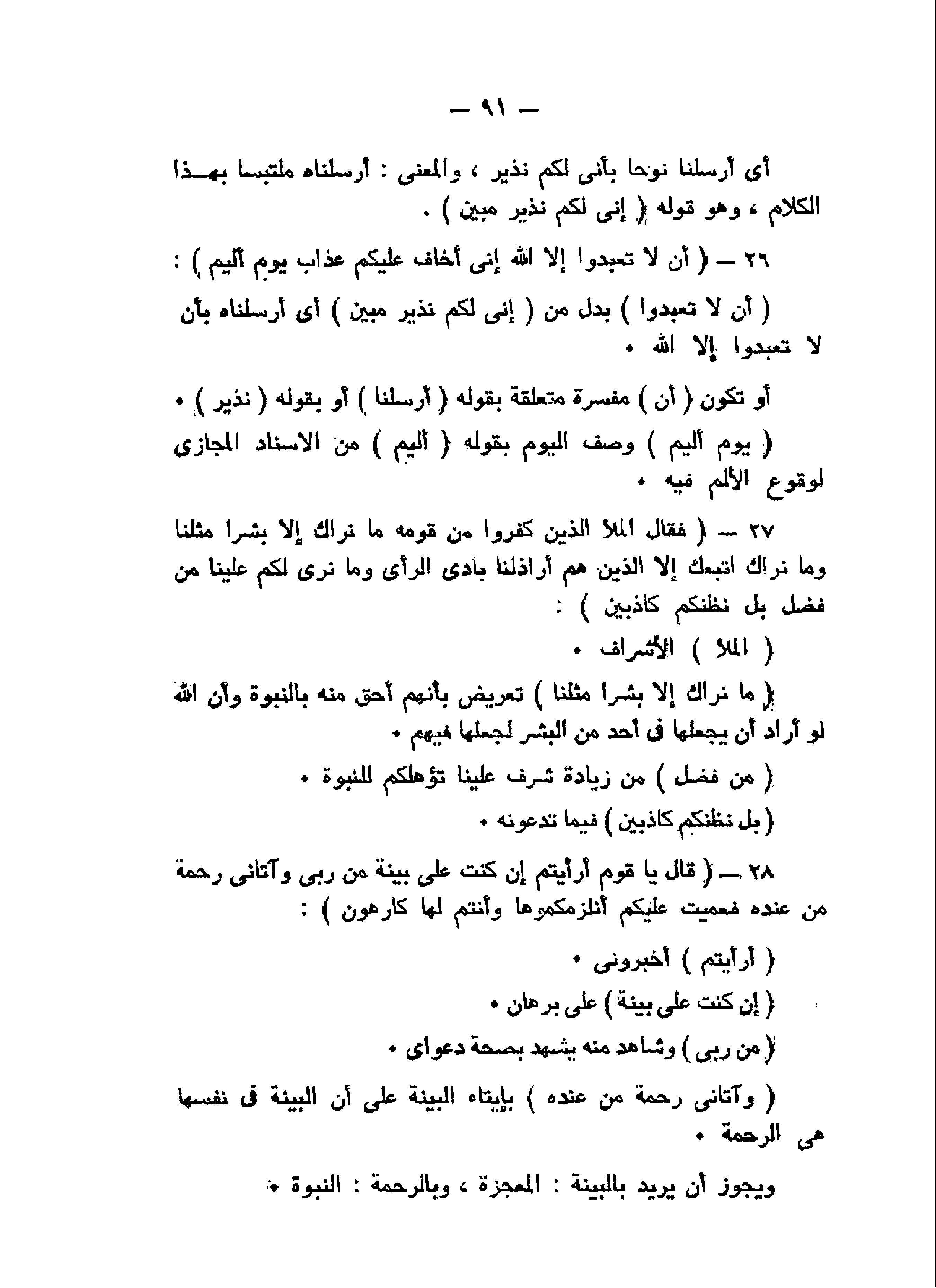 أَنْ لا تَعْبُدُوا إِلاَّ اللَّهَ إِنِّي أَخافُ عَلَيْكُمْ عَذابَ يَوْمٍ أَلِيمٍ (26) فَقالَ الْمَلَأُ الَّذِينَ كَفَرُوا مِنْ قَوْمِهِ ما نَراكَ إِلاَّ بَشَراً مِثْلَنا وَما نَراكَ اتَّبَعَكَ إِلاَّ الَّذِينَ هُمْ أَراذِلُنا بادِيَ الرَّأْيِ وَما نَرى لَكُمْ عَلَيْنا مِنْ فَضْلٍ بَلْ نَظُنُّكُمْ كاذِبِينَ (27) قالَ يا قَوْمِ أَرَأَيْتُمْ إِنْ كُنْتُ عَلى بَيِّنَةٍ مِنْ رَبِّي وَآتانِي رَحْمَةً مِنْ عِنْدِهِ فَعُمِّيَتْ عَلَيْكُمْ أَنُلْزِمُكُمُوها وَأَنْتُمْ لَها كارِهُونَ (28)