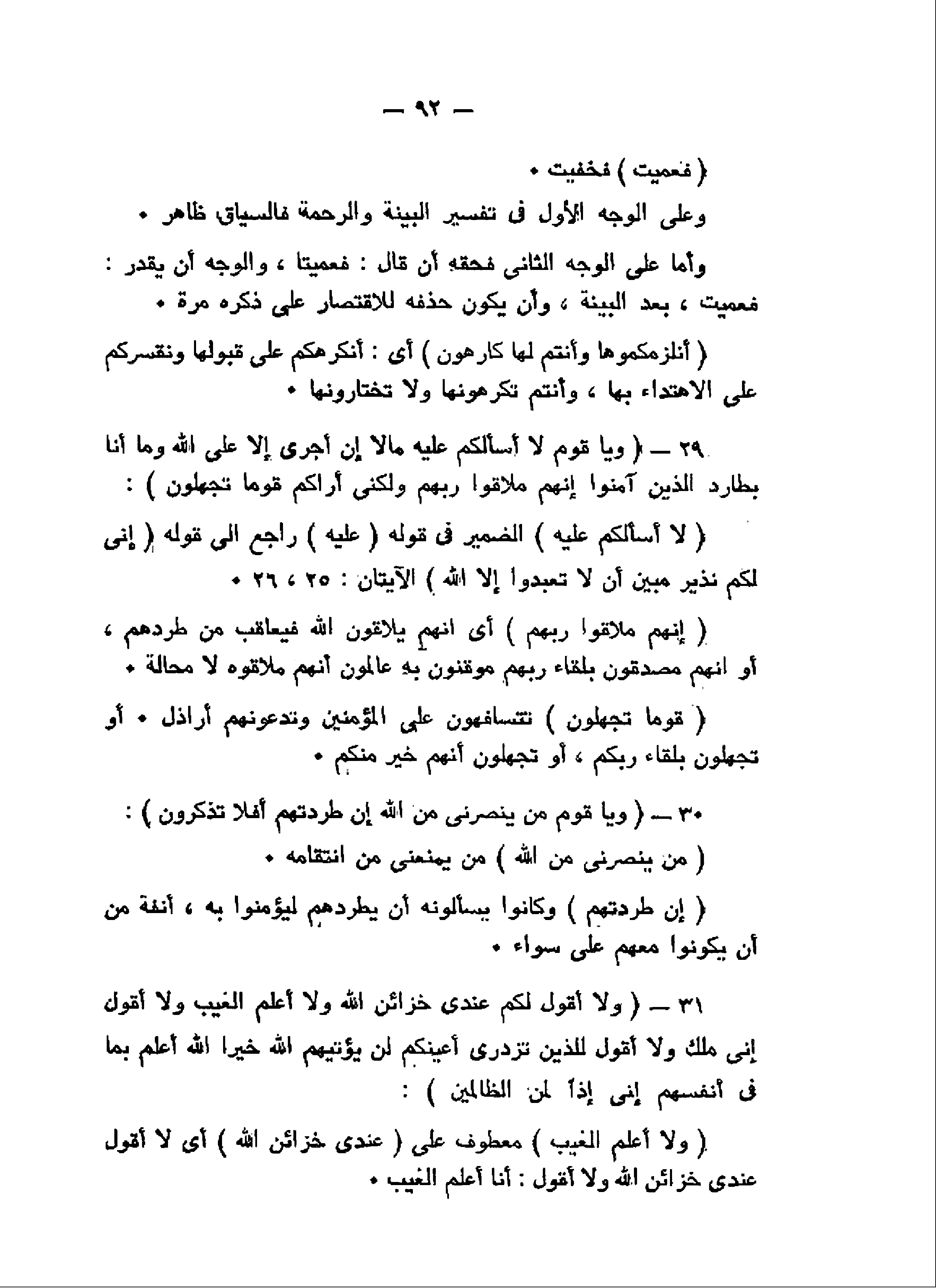 وَيا قَوْمِ لا أَسْئَلُكُمْ عَلَيْهِ مالاً إِنْ أَجرِيَ إِلاَّ عَلَى اللَّهِ وَما أَنَا بِطارِدِ الَّذِينَ آمَنُوا إِنَّهُمْ مُلاقُوا رَبِّهِمْ وَلكِنِّي أَراكُمْ قَوْماً تَجْهَلُونَ (29) وَيا قَوْمِ مَنْ يَنْصُرُنِي مِنَ اللَّهِ إِنْ طَرَدْتُهُمْ أَفَلا تَذَكَّرُونَ (30) وَلا أَقُولُ لَكُمْ عِنْدِي خَزائِنُ اللَّهِ وَلا أَعْلَمُ الْغَيْبَ وَلا أَقُولُ إِنِّي مَلَكٌ وَلا أَقُولُ لِلَّذِينَ تَزْدَرِي أَعْيُنُكُمْ لَنْ يُؤْتِيَهُمُ اللَّهُ خَيْراً اللَّهُ أَعْلَمُ بِما فِي أَنْفُسِهِمْ إِنِّي إِذاً لَمِنَ الظَّالِمِينَ (31)
