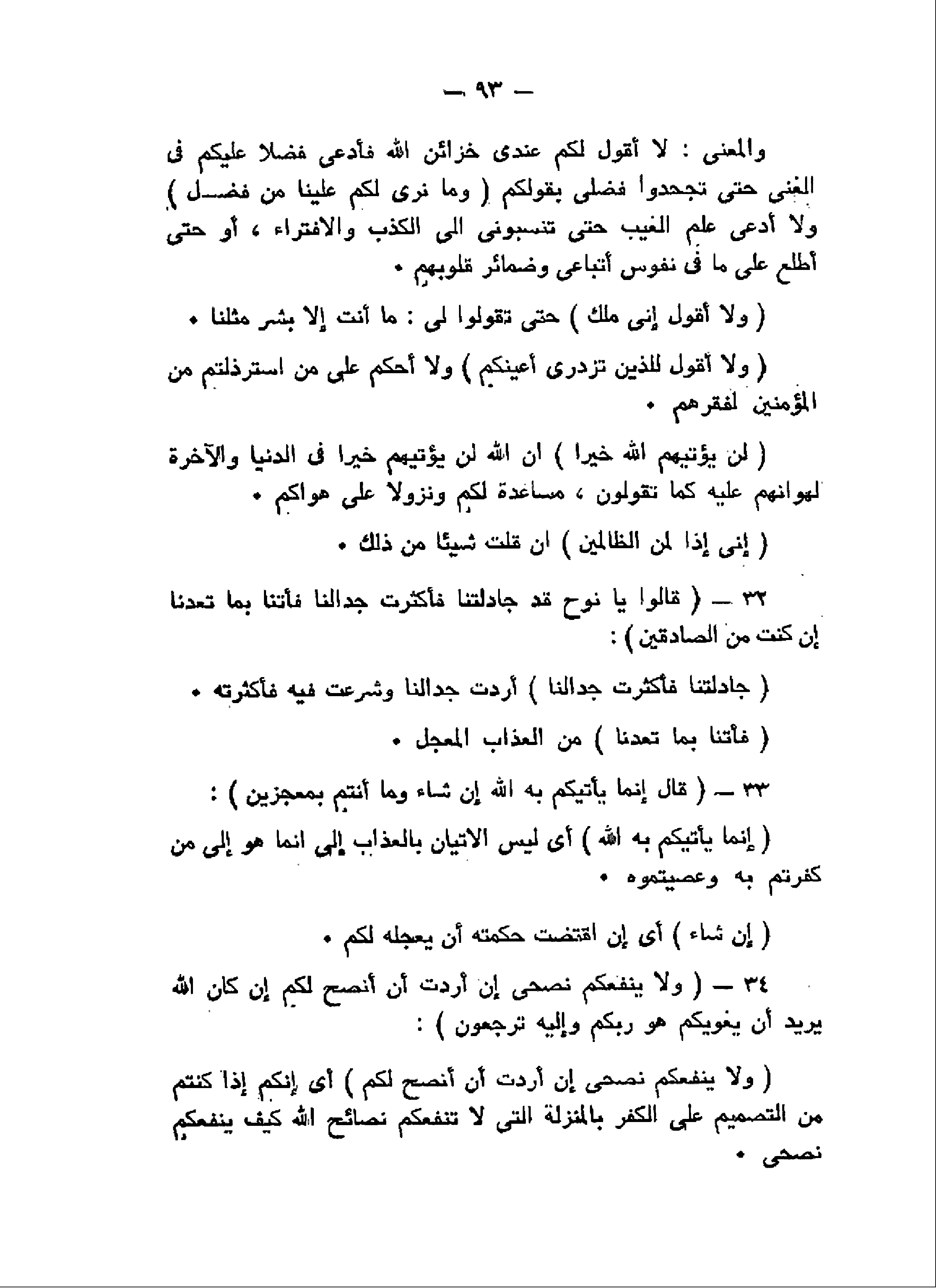 قالُوا يا نُوحُ قَدْ جادَلْتَنا فَأَكْثَرْتَ جِدالَنا فَأْتِنا بِما تَعِدُنا إِنْ كُنْتَ مِنَ الصَّادِقِينَ (32) قالَ إِنَّما يَأْتِيكُمْ بِهِ اللَّهُ إِنْ شاءَ وَما أَنْتُمْ بِمُعْجِزِينَ (33) وَلا يَنْفَعُكُمْ نُصْحِي إِنْ أَرَدْتُ أَنْ أَنْصَحَ لَكُمْ إِنْ كانَ اللَّهُ يُرِيدُ أَنْ يُغْوِيَكُمْ هُوَ رَبُّكُمْ وَإِلَيْهِ تُرْجَعُونَ (34)
