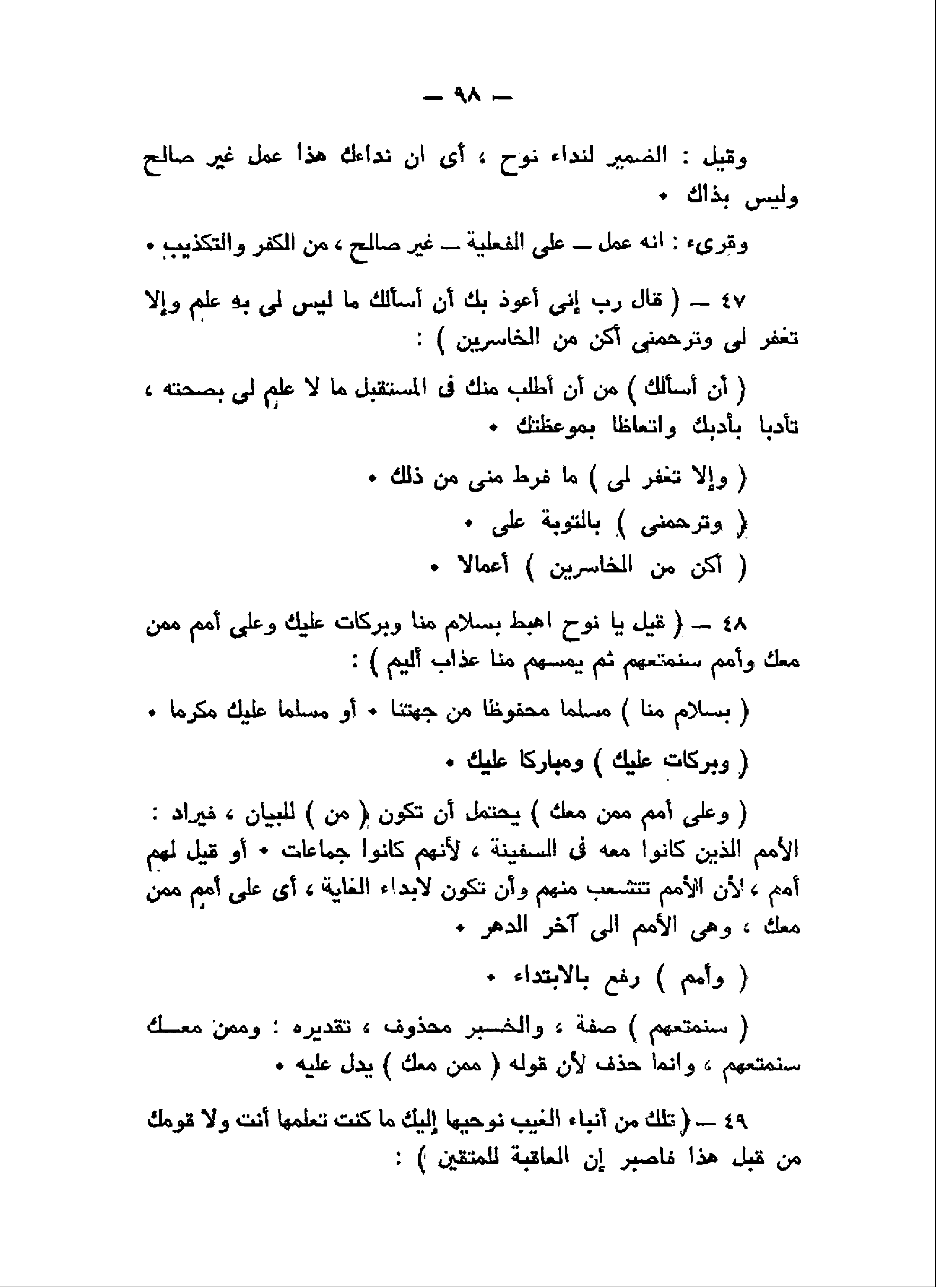 قالَ رَبِّ إِنِّي أَعُوذُ بِكَ أَنْ أَسْئَلَكَ ما لَيْسَ لِي بِهِ عِلْمٌ وَإِلاَّ تَغْفِرْ لِي وَتَرْحَمْنِي أَكُنْ مِنَ الْخاسِرِينَ (47) قِيلَ يا نُوحُ اهْبِطْ بِسَلامٍ مِنَّا وَبَرَكاتٍ عَلَيْكَ وَعَلى أُمَمٍ مِمَّنْ مَعَكَ وَأُمَمٌ سَنُمَتِّعُهُمْ ثُمَّ يَمَسُّهُمْ مِنَّا عَذابٌ أَلِيمٌ (48) تِلْكَ مِنْ أَنْباءِ الْغَيْبِ نُوحِيها إِلَيْكَ ما كُنْتَ تَعْلَمُها أَنْتَ وَلا قَوْمُكَ مِنْ قَبْلِ هذا فَاصْبِرْ إِنَّ الْعاقِبَةَ لِلْمُتَّقِينَ (49)