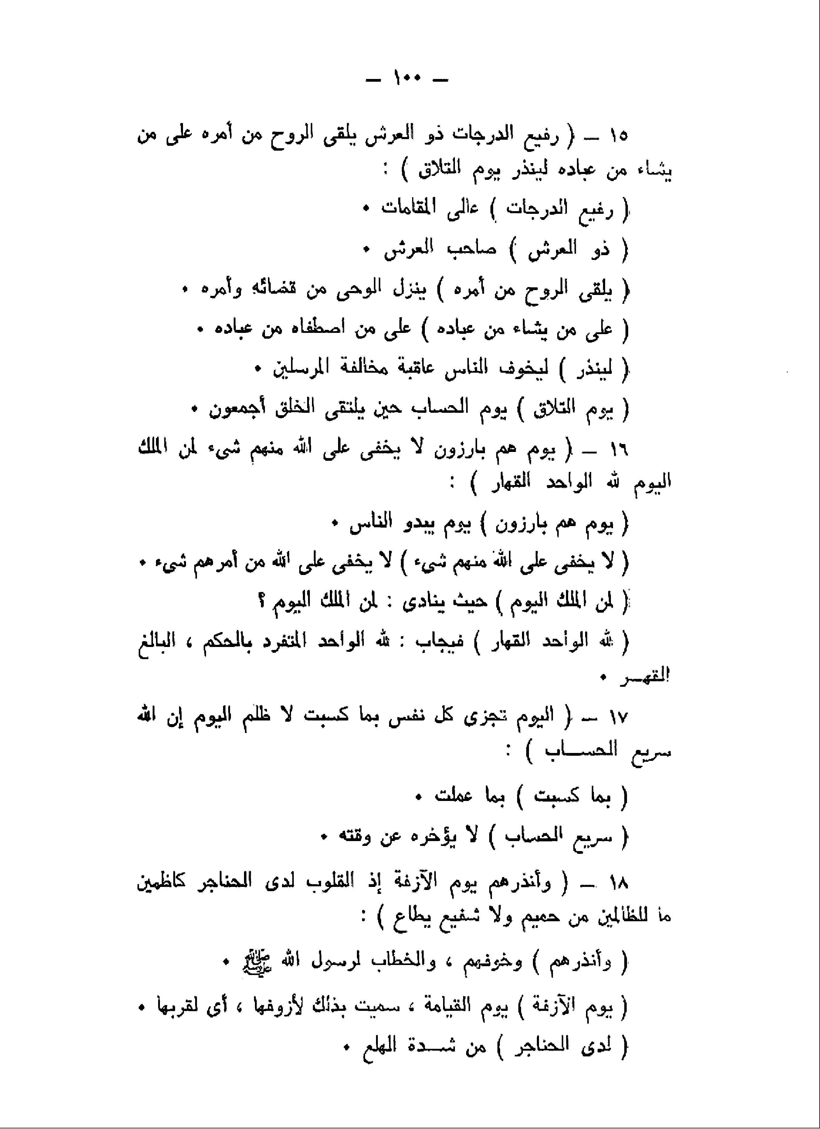 رَفِيعُ الدَّرَجاتِ ذُو الْعَرْشِ يُلْقِي الرُّوحَ مِنْ أَمْرِهِ عَلى مَنْ يَشاءُ مِنْ عِبادِهِ لِيُنْذِرَ يَوْمَ التَّلاقِ (15) يَوْمَ هُمْ بارِزُونَ لا يَخْفى عَلَى اللَّهِ مِنْهُمْ شَيْءٌ لِمَنِ الْمُلْكُ الْيَوْمَ لِلَّهِ الْواحِدِ الْقَهَّارِ (16) الْيَوْمَ تُجْزى كُلُّ نَفْسٍ بِما كَسَبَتْ لا ظُلْمَ الْيَوْمَ إِنَّ اللَّهَ سَرِيعُ الْحِسابِ (17) وَأَنْذِرْهُمْ يَوْمَ الْآزِفَةِ إِذِ الْقُلُوبُ لَدَى الْحَناجِرِ كاظِمِينَ ما لِلظَّالِمِينَ مِنْ حَمِيمٍ وَلا شَفِيعٍ يُطاعُ (18)