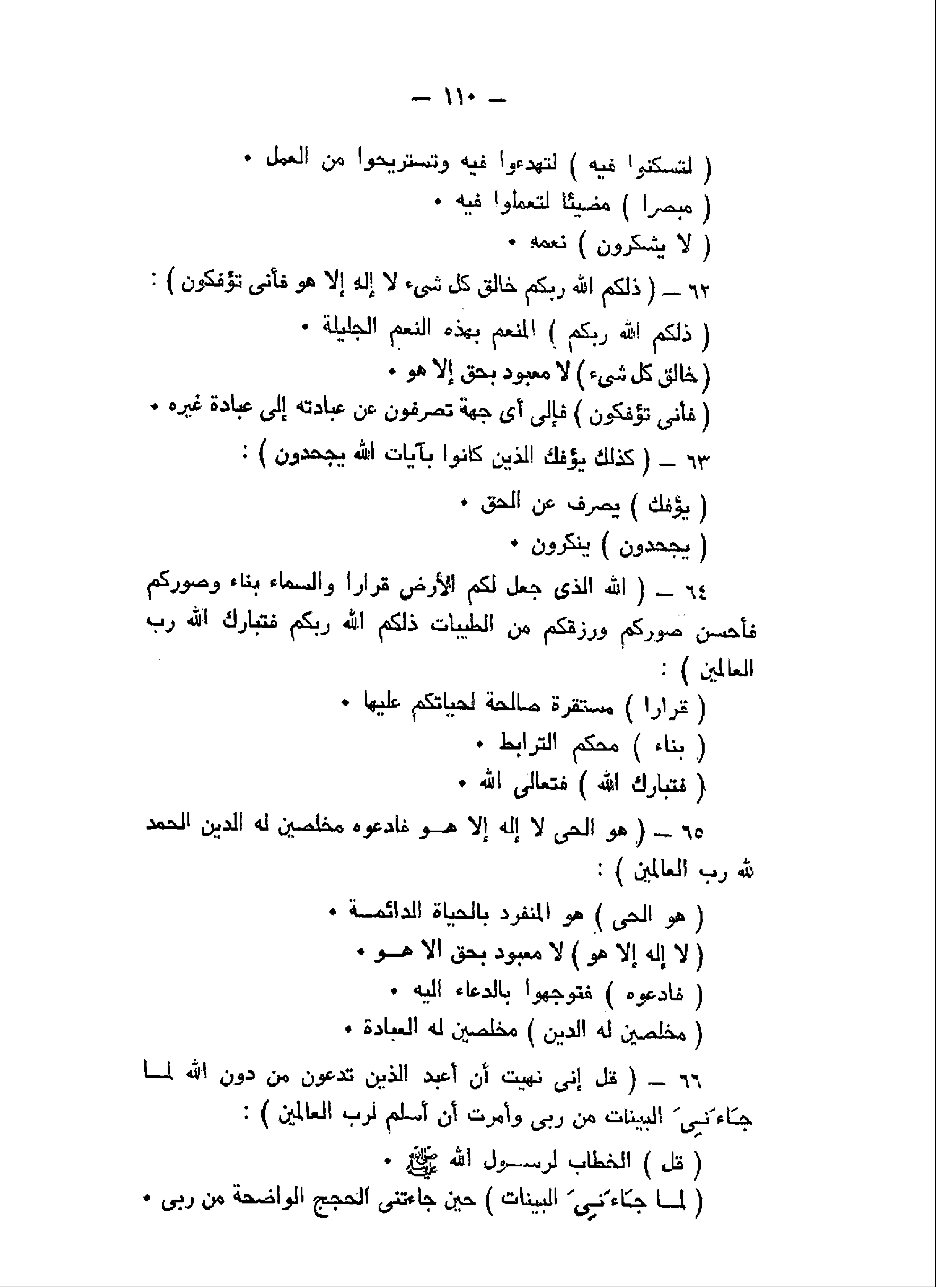 ذلِكُمُ اللَّهُ رَبُّكُمْ خالِقُ كُلِّ شَيْءٍ لا إِلهَ إِلاَّ هُوَ فَأَنَّى تُؤْفَكُونَ (62) كَذلِكَ يُؤْفَكُ الَّذِينَ كانُوا بِآياتِ اللَّهِ يَجْحَدُونَ (63) اللَّهُ الَّذِي جَعَلَ لَكُمُ الْأَرْضَ قَراراً وَالسَّماءَ بِناءً وَصَوَّرَكُمْ فَأَحْسَنَ صُوَرَكُمْ وَرَزَقَكُمْ مِنَ الطَّيِّباتِ ذلِكُمُ اللَّهُ رَبُّكُمْ فَتَبارَكَ اللَّهُ رَبُّ الْعالَمِينَ (64) هُوَ الْحَيُّ لا إِلهَ إِلاَّ هُوَ فَادْعُوهُ مُخْلِصِينَ لَهُ الدِّينَ الْحَمْدُ لِلَّهِ رَبِّ الْعالَمِينَ (65) قُلْ إِنِّي نُهِيتُ أَنْ أَعْبُدَ الَّذِينَ تَدْعُونَ مِنْ دُونِ اللَّهِ لَمَّا جاءَنِي الْبَيِّناتُ مِنْ رَبِّي وَأُمِرْتُ أَنْ أُسْلِمَ لِرَبِّ الْعالَمِينَ (66)