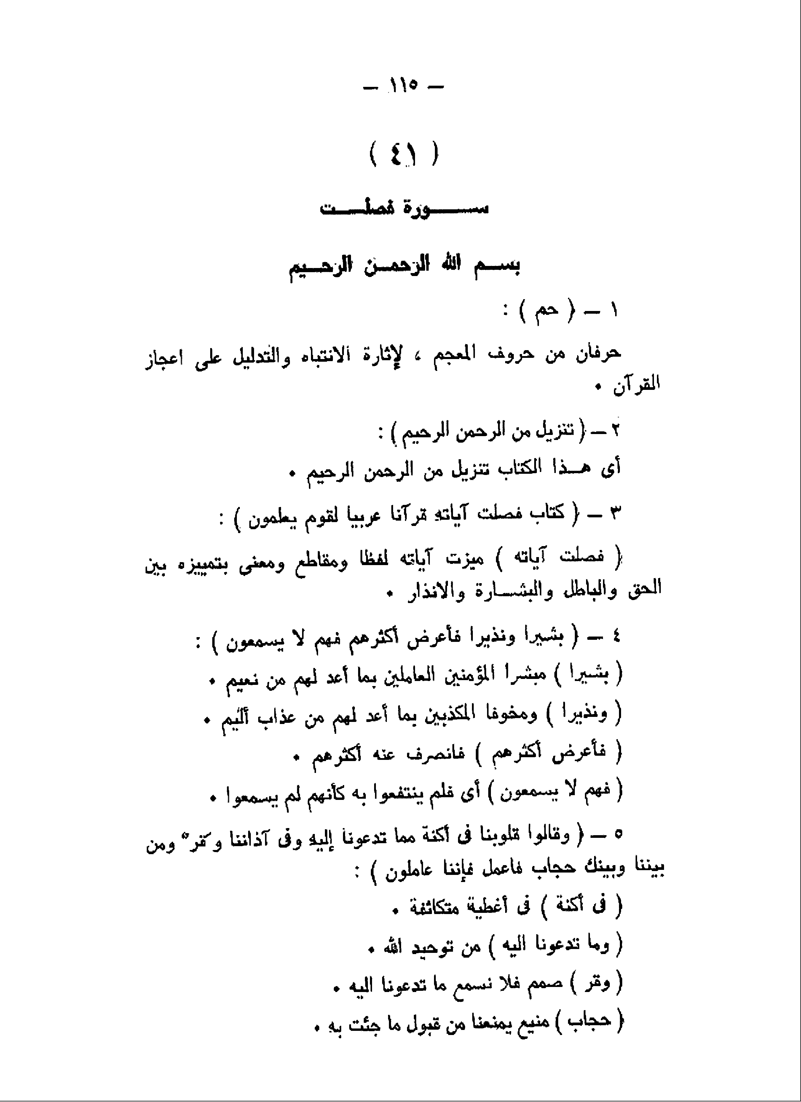 حم (1) تَنْزِيلٌ مِنَ الرَّحْمنِ الرَّحِيمِ (2) كِتابٌ فُصِّلَتْ آياتُهُ قُرْآناً عَرَبِيًّا لِقَوْمٍ يَعْلَمُونَ (3) بَشِيراً وَنَذِيراً فَأَعْرَضَ أَكْثَرُهُمْ فَهُمْ لا يَسْمَعُونَ (4)