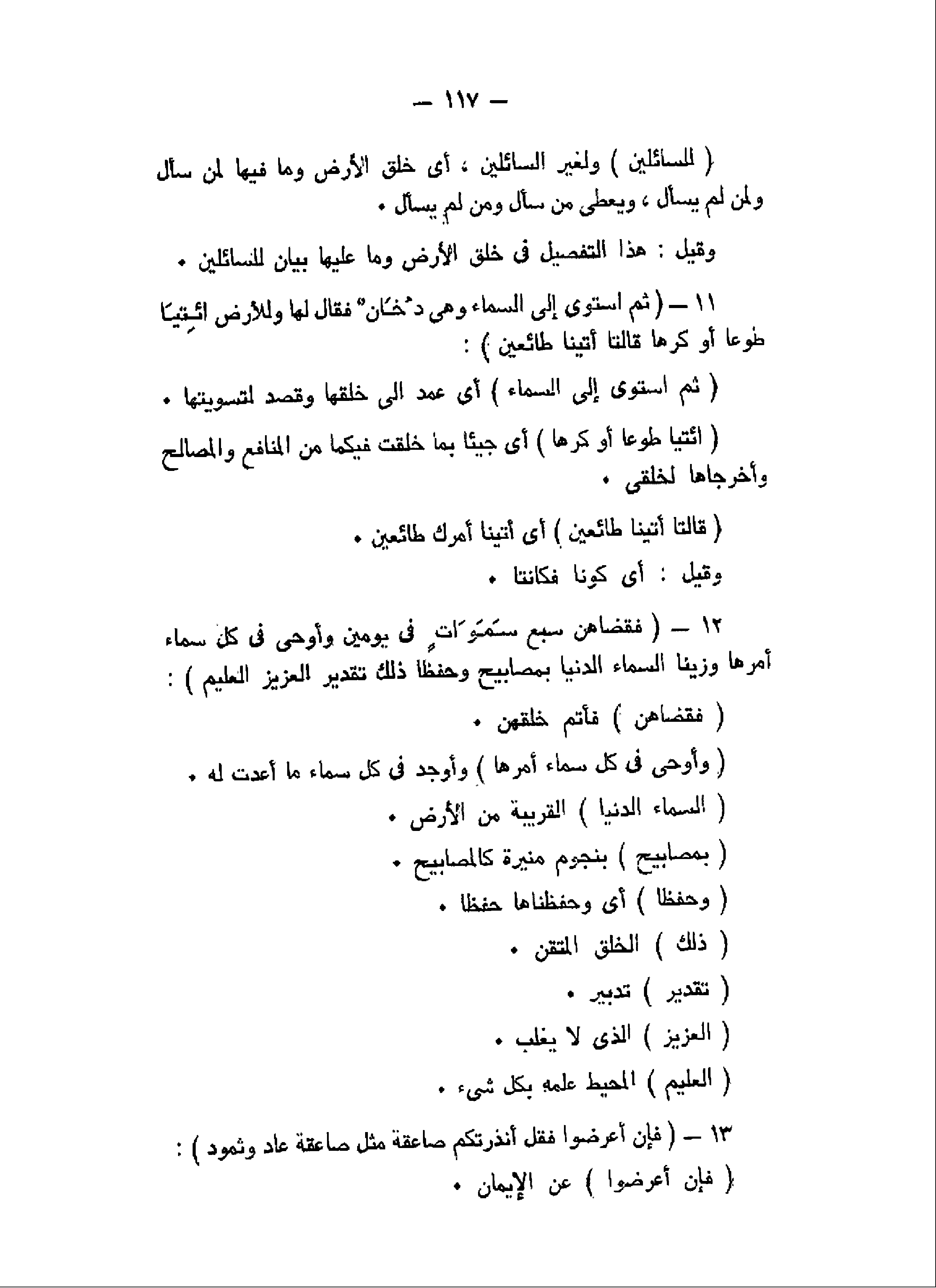 ثُمَّ اسْتَوى إِلَى السَّماءِ وَهِيَ دُخانٌ فَقالَ لَها وَلِلْأَرْضِ ائْتِيا طَوْعاً أَوْ كَرْهاً قالَتا أَتَيْنا طائِعِينَ (11) فَقَضاهُنَّ سَبْعَ سَماواتٍ فِي يَوْمَيْنِ وَأَوْحى فِي كُلِّ سَماءٍ أَمْرَها وَزَيَّنَّا السَّماءَ الدُّنْيا بِمَصابِيحَ وَحِفْظاً ذلِكَ تَقْدِيرُ الْعَزِيزِ الْعَلِيمِ (12) فَإِنْ أَعْرَضُوا فَقُلْ أَنْذَرْتُكُمْ صاعِقَةً مِثْلَ صاعِقَةِ عادٍ وَثَمُودَ (13)