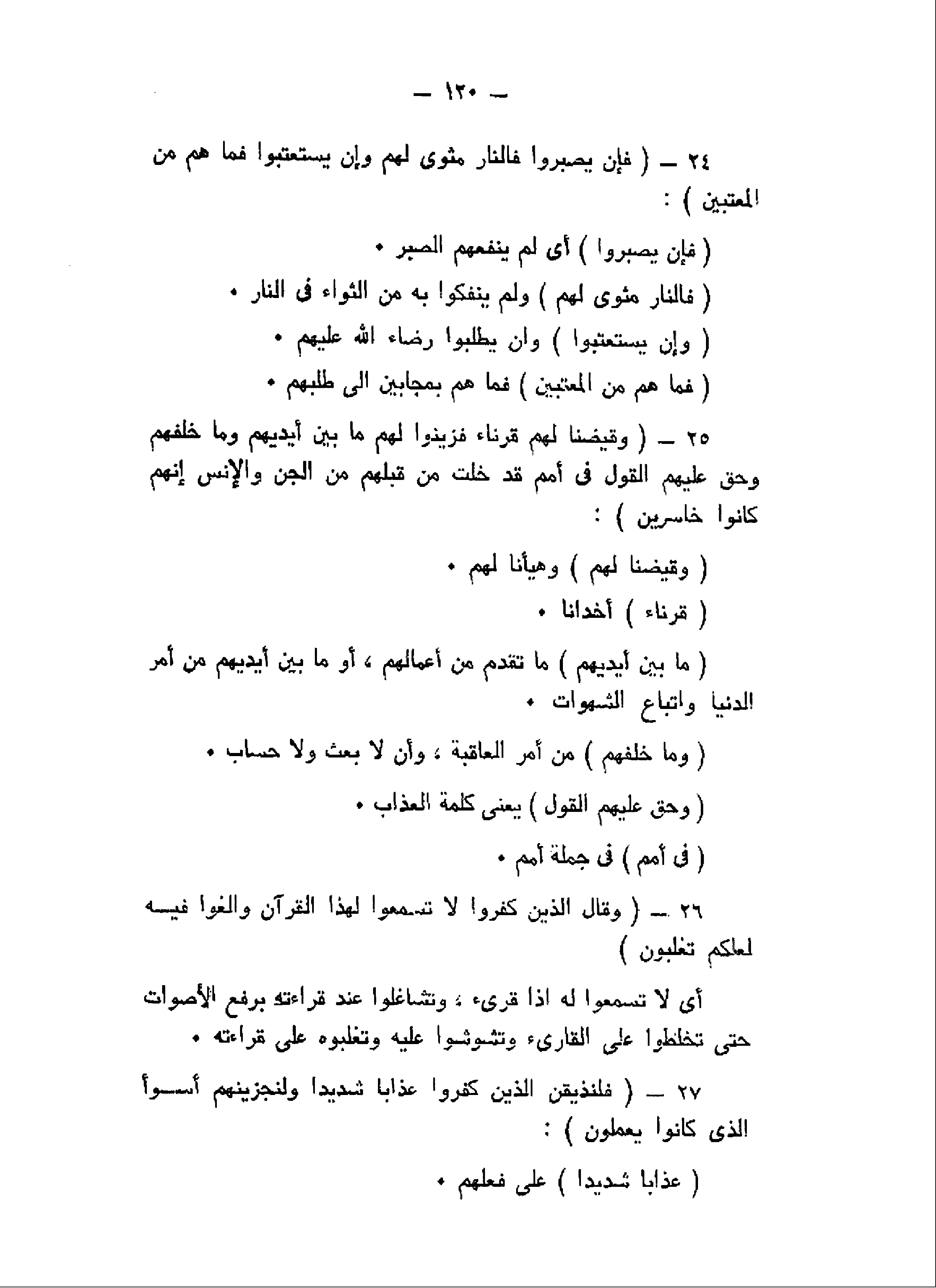 فَإِنْ يَصْبِرُوا فَالنَّارُ مَثْوىً لَهُمْ وَإِنْ يَسْتَعْتِبُوا فَما هُمْ مِنَ الْمُعْتَبِينَ (24) وَقَيَّضْنا لَهُمْ قُرَناءَ فَزَيَّنُوا لَهُمْ ما بَيْنَ أَيْدِيهِمْ وَما خَلْفَهُمْ وَحَقَّ عَلَيْهِمُ الْقَوْلُ فِي أُمَمٍ قَدْ خَلَتْ مِنْ قَبْلِهِمْ مِنَ الْجِنِّ وَالْإِنْسِ إِنَّهُمْ كانُوا خاسِرِينَ (25) وَقالَ الَّذِينَ كَفَرُوا لا تَسْمَعُوا لِهذَا الْقُرْآنِ وَالْغَوْا فِيهِ لَعَلَّكُمْ تَغْلِبُونَ (26) فَلَنُذِيقَنَّ الَّذِينَ كَفَرُوا عَذاباً شَدِيداً وَلَنَجْزِيَنَّهُمْ أَسْوَأَ الَّذِي كانُوا يَعْمَلُونَ (27)