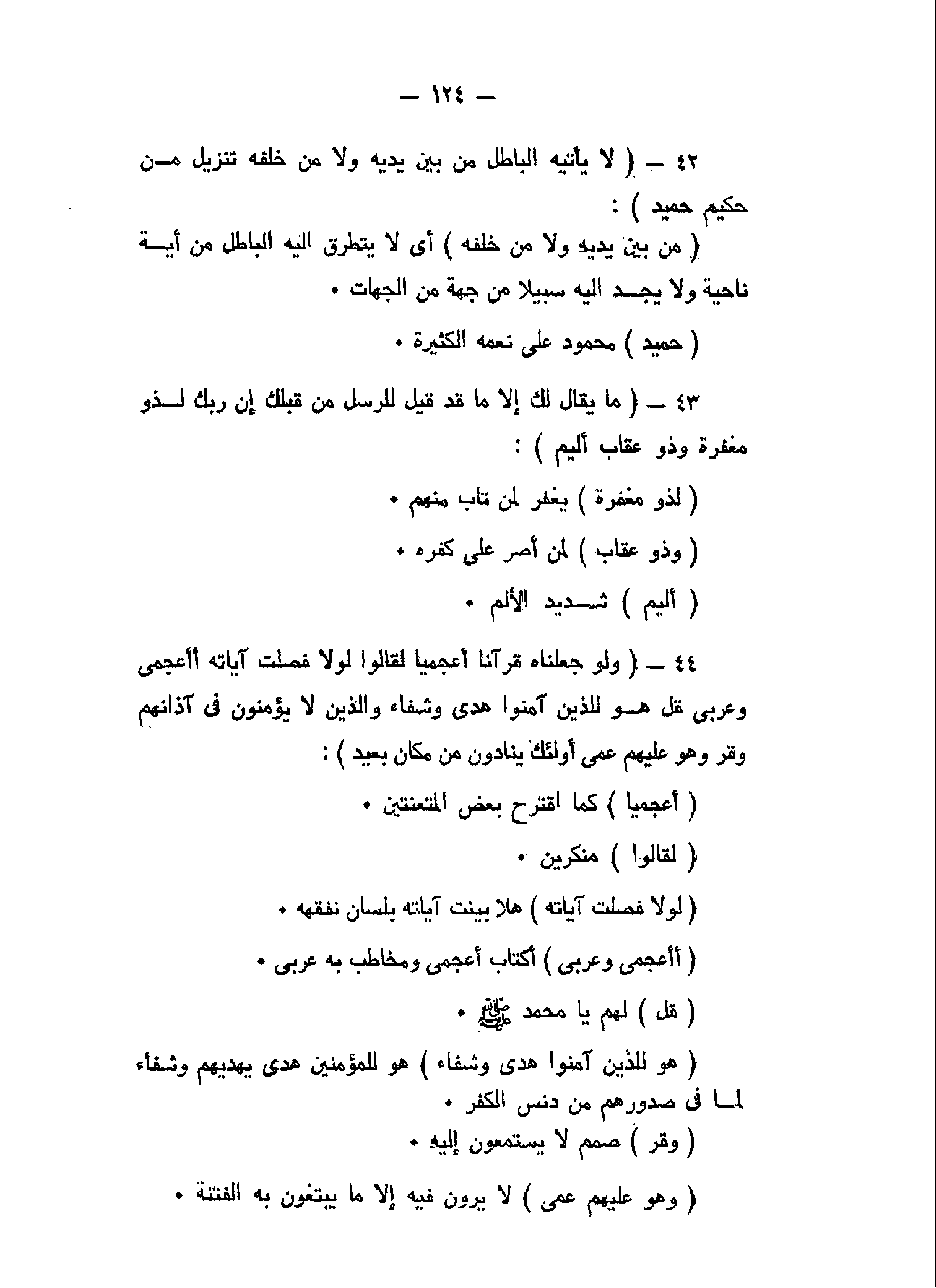 لا يَأْتِيهِ الْباطِلُ مِنْ بَيْنِ يَدَيْهِ وَلا مِنْ خَلْفِهِ تَنْزِيلٌ مِنْ حَكِيمٍ حَمِيدٍ (42) ما يُقالُ لَكَ إِلاَّ ما قَدْ قِيلَ لِلرُّسُلِ مِنْ قَبْلِكَ إِنَّ رَبَّكَ لَذُو مَغْفِرَةٍ وَذُو عِقابٍ أَلِيمٍ (43) وَلَوْ جَعَلْناهُ قُرْآناً أَعْجَمِيًّا لَقالُوا لَوْلا فُصِّلَتْ آياتُهُءَ أَعْجَمِيٌّ وَعَرَبِيٌّ قُلْ هُوَ لِلَّذِينَ آمَنُوا هُدىً وَشِفاءٌ وَالَّذِينَ لا يُؤْمِنُونَ فِي آذانِهِمْ وَقْرٌ وَهُوَ عَلَيْهِمْ عَمًى أُولئِكَ يُنادَوْنَ مِنْ مَكانٍ بَعِيدٍ (44)