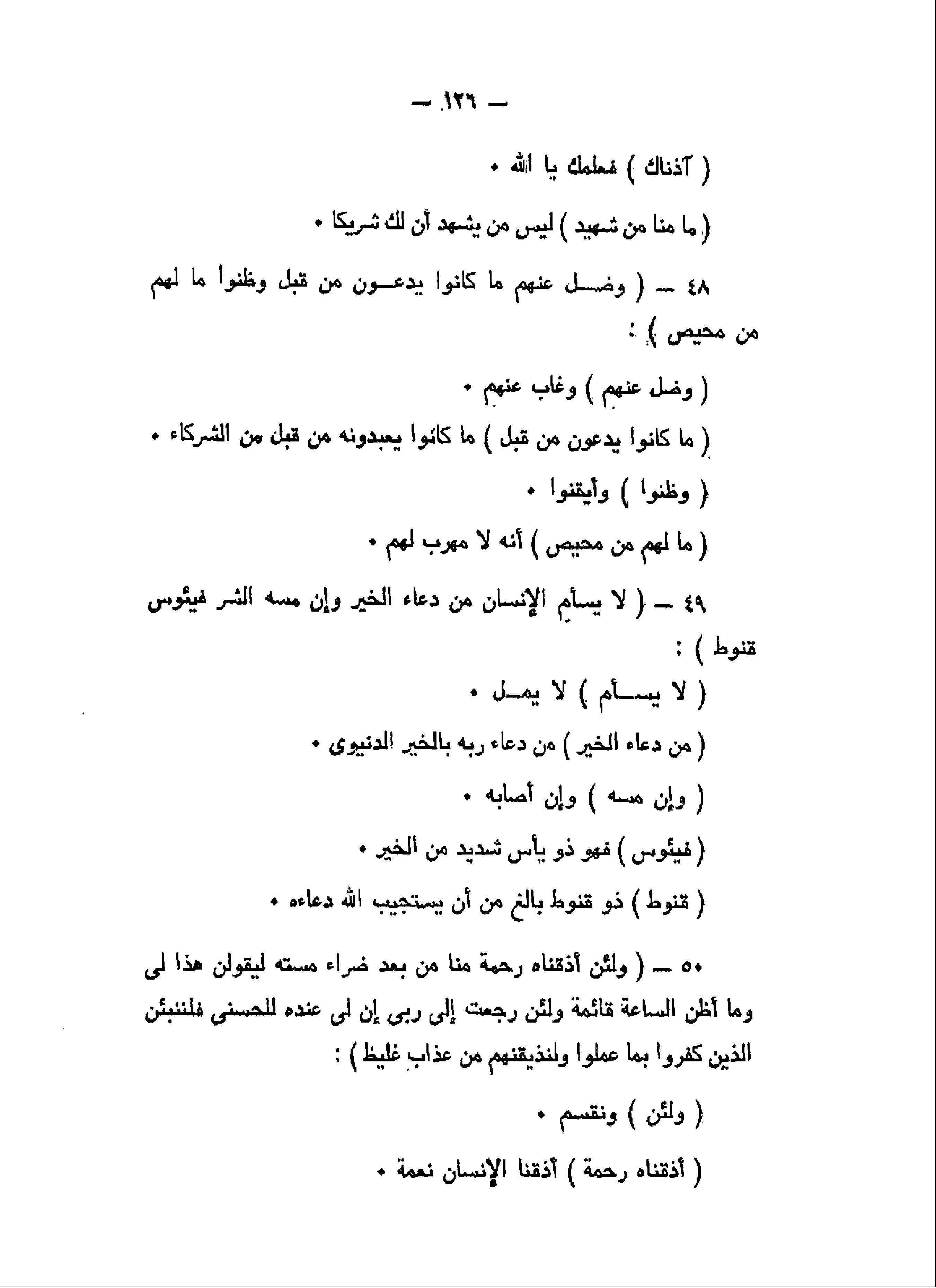 وَضَلَّ عَنْهُمْ ما كانُوا يَدْعُونَ مِنْ قَبْلُ وَظَنُّوا ما لَهُمْ مِنْ مَحِيصٍ (48) لا يَسْأَمُ الْإِنْسانُ مِنْ دُعاءِ الْخَيْرِ وَإِنْ مَسَّهُ الشَّرُّ فَيَؤُسٌ قَنُوطٌ (49) وَلَئِنْ أَذَقْناهُ رَحْمَةً مِنَّا مِنْ بَعْدِ ضَرَّاءَ مَسَّتْهُ لَيَقُولَنَّ هذا لِي وَما أَظُنُّ السَّاعَةَ قائِمَةً وَلَئِنْ رُجِعْتُ إِلى رَبِّي إِنَّ لِي عِنْدَهُ لَلْحُسْنى فَلَنُنَبِّئَنَّ الَّذِينَ كَفَرُوا بِما عَمِلُوا وَلَنُذِيقَنَّهُمْ مِنْ عَذابٍ غَلِيظٍ (50)