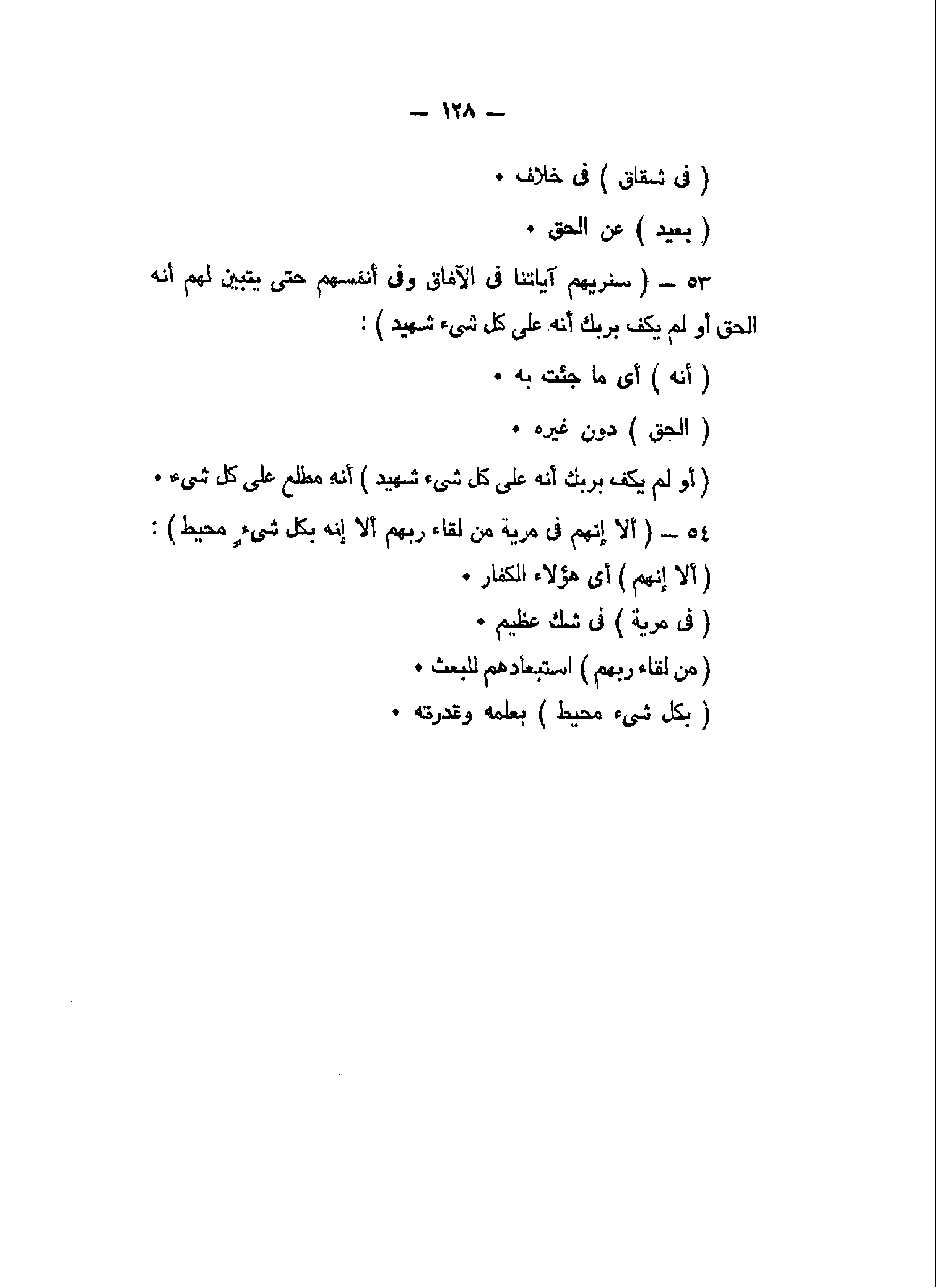 سَنُرِيهِمْ آياتِنا فِي الْآفاقِ وَفِي أَنْفُسِهِمْ حَتَّى يَتَبَيَّنَ لَهُمْ أَنَّهُ الْحَقُّ أَوَلَمْ يَكْفِ بِرَبِّكَ أَنَّهُ عَلى كُلِّ شَيْءٍ شَهِيدٌ (53) أَلا إِنَّهُمْ فِي مِرْيَةٍ مِنْ لِقاءِ رَبِّهِمْ أَلا إِنَّهُ بِكُلِّ شَيْءٍ مُحِيطٌ (54)