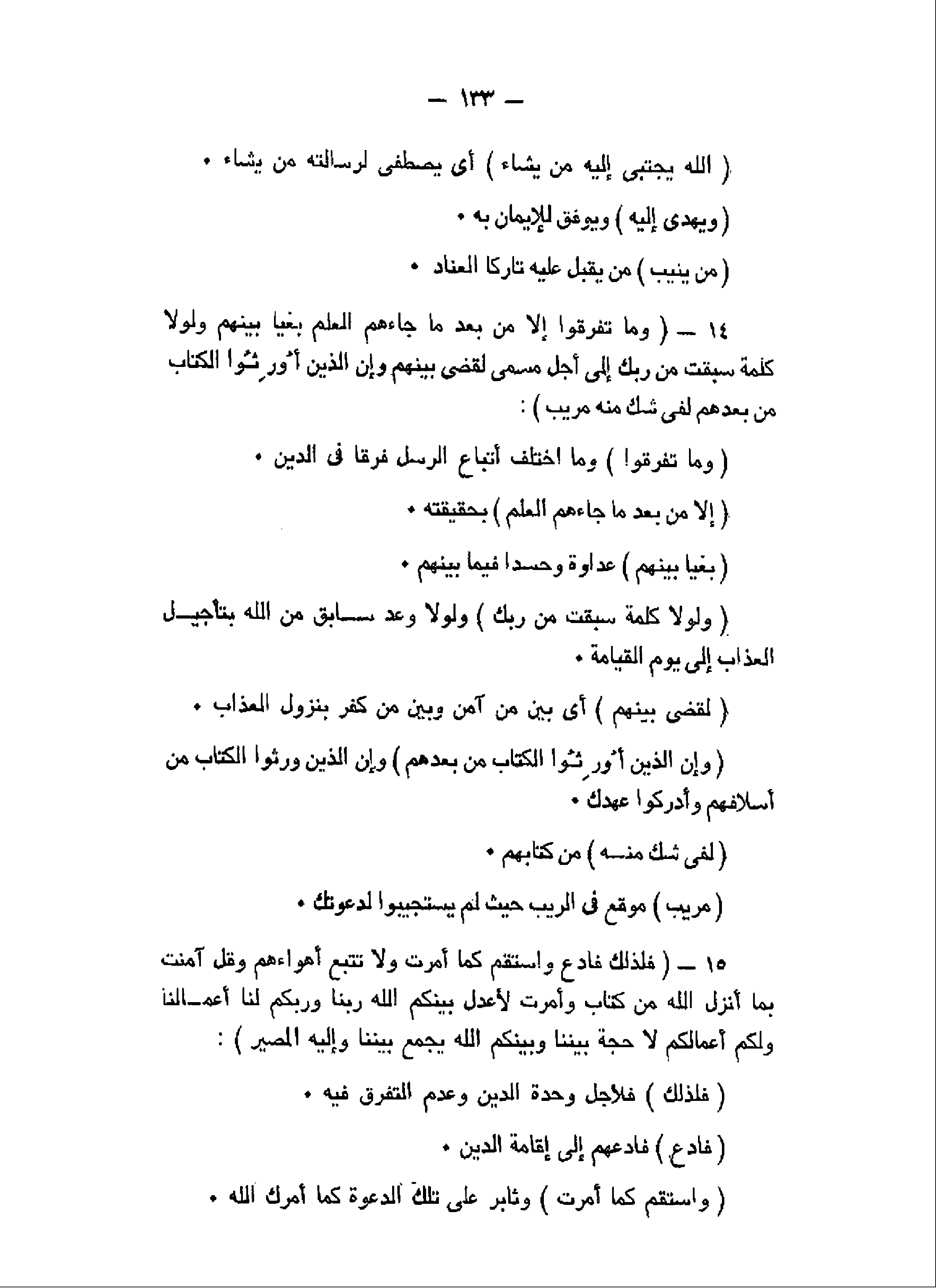 وَما تَفَرَّقُوا إِلاَّ مِنْ بَعْدِ ما جاءَهُمُ الْعِلْمُ بَغْياً بَيْنَهُمْ وَلَوْلا كَلِمَةٌ سَبَقَتْ مِنْ رَبِّكَ إِلى أَجَلٍ مُسَمًّى لَقُضِيَ بَيْنَهُمْ وَإِنَّ الَّذِينَ أُورِثُوا الْكِتابَ مِنْ بَعْدِهِمْ لَفِي شَكٍّ مِنْهُ مُرِيبٍ (14) فَلِذلِكَ فَادْعُ وَاسْتَقِمْ كَما أُمِرْتَ وَلا تَتَّبِعْ أَهْواءَهُمْ وَقُلْ آمَنْتُ بِما أَنْزَلَ اللَّهُ مِنْ كِتابٍ وَأُمِرْتُ لِأَعْدِلَ بَيْنَكُمُ اللَّهُ رَبُّنا وَرَبُّكُمْ لَنا أَعْمالُنا وَلَكُمْ أَعْمالُكُمْ لا حُجَّةَ بَيْنَنا وَبَيْنَكُمُ اللَّهُ يَجْمَعُ بَيْنَنا وَإِلَيْهِ الْمَصِيرُ (15)