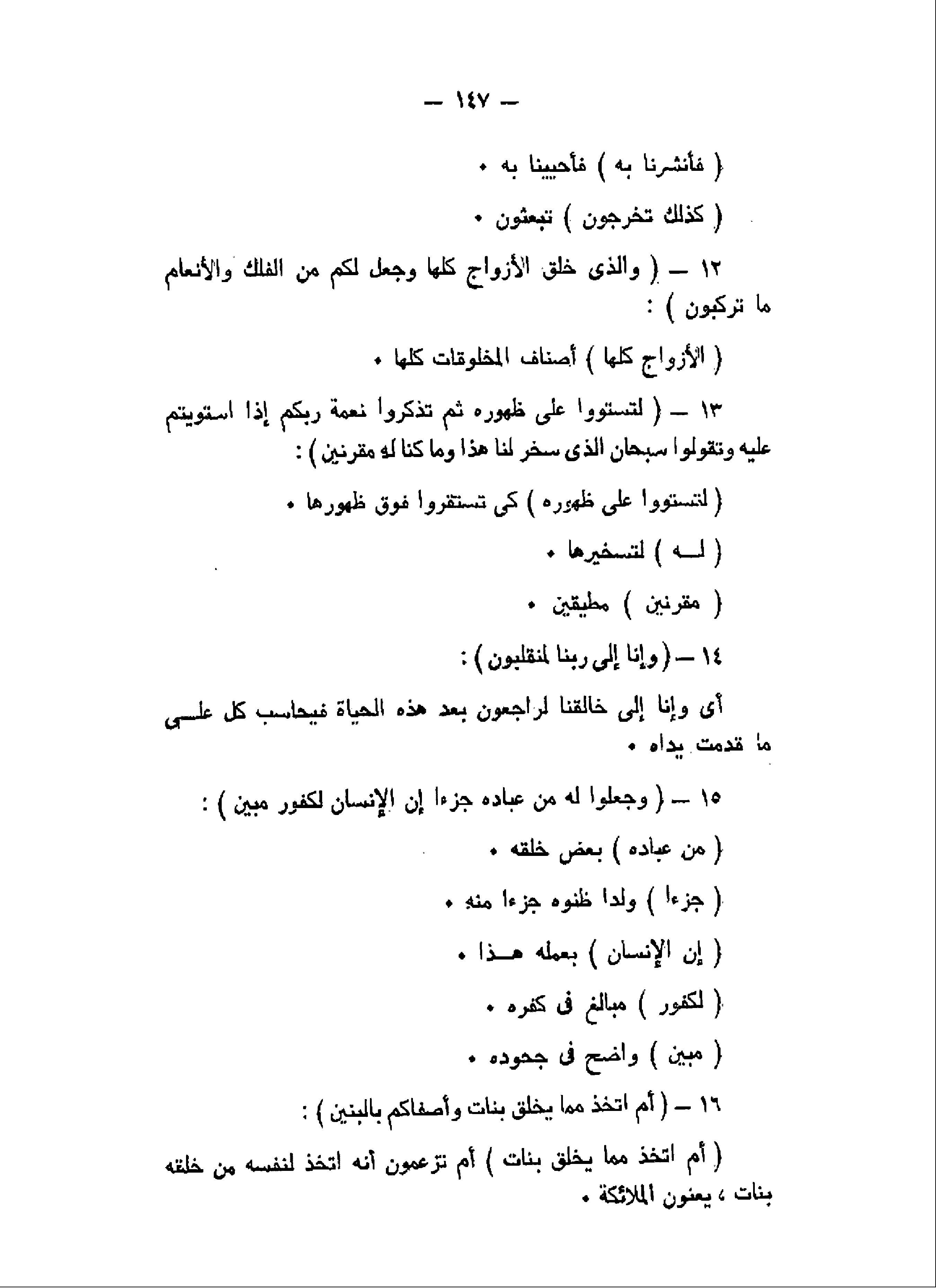 وَالَّذِي خَلَقَ الْأَزْواجَ كُلَّها وَجَعَلَ لَكُمْ مِنَ الْفُلْكِ وَالْأَنْعامِ ما تَرْكَبُونَ (12) لِتَسْتَوُوا عَلى ظُهُورِهِ ثُمَّ تَذْكُرُوا نِعْمَةَ رَبِّكُمْ إِذَا اسْتَوَيْتُمْ عَلَيْهِ وَتَقُولُوا سُبْحانَ الَّذِي سَخَّرَ لَنا هذا وَما كُنَّا لَهُ مُقْرِنِينَ (13) وَإِنَّا إِلى رَبِّنا لَمُنْقَلِبُونَ (14) وَجَعَلُوا لَهُ مِنْ عِبادِهِ جُزْءاً إِنَّ الْإِنْسانَ لَكَفُورٌ مُبِينٌ (15) أَمِ اتَّخَذَ مِمَّا يَخْلُقُ بَناتٍ وَأَصْفاكُمْ بِالْبَنِينَ (16)