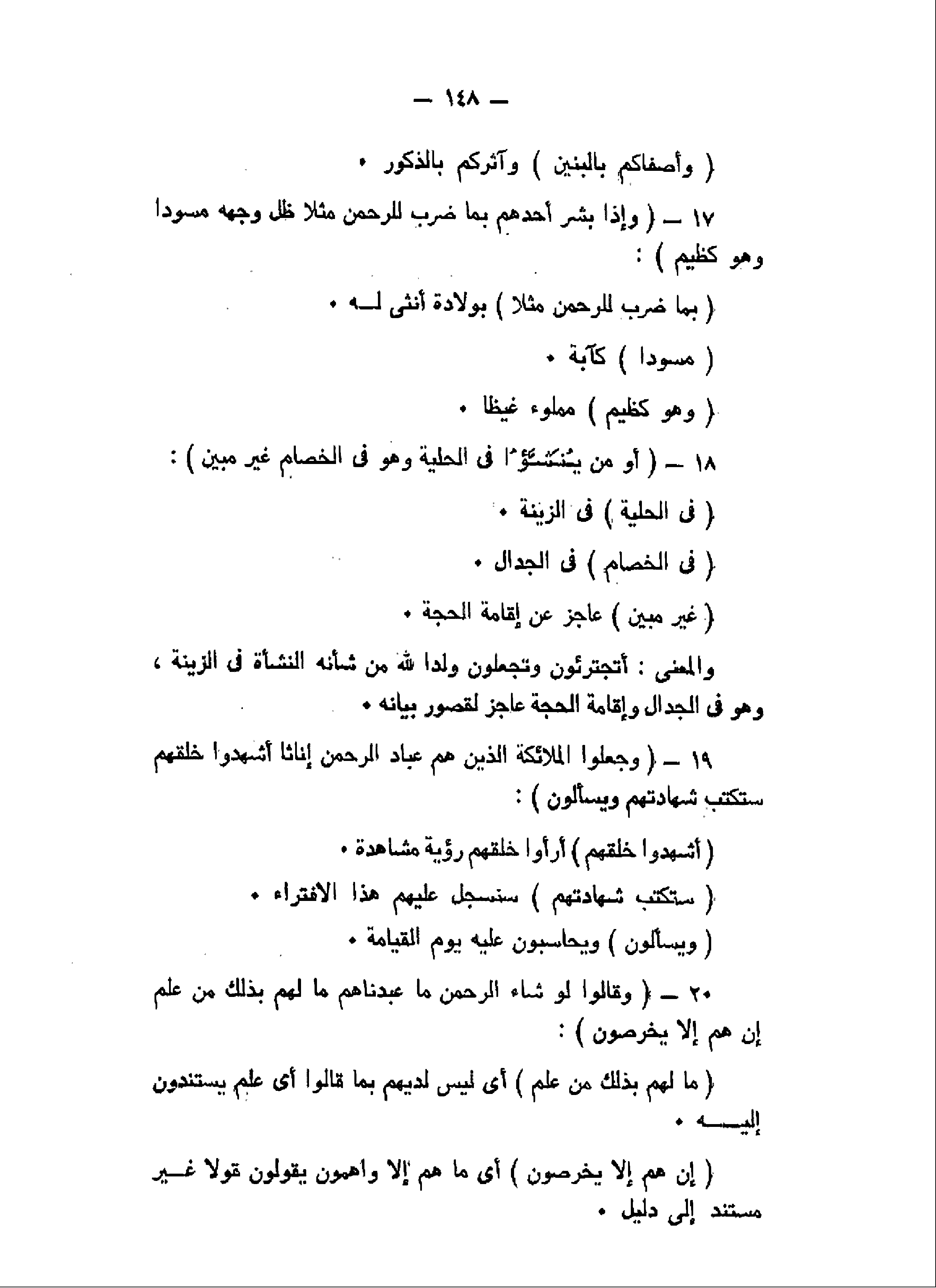 وَإِذا بُشِّرَ أَحَدُهُمْ بِما ضَرَبَ لِلرَّحْمنِ مَثَلاً ظَلَّ وَجْهُهُ مُسْوَدًّا وَهُوَ كَظِيمٌ (17) أَوَمَنْ يُنَشَّؤُا فِي الْحِلْيَةِ وَهُوَ فِي الْخِصامِ غَيْرُ مُبِينٍ (18) وَجَعَلُوا الْمَلائِكَةَ الَّذِينَ هُمْ عِبادُ الرَّحْمنِ إِناثاً أَشَهِدُوا خَلْقَهُمْ سَتُكْتَبُ شَهادَتُهُمْ وَيُسْئَلُونَ (19) وَقالُوا لَوْ شاءَ الرَّحْمنُ ما عَبَدْناهُمْ ما لَهُمْ بِذلِكَ مِنْ عِلْمٍ إِنْ هُمْ إِلاَّ يَخْرُصُونَ (20)