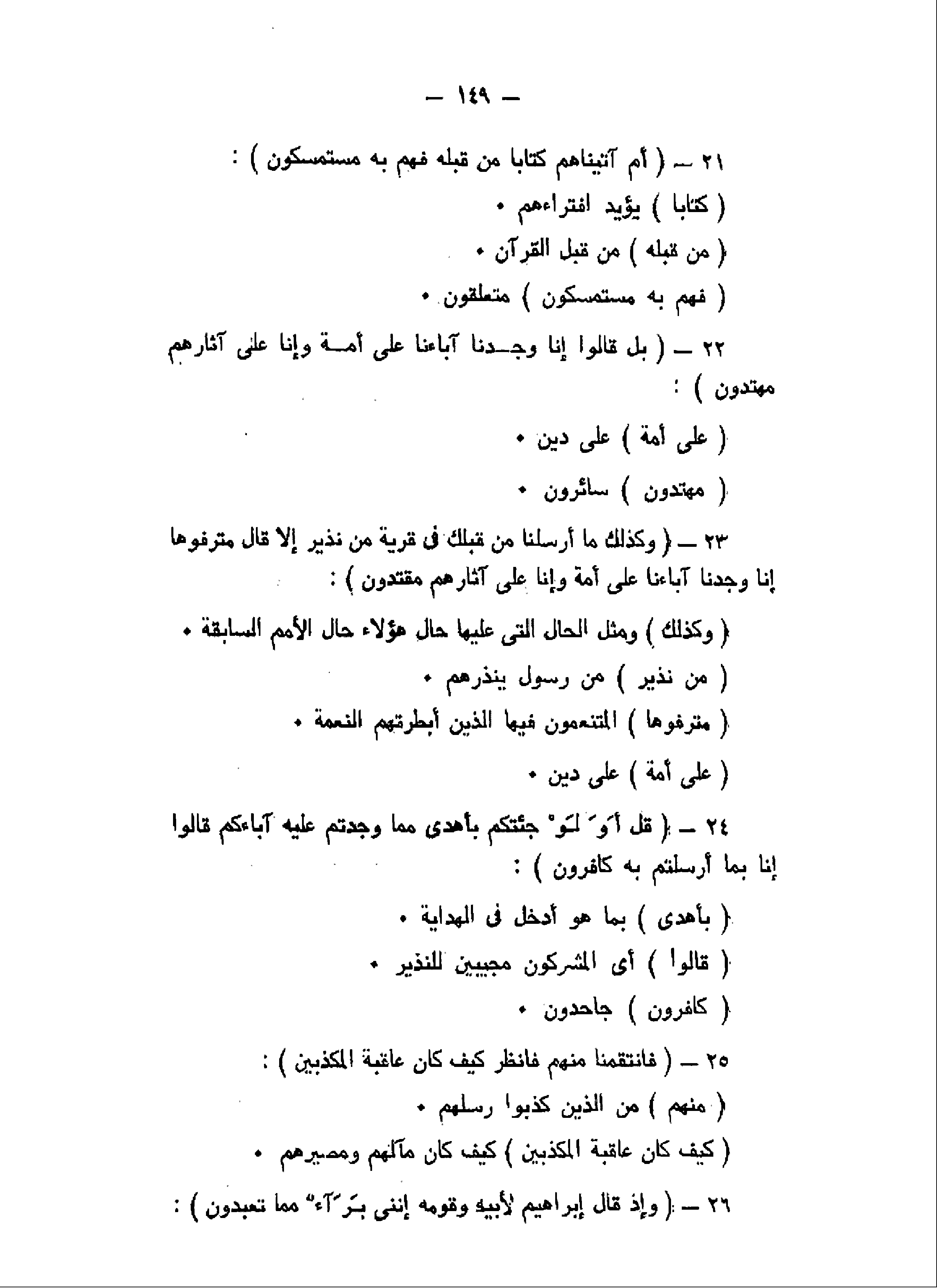 أَمْ آتَيْناهُمْ كِتاباً مِنْ قَبْلِهِ فَهُمْ بِهِ مُسْتَمْسِكُونَ (21) بَلْ قالُوا إِنَّا وَجَدْنا آباءَنا عَلى أُمَّةٍ وَإِنَّا عَلى آثارِهِمْ مُهْتَدُونَ (22) وَكَذلِكَ ما أَرْسَلْنا مِنْ قَبْلِكَ فِي قَرْيَةٍ مِنْ نَذِيرٍ إِلاَّ قالَ مُتْرَفُوها إِنَّا وَجَدْنا آباءَنا عَلى أُمَّةٍ وَإِنَّا عَلى آثارِهِمْ مُقْتَدُونَ (23) قالَ أَوَلَوْ جِئْتُكُمْ بِأَهْدى مِمَّا وَجَدْتُمْ عَلَيْهِ آباءَكُمْ قالُوا إِنَّا بِما أُرْسِلْتُمْ بِهِ كافِرُونَ (24) فَانْتَقَمْنا مِنْهُمْ فَانْظُرْ كَيْفَ كانَ عاقِبَةُ الْمُكَذِّبِينَ (25)