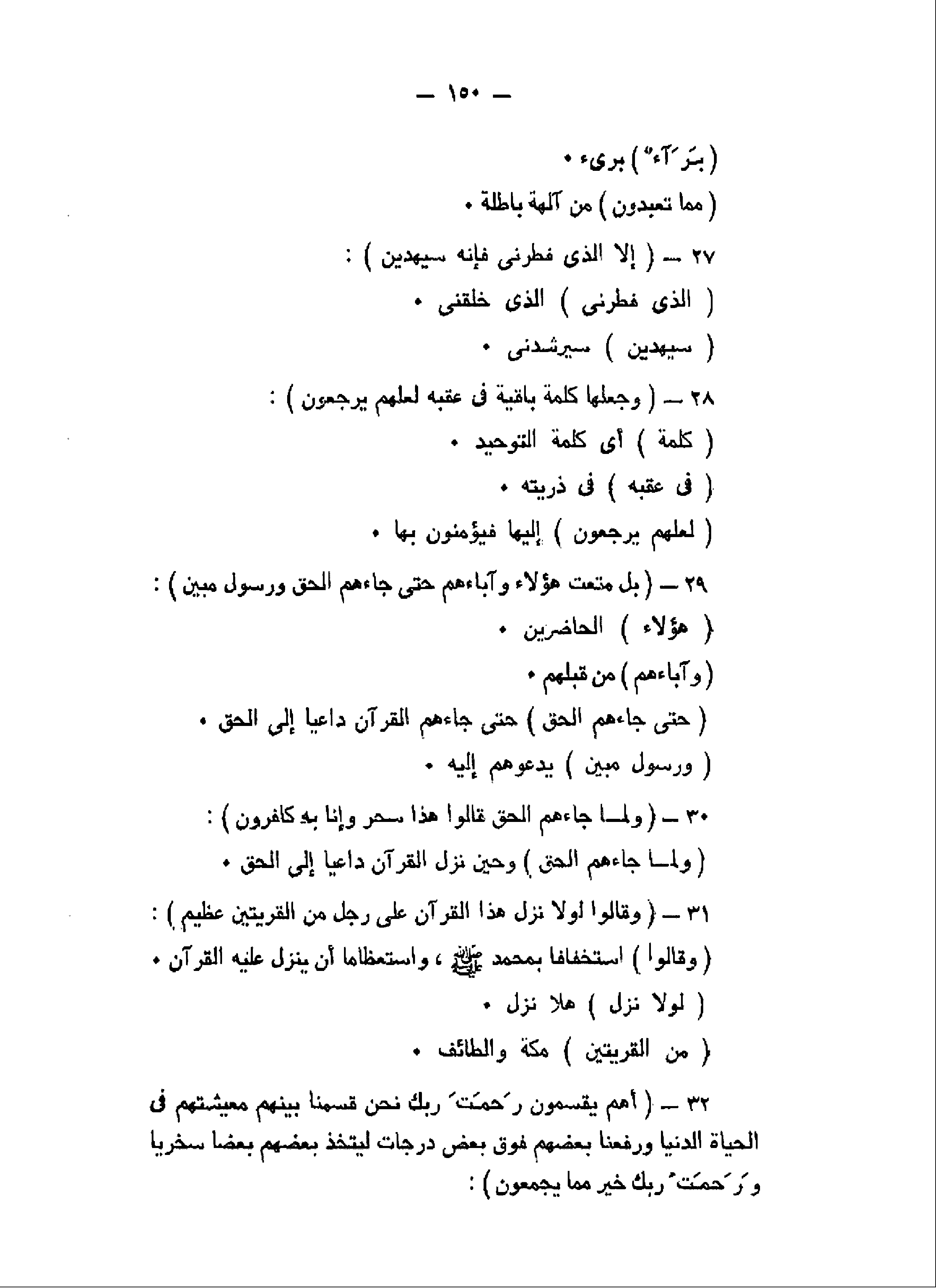 إِلاَّ الَّذِي فَطَرَنِي فَإِنَّهُ سَيَهْدِينِ (27) وَجَعَلَها كَلِمَةً باقِيَةً فِي عَقِبِهِ لَعَلَّهُمْ يَرْجِعُونَ (28) بَلْ مَتَّعْتُ هؤُلاءِ وَآباءَهُمْ حَتَّى جاءَهُمُ الْحَقُّ وَرَسُولٌ مُبِينٌ (29) وَلَمَّا جاءَهُمُ الْحَقُّ قالُوا هذا سِحْرٌ وَإِنَّا بِهِ كافِرُونَ (30) وَقالُوا لَوْلا نُزِّلَ هذَا الْقُرْآنُ عَلى رَجُلٍ مِنَ الْقَرْيَتَيْنِ عَظِيمٍ (31)
