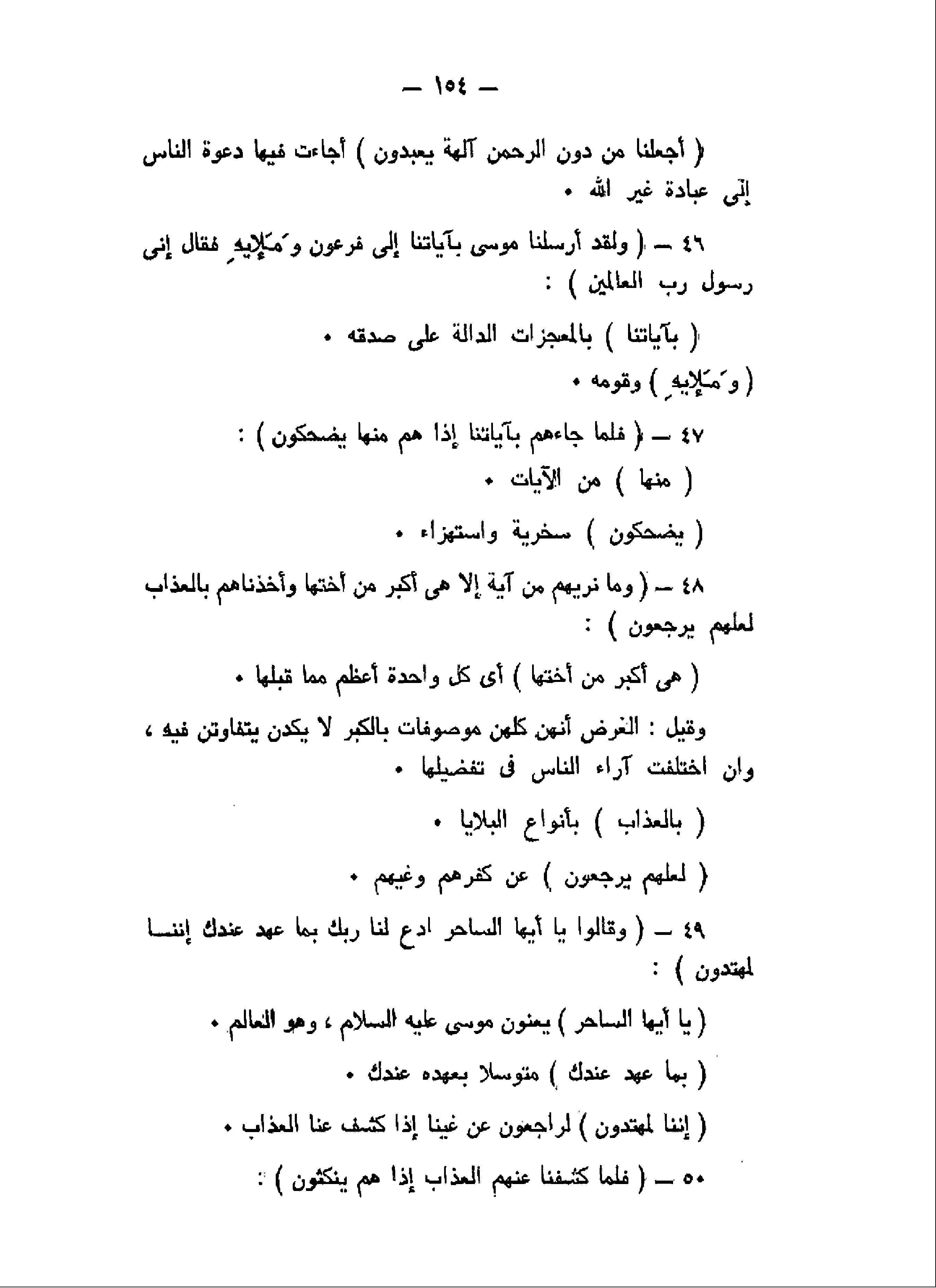 وَلَقَدْ أَرْسَلْنا مُوسى بِآياتِنا إِلى فِرْعَوْنَ وَمَلائِهِ فَقالَ إِنِّي رَسُولُ رَبِّ الْعالَمِينَ (46) فَلَمَّا جاءَهُمْ بِآياتِنا إِذا هُمْ مِنْها يَضْحَكُونَ (47) وَما نُرِيهِمْ مِنْ آيَةٍ إِلاَّ هِيَ أَكْبَرُ مِنْ أُخْتِها وَأَخَذْناهُمْ بِالْعَذابِ لَعَلَّهُمْ يَرْجِعُونَ (48) وَقالُوا يا أَيُّهَا السَّاحِرُ ادْعُ لَنا رَبَّكَ بِما عَهِدَ عِنْدَكَ إِنَّنا لَمُهْتَدُونَ (49) فَلَمَّا كَشَفْنا عَنْهُمُ الْعَذابَ إِذا هُمْ يَنْكُثُونَ (50)