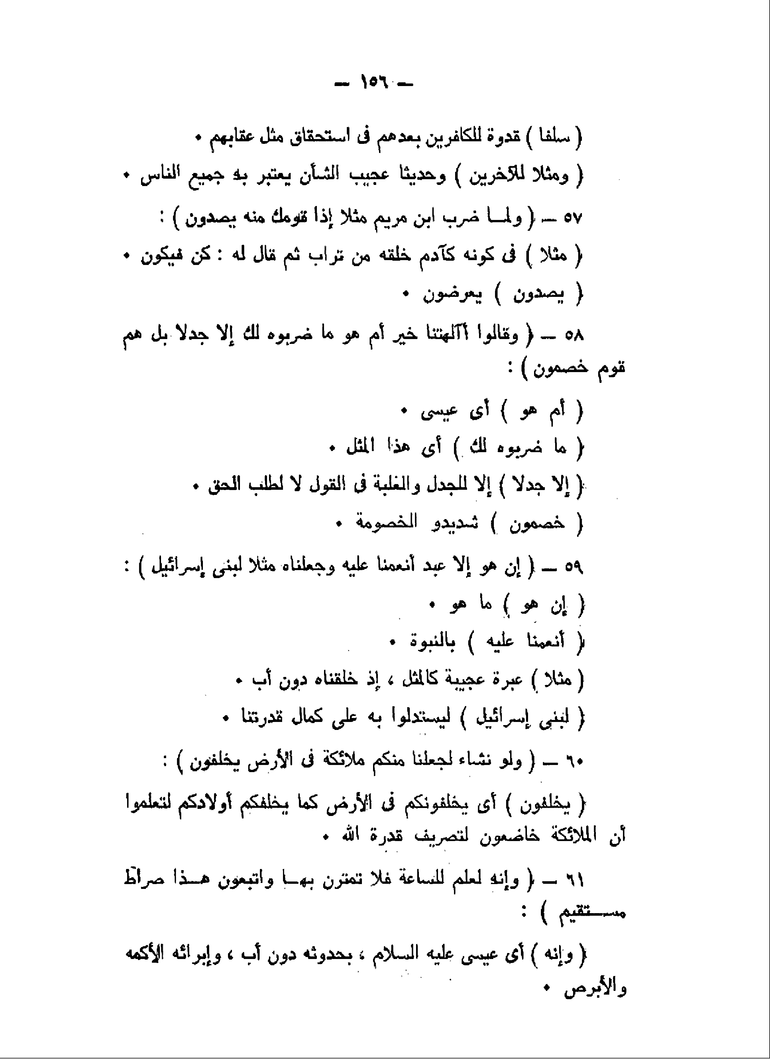 وَلَمَّا ضُرِبَ ابْنُ مَرْيَمَ مَثَلاً إِذا قَوْمُكَ مِنْهُ يَصِدُّونَ (57) وَقالُوا أَآلِهَتُنا خَيْرٌ أَمْ هُوَ ما ضَرَبُوهُ لَكَ إِلاَّ جَدَلاً بَلْ هُمْ قَوْمٌ خَصِمُونَ (58) إِنْ هُوَ إِلاَّ عَبْدٌ أَنْعَمْنا عَلَيْهِ وَجَعَلْناهُ مَثَلاً لِبَنِي إِسْرائِيلَ (59) وَلَوْ نَشاءُ لَجَعَلْنا مِنْكُمْ مَلائِكَةً فِي الْأَرْضِ يَخْلُفُونَ (60) وَإِنَّهُ لَعِلْمٌ لِلسَّاعَةِ فَلا تَمْتَرُنَّ بِها وَاتَّبِعُونِ هذا صِراطٌ مُسْتَقِيمٌ (61)
