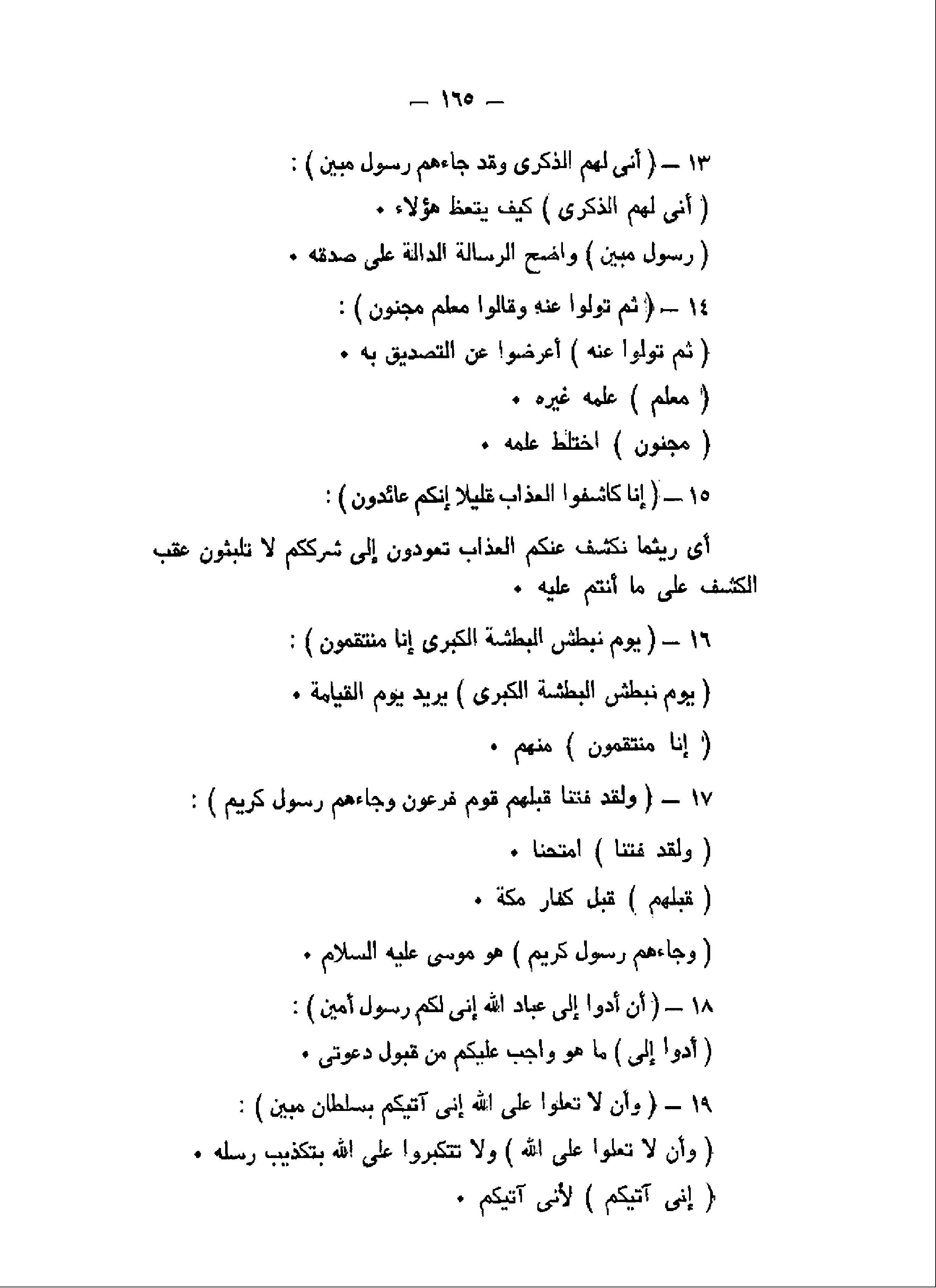 أَنَّى لَهُمُ الذِّكْرى وَقَدْ جاءَهُمْ رَسُولٌ مُبِينٌ (13) ثُمَّ تَوَلَّوْا عَنْهُ وَقالُوا مُعَلَّمٌ مَجْنُونٌ (14) إِنَّا كاشِفُوا الْعَذابِ قَلِيلاً إِنَّكُمْ عائِدُونَ (15) يَوْمَ نَبْطِشُ الْبَطْشَةَ الْكُبْرى إِنَّا مُنْتَقِمُونَ (16) وَلَقَدْ فَتَنَّا قَبْلَهُمْ قَوْمَ فِرْعَوْنَ وَجاءَهُمْ رَسُولٌ كَرِيمٌ (17)